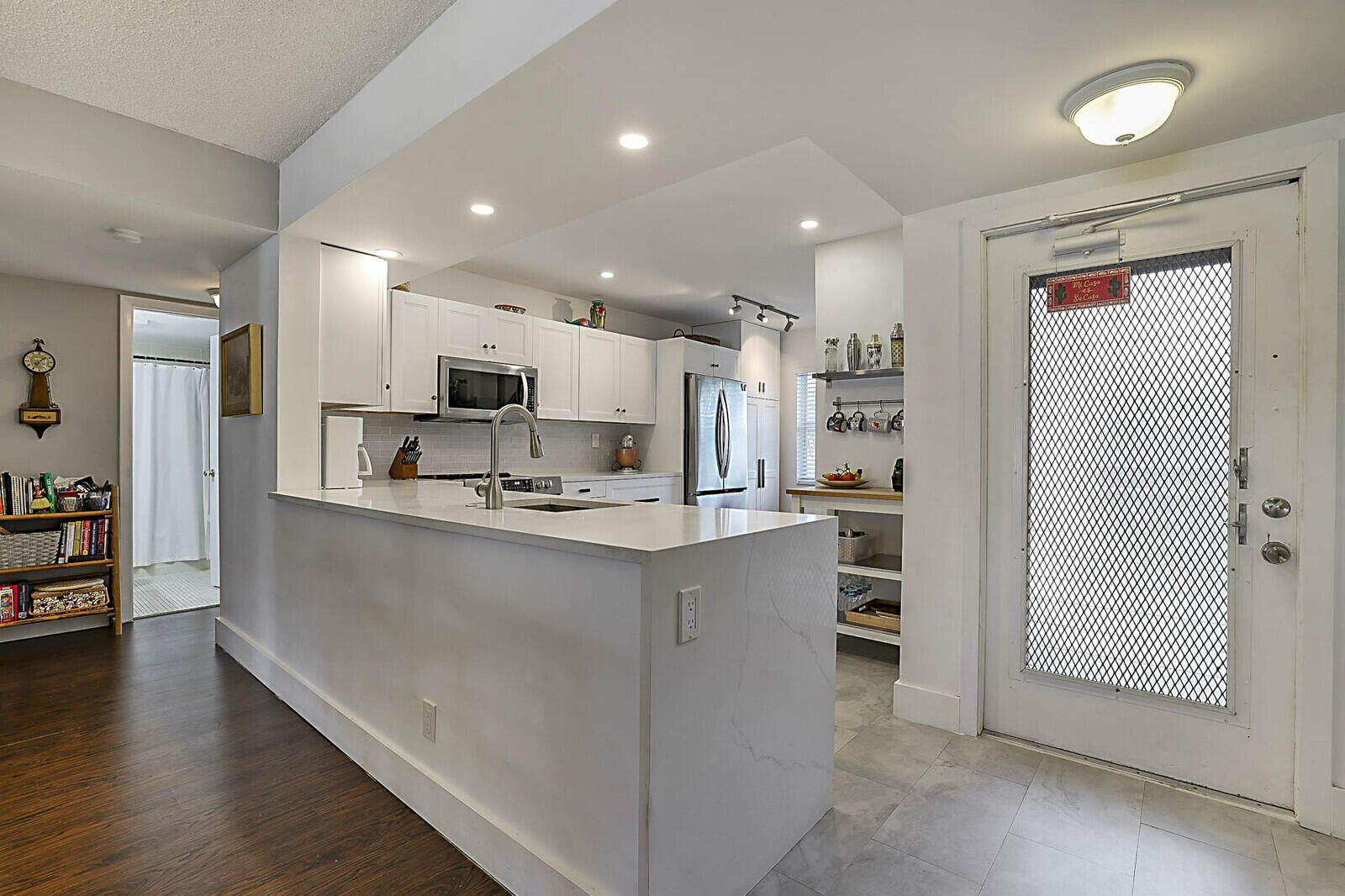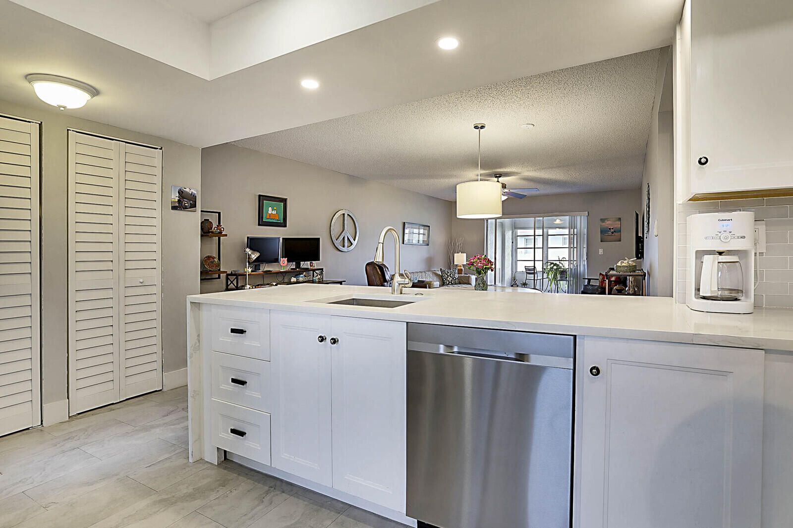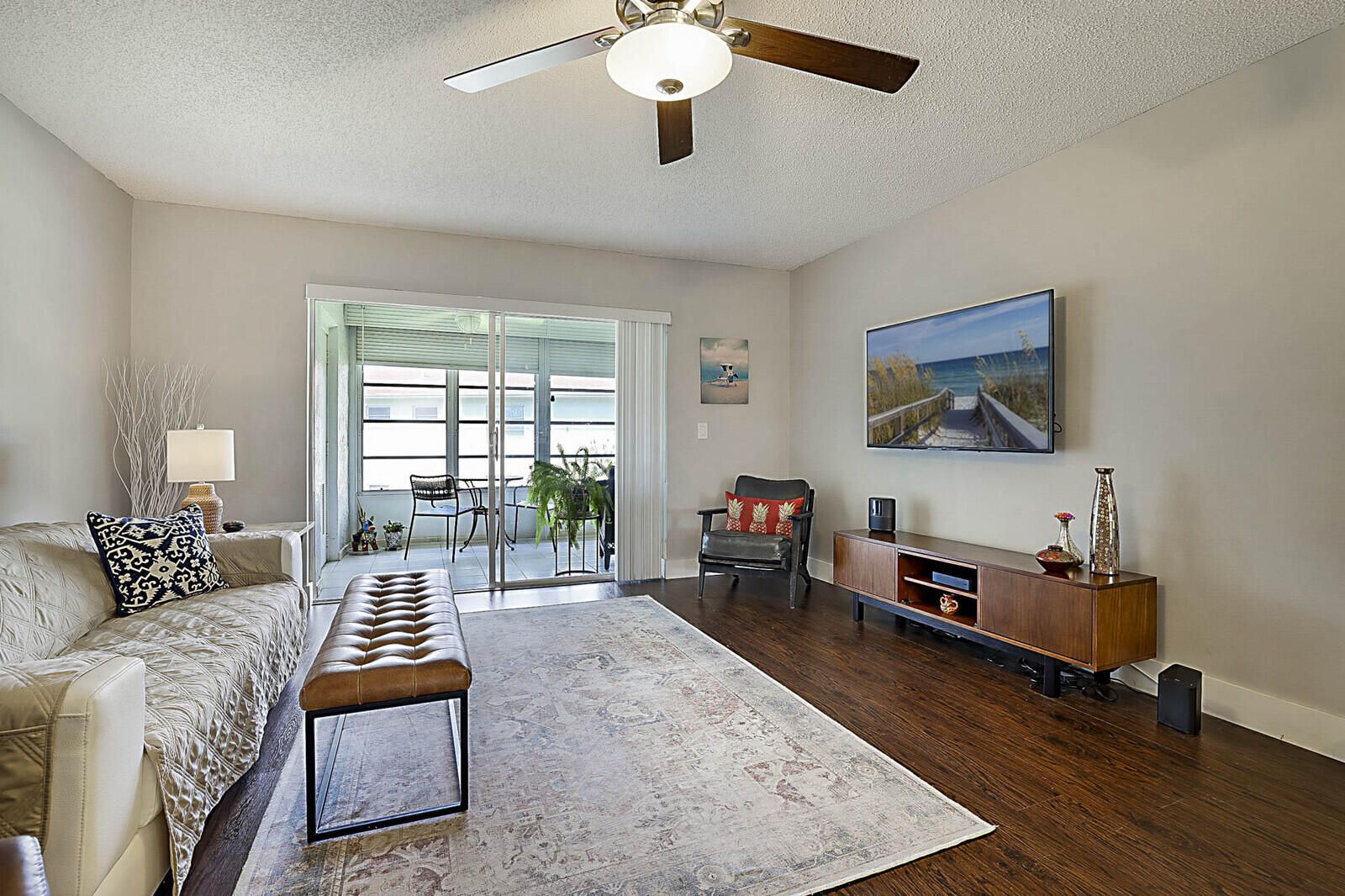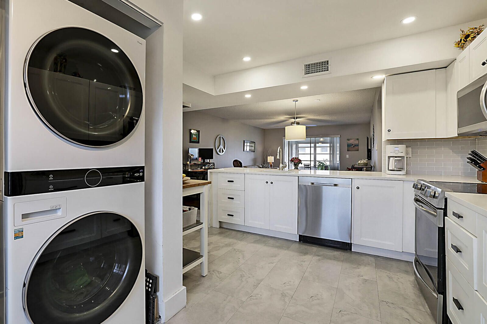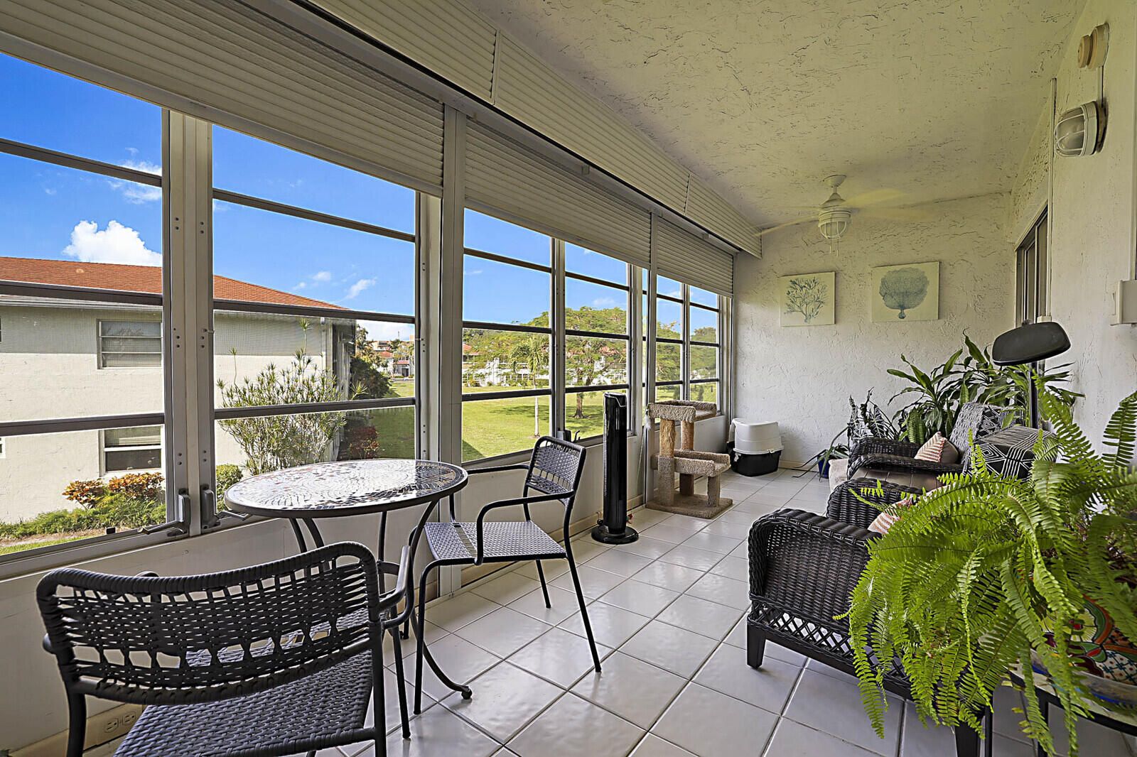 Step into this beautifully updated 55+ condo offering modern style and true peace of mind. Featuring full hurricane-impact windows plus roll-down shutters on the enclosed patio, this home blends comfort and security effortlessly. The updated kitchen shines with quartz countertops with waterfall accent, shaker cabinetry, and stainless-steel appliances, complemented by elegant wood laminate flooring throughout. Enjoy the convenience of a new stackable front-load washer and dryer, updated bathrooms, and a new AC system -- truly move-in ready. The enclosed Florida Room provides valuable bonus living space, perfect for a guest room, home office, or cozy den, all overlooking a peaceful garden view. Residents enjoy resort-style amenities including a pool and spa, fitness center, library, billiard and card rooms, and a ballroom for live entertainment. Conveniently located just minutes from the Florida Turnpike, shopping, dining, and theaters. Cable is included in the maintenance fee, allowing you to simply relax and enjoy life in this vibrant, active community. This is effortless Florida living at its finest -- schedule your showing today!