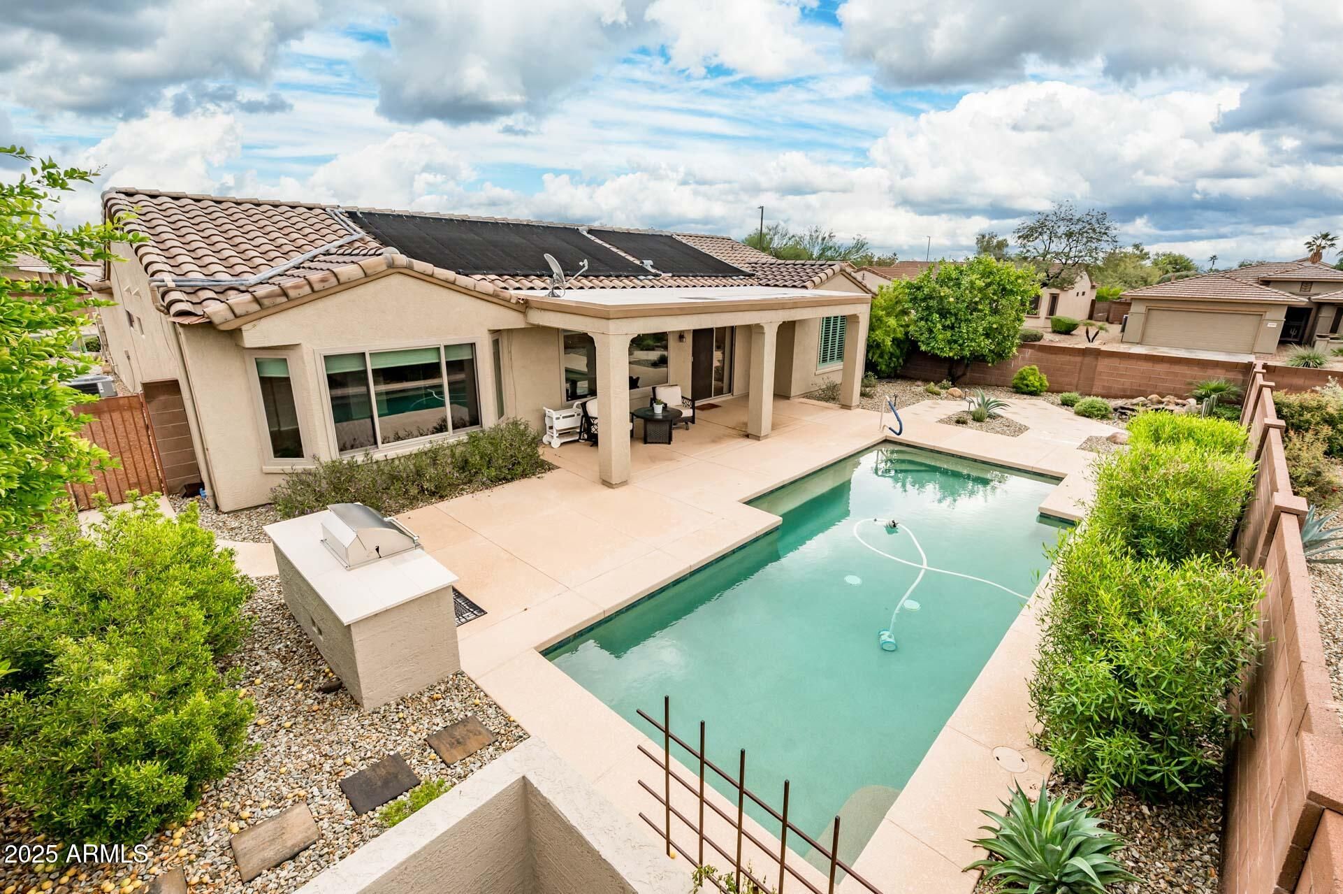Highly desireable Borgata model featuring solar heated lap pool. Situated on a spacious corner lot, this home offers a private walled backyard oasis and a charming front courtyard, ideal for morning coffee or entertaining guests. The bright, split-bedroom floor plan includes all-tile flooring, a new water heater, newer HVAC system, and a 220V outlet in the garage. Located within the prestigious GRAND resort-style community, residents enjoy access to four championship golf courses, tennis and pickleball courts, softball fields, state-of-the-art fitness centers, on-site dining, a wide variety of classes, and more. Experience the best of Arizona living!