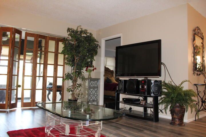 Spacious, updated waterfront villa offers 2 bedrooms, 2 full bathrooms, main bedroom includes 2 closets with a walk-in closet. The kitchen has wood cabinets and sleek black countertops and appliances, formal dining room, and laminate wood floors throughout. Washer /dryer conveniently located inside closet. FL room has hurricane impact windows. Backyard patio is perfect for relaxing and enjoying the peaceful water view. Close to the clubhouse, trash bins and mailboxes. HOA fee includes water, cable, building insurance, lawn care, pest control, exterior maintenance, 24-hour guard gate, and access to several pools, tennis courts, a cafe, billiards, clubhouse 4 events & more. Assigned parking and guest spots are right in front. A small dog or cat is allowed, leasing permitted w restriction