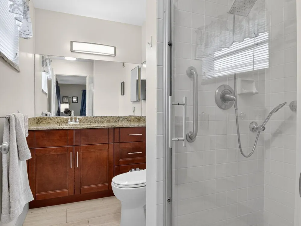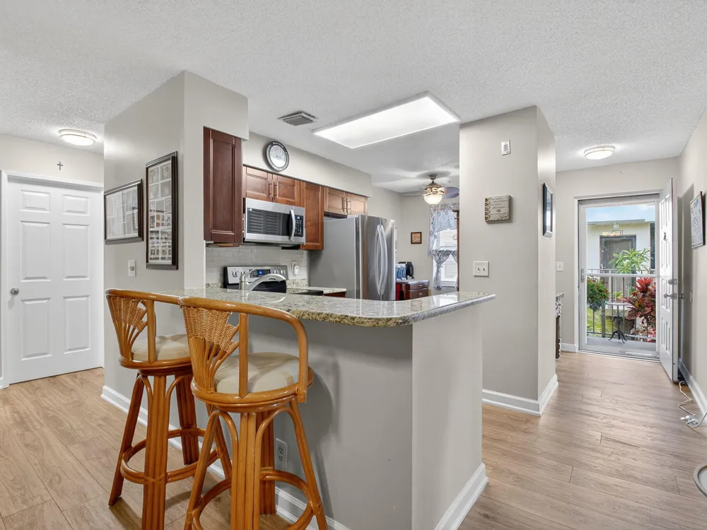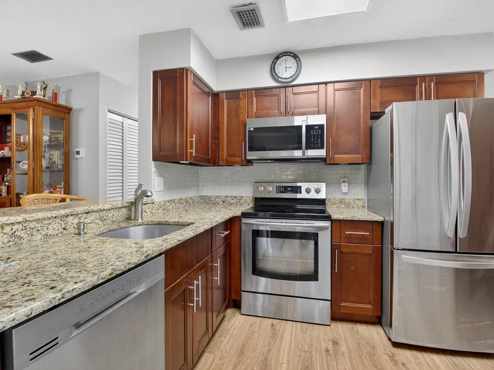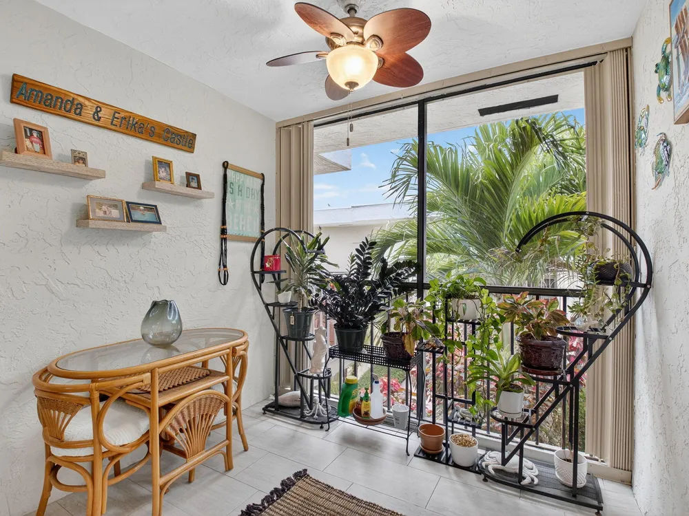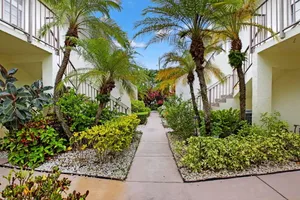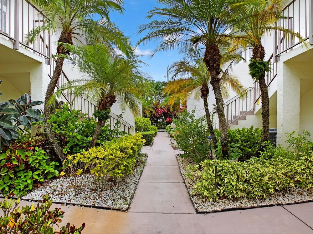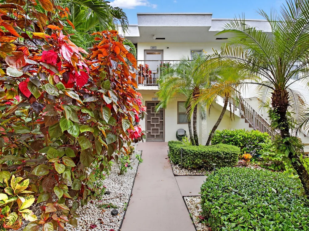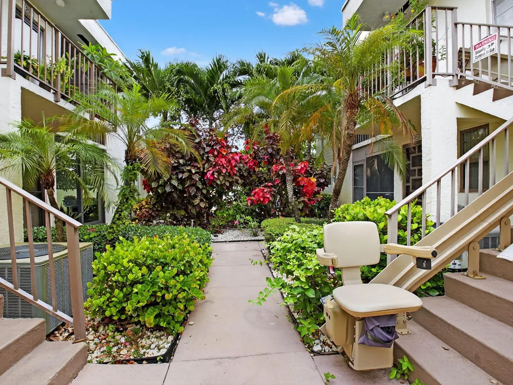 Bright and updated 2-bed, 2-bath corner unit in a 55+ Delray Beach community. Open-concept layout with split bedrooms, granite kitchen, stainless steel appliances, and wood-look floors throughout. Both bathrooms feature granite-topped vanities. Screened and tiled patio with storm shutters overlooks the garden. 2019 A/C, 2022 water heater, and a motorized stair chair lift installed for added convenience. Cable and internet included. Roof replacement (June 2025), gutters (July 2025), and exterior painting (October 2025) are already paid for. Enjoy resort-style amenities at the newly renovated clubhouse, including pools, pickleball, theater, fitness center, and more. Walk to worship and public transit. Just 15 minutes to the beach.