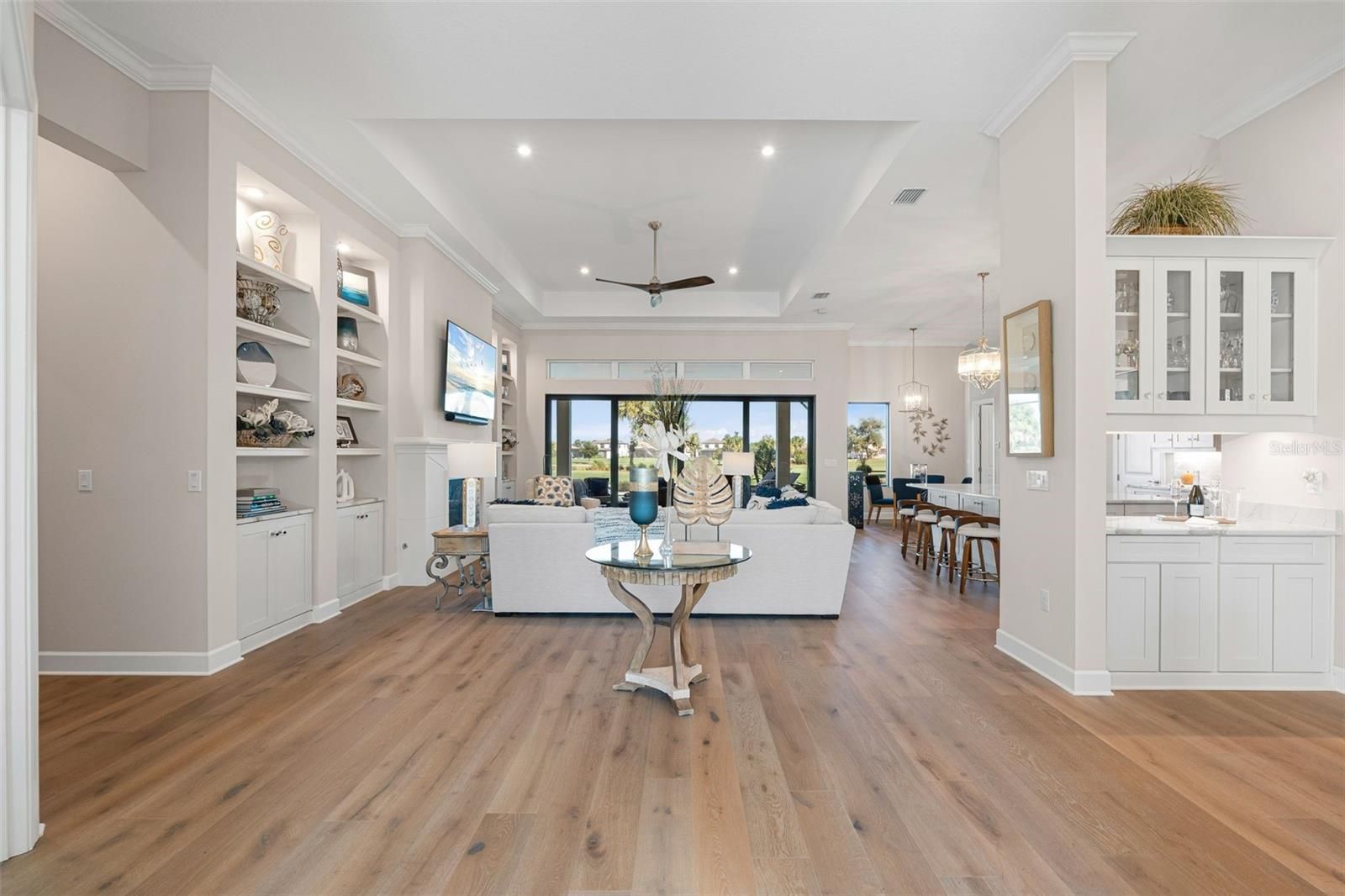 - Built-in Features, Ceiling Fan(s), Crown Molding, High Ceilings, Kitchen/Family Room Combo, Open Floorplan, Main Level Primary, Smart Home, Split Bedrooms, Thermostat, Tray Ceiling(s), Walk-In Closet(s), Window Treatments