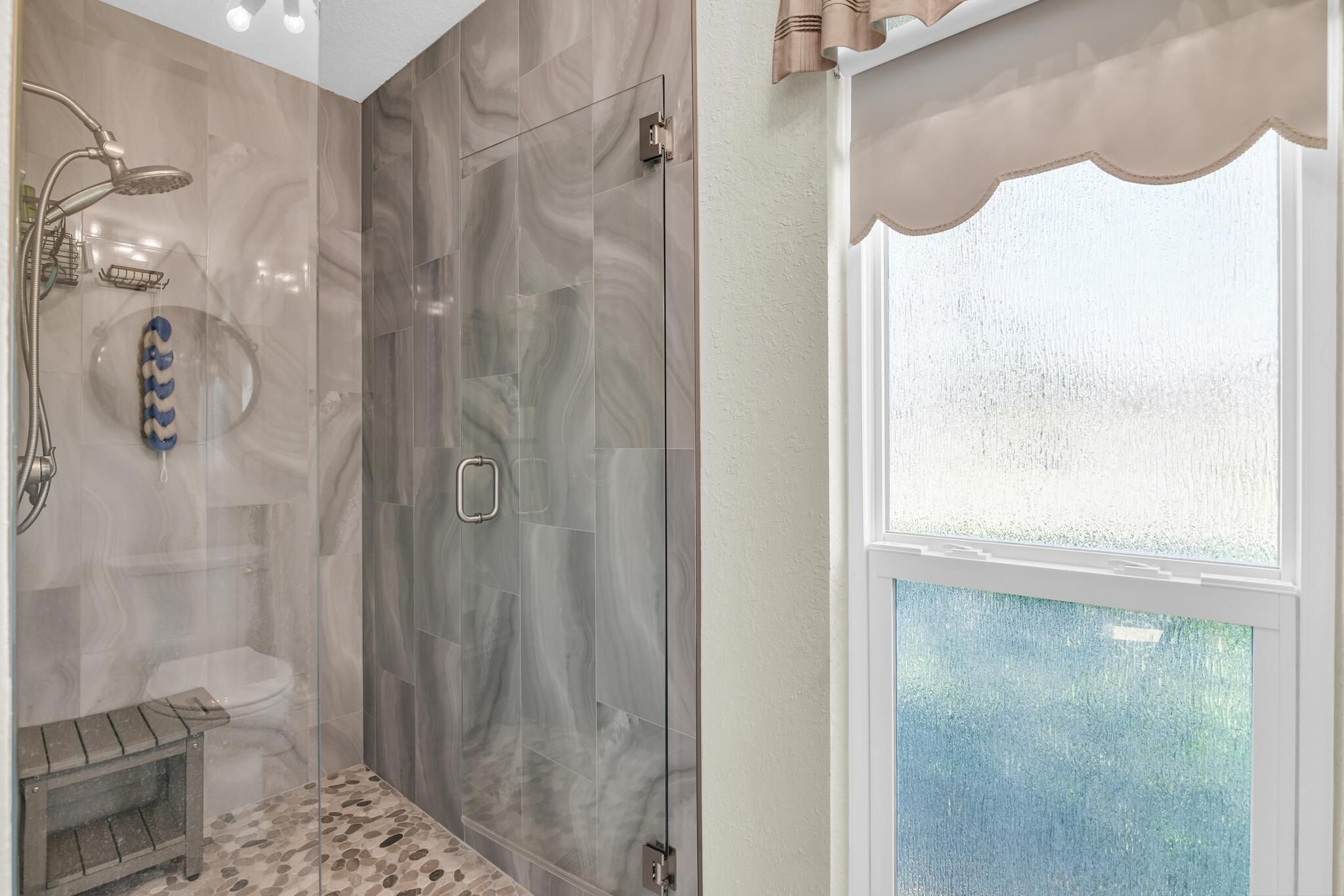 - Built-in Shelving, Entry Level Living Area, Split Bedrooms, Walk-In Closet(s), Storage, Living/Dining Room, Storm Window(s), Impact Glass, Dual Sinks, Primary Downstairs, Separate Shower