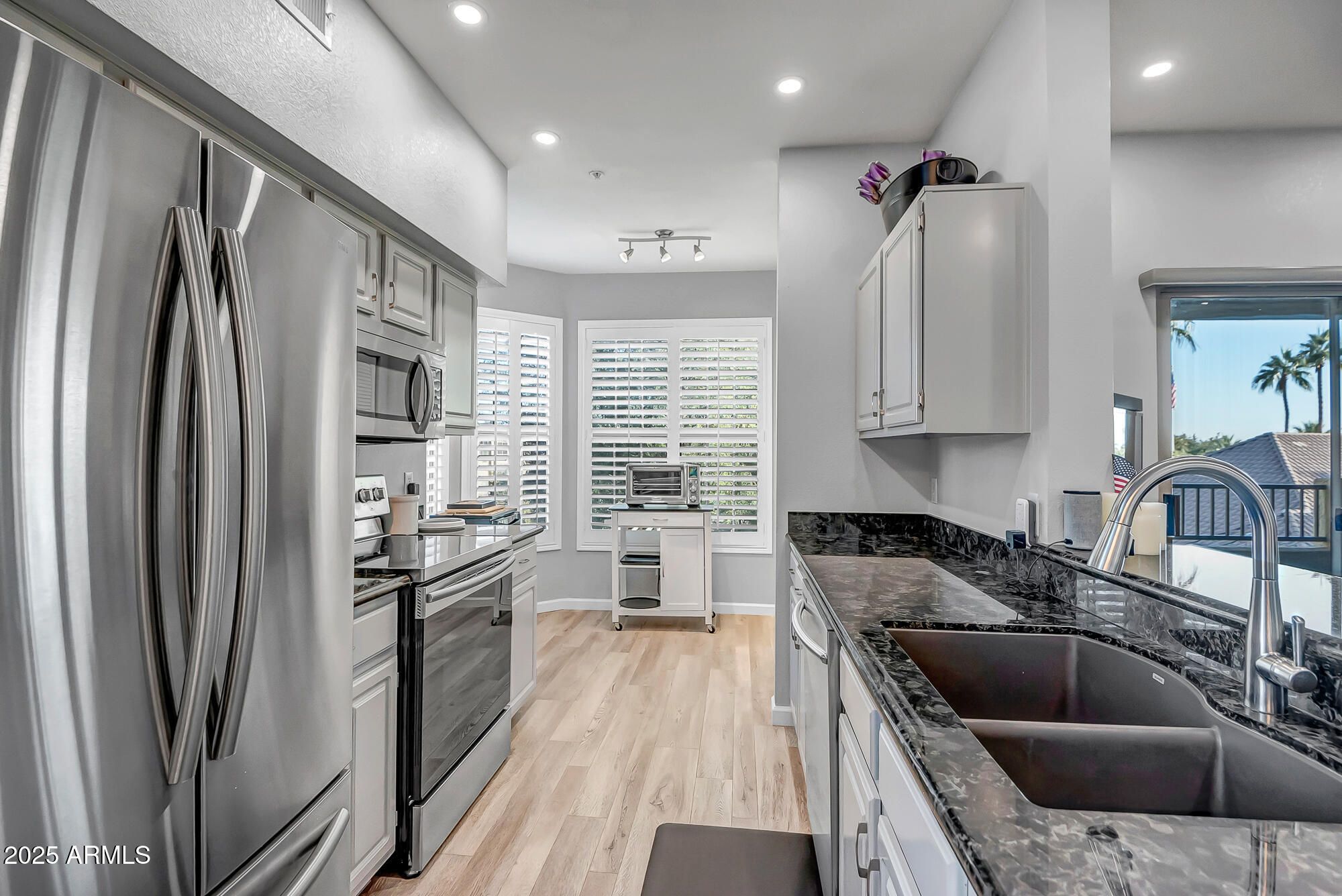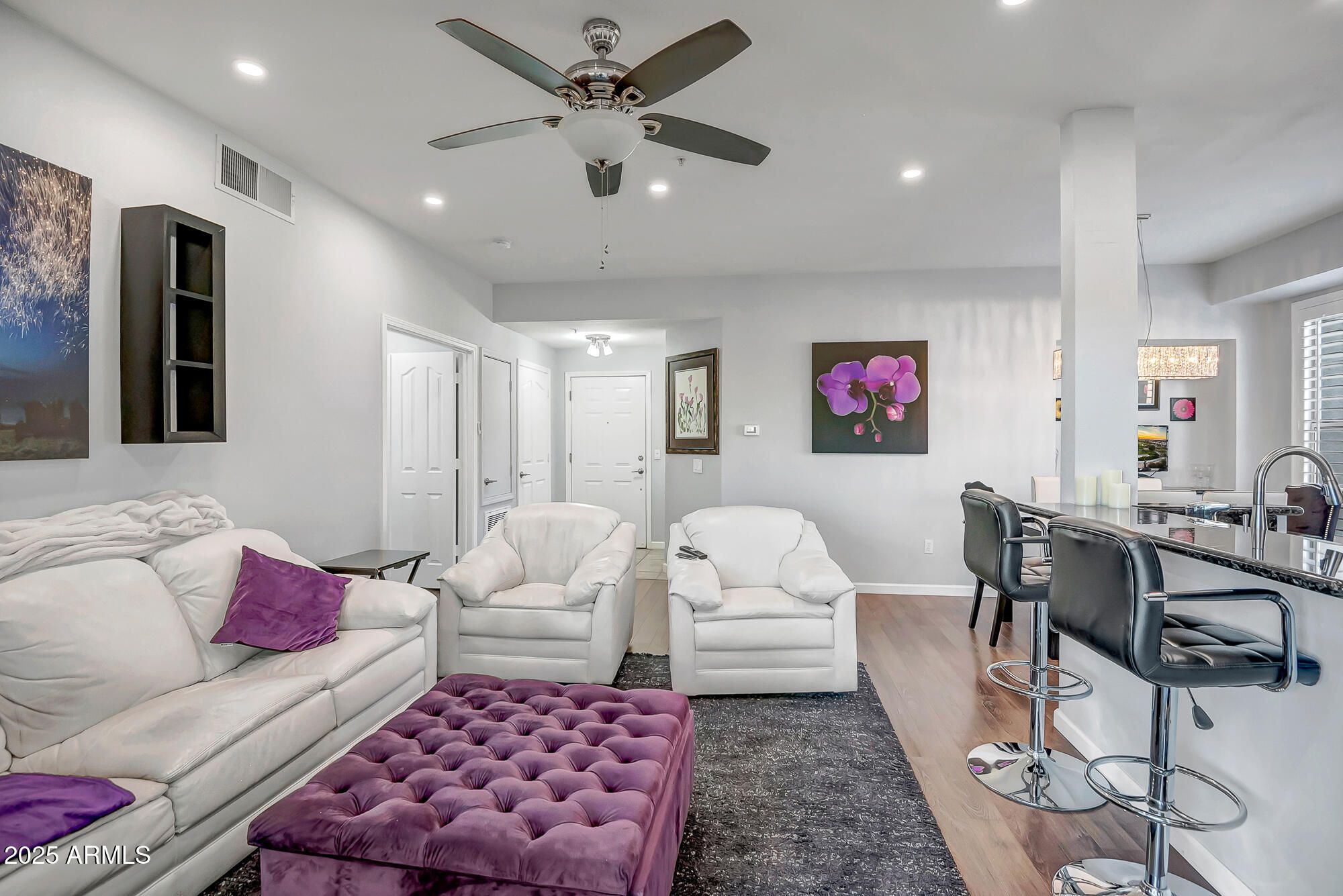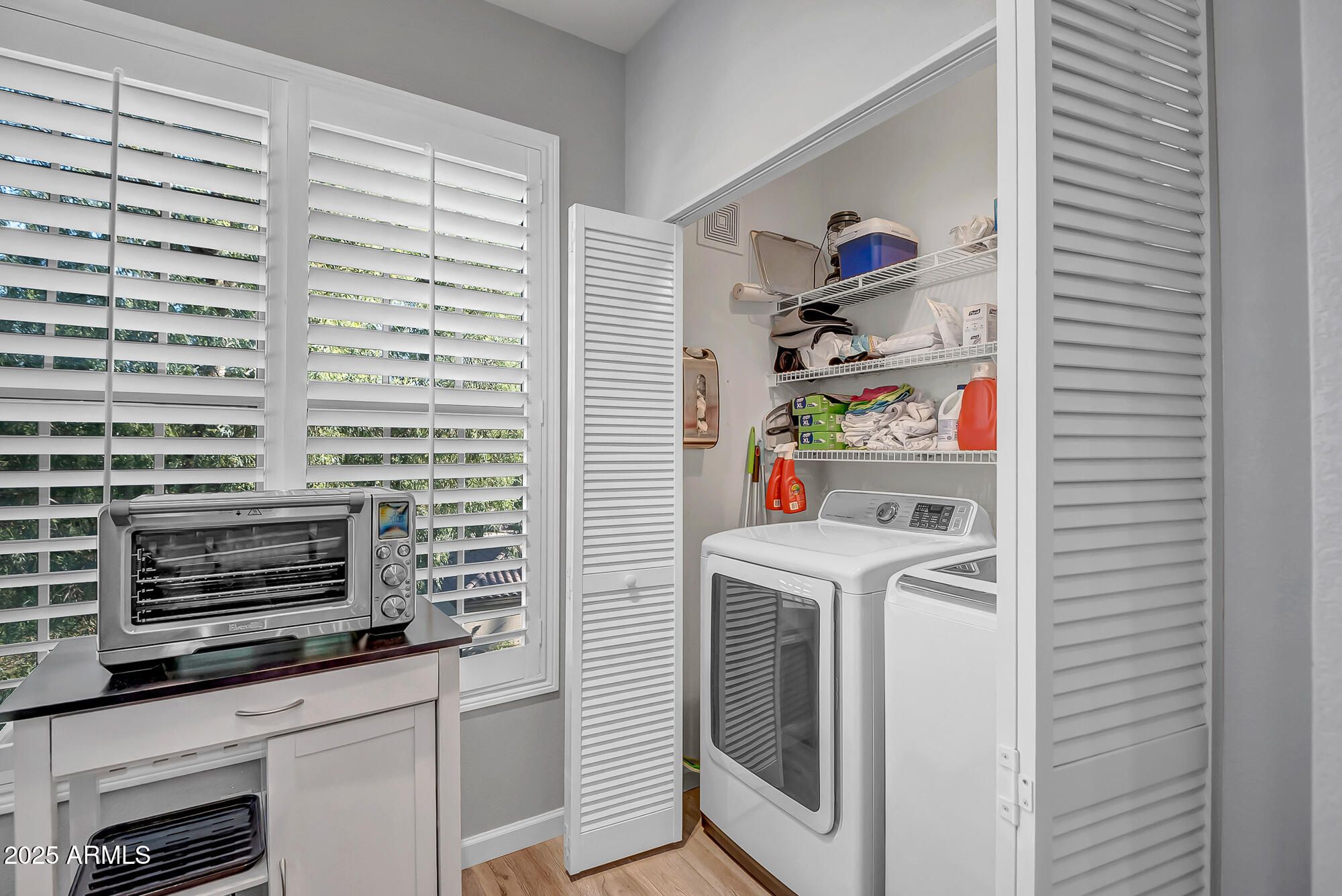 This well-maintained condo offers a bright, functional layout with plantation shutters and thoughtful upgrades designed for easy living. This property is an end unit ideally positioned for quiet living, set back from the pool area and shielded from direct afternoon sun, offering a cooler, more peaceful environment. The primary suite features a double-vanity bathroom and a beautifully designed closet organization system that maximizes storage and efficiency. Low-maintenance living with access to LaSolana's private community with a clubhouse, theater, pool, and more! Owners also get full access to Sun City Grand's resort-style amenities including golf courses, pools, fitness centers, clubs, and a full social calendar! Don't miss this one.