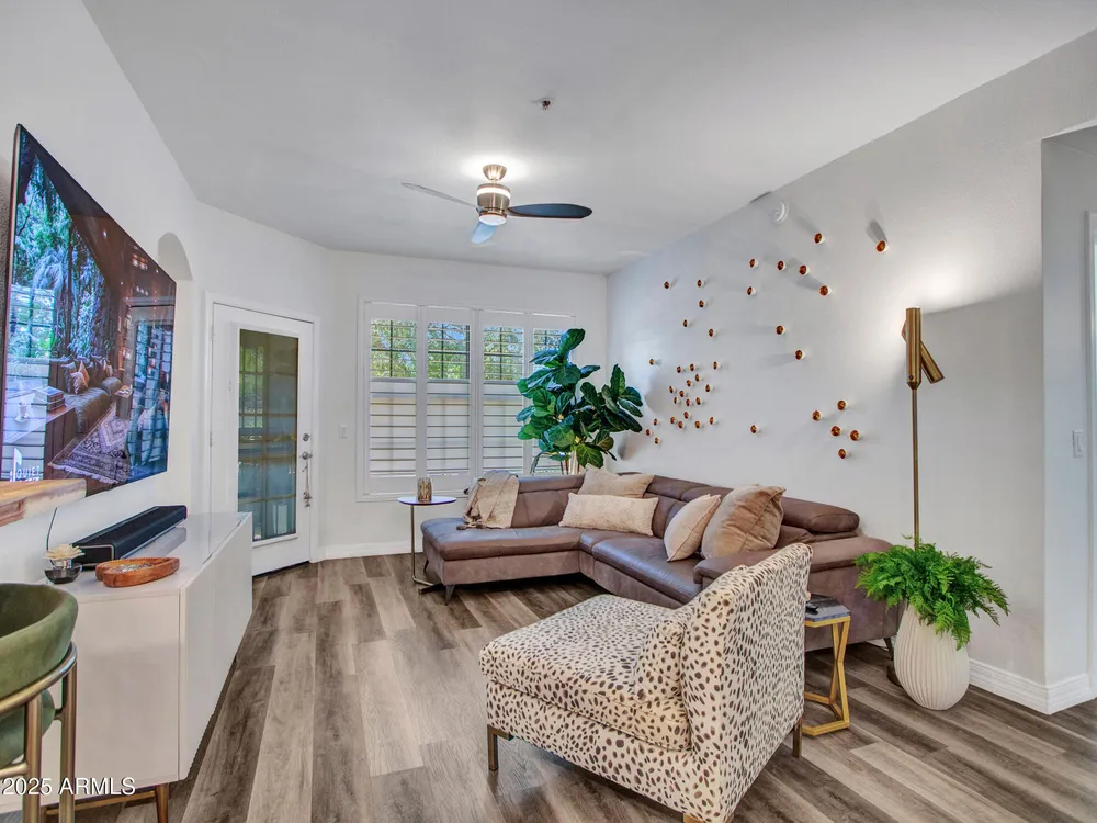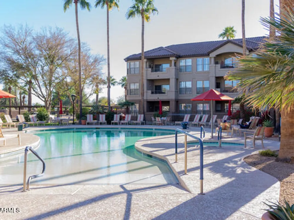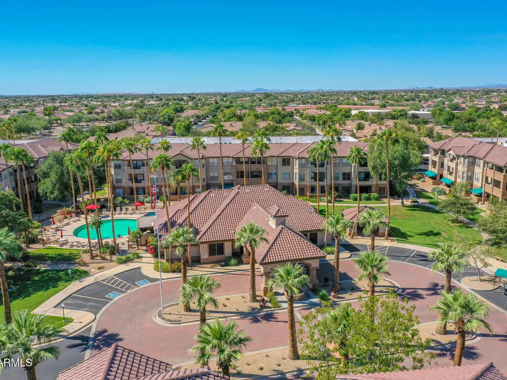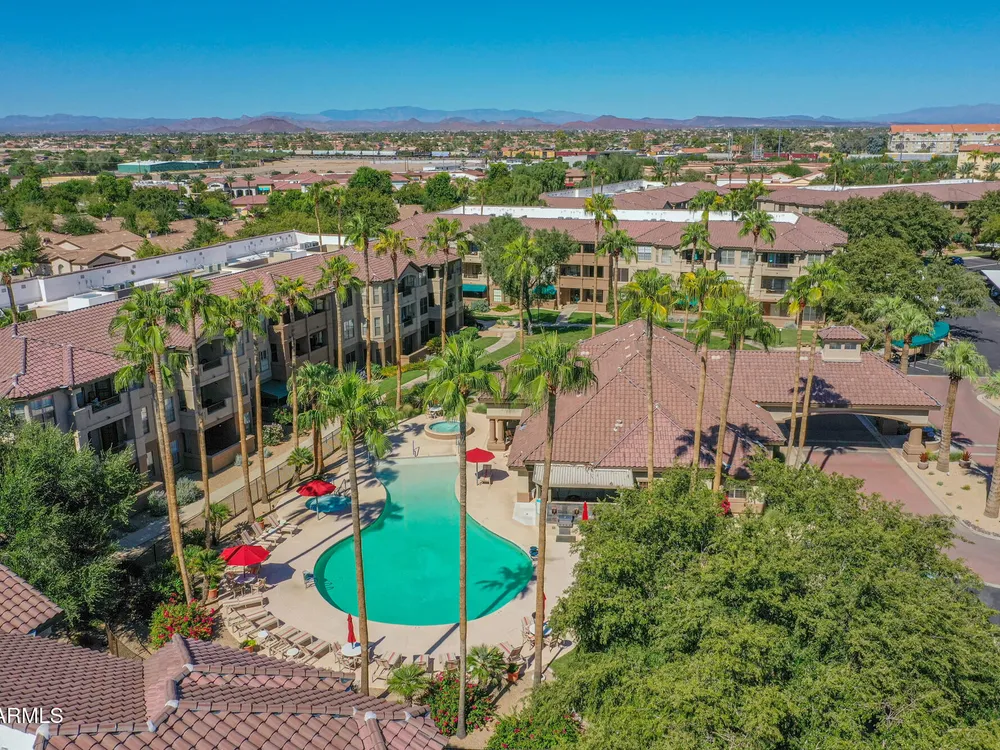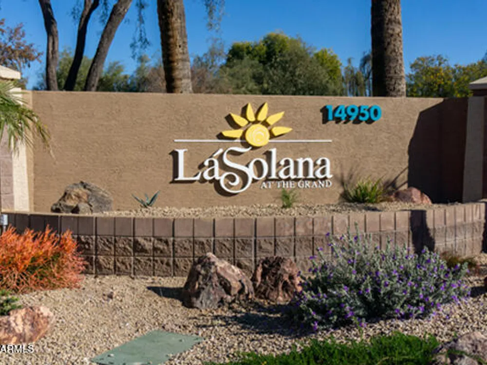 Discover effortless condo living at La Solana in The Grand, a premier 45+ community. This beautifully upgraded first-floor home features luxury vinyl flooring throughout, plantation shutters, and a modern kitchen with quartz counter tops, stainless steel appliances, back splash, and under-cabinet lighting. Enjoy resort-style amenities just steps away—only a 2-minute walk to the heated pool and clubhouse! Convenient carport parking plus powered golf cart space. With access to golf, fitness, clubs, and countless social activities, this La Solana condo offers the perfect blend of style, comfort, and active living in one of the Valley's most sought-after age-restricted communities. Water Heater (2018)
