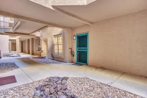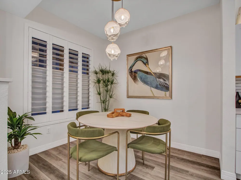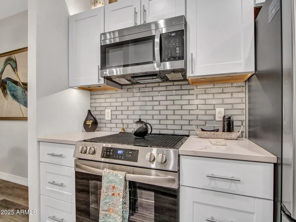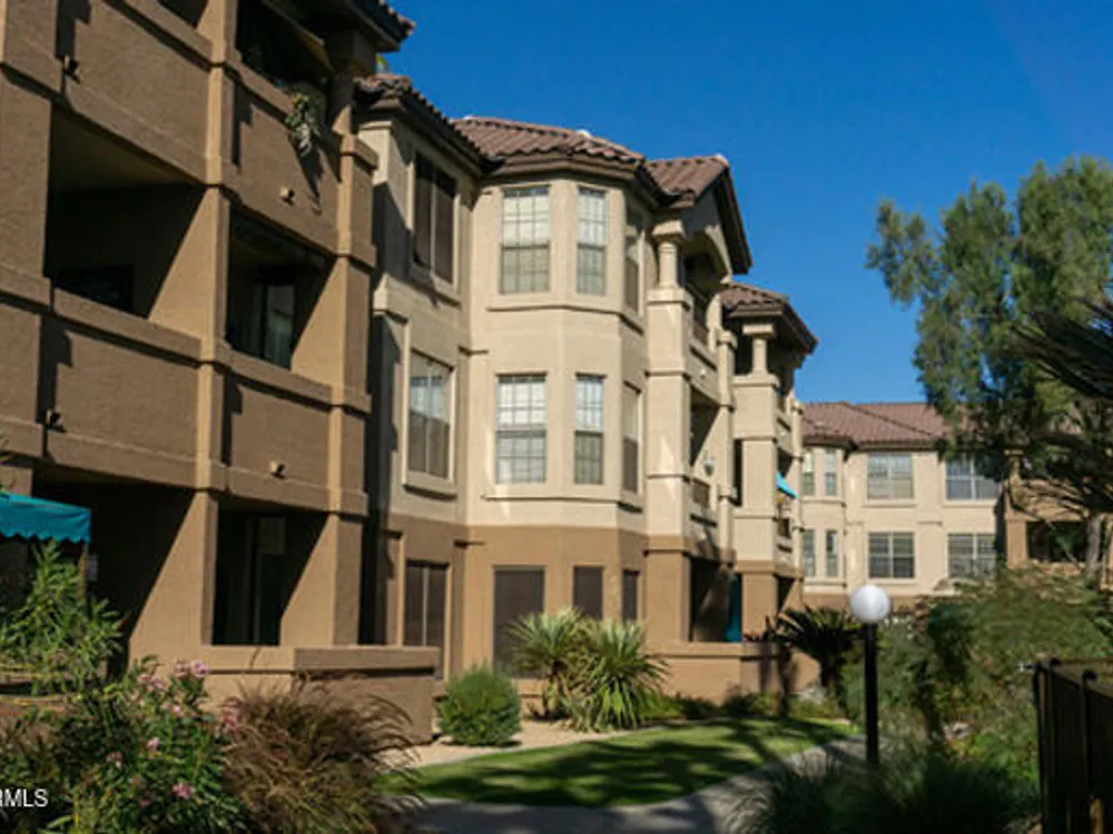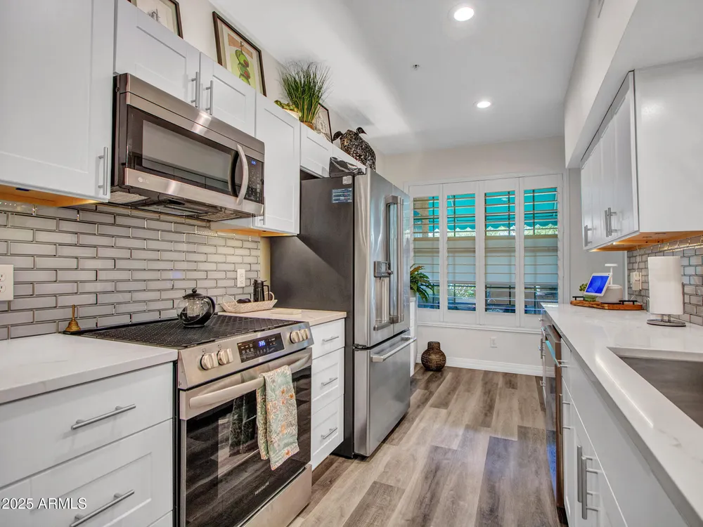 Discover effortless condo living at La Solana in The Grand, a premier 45+ community. This beautifully upgraded first-floor home features luxury vinyl flooring throughout, plantation shutters, and a modern kitchen with quartz counter tops, stainless steel appliances, back splash, and under-cabinet lighting. Enjoy resort-style amenities just steps away—only a 2-minute walk to the heated pool and clubhouse! Convenient carport parking plus powered golf cart space. With access to golf, fitness, clubs, and countless social activities, this La Solana condo offers the perfect blend of style, comfort, and active living in one of the Valley's most sought-after age-restricted communities. Water Heater (2018)