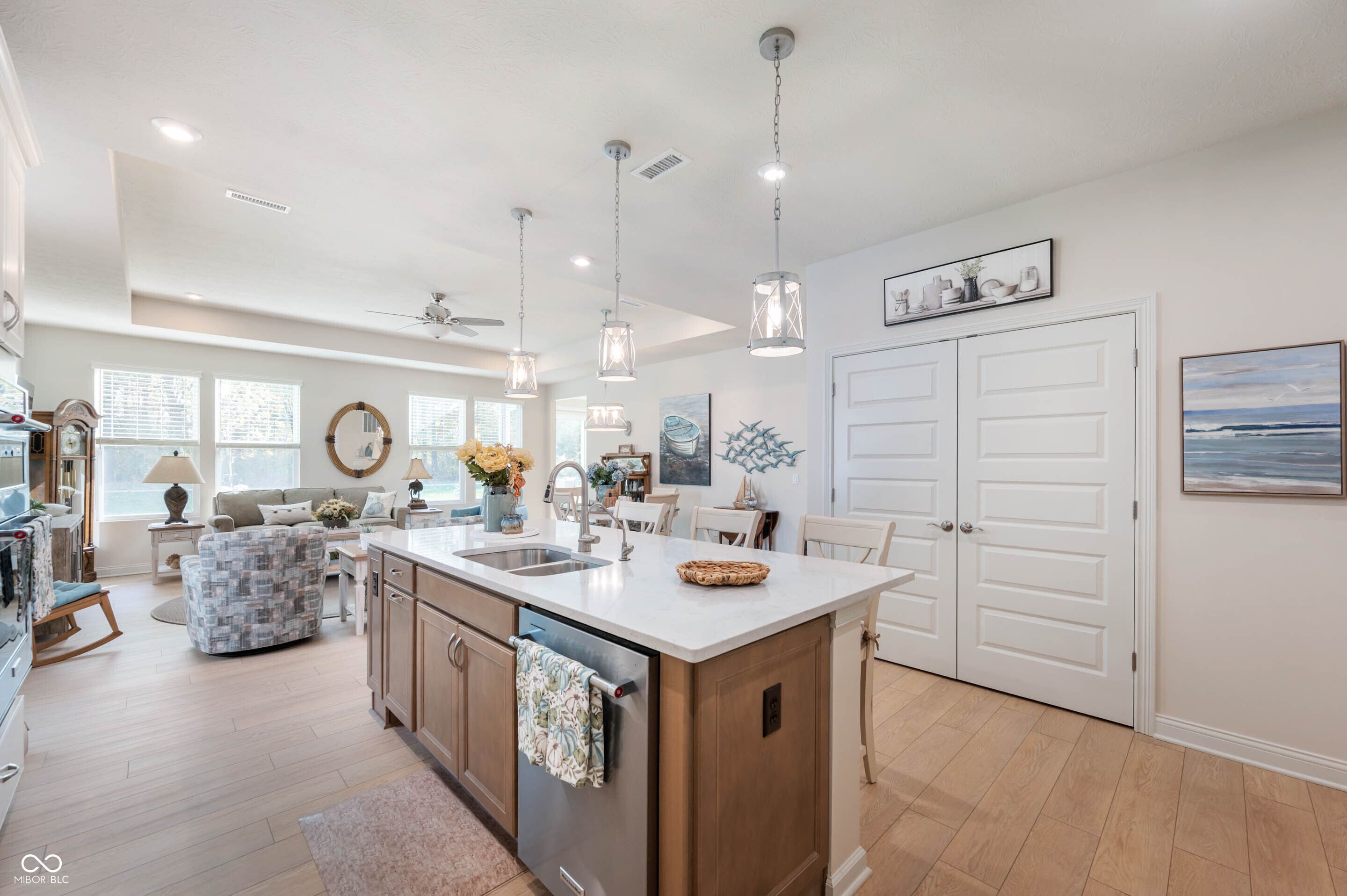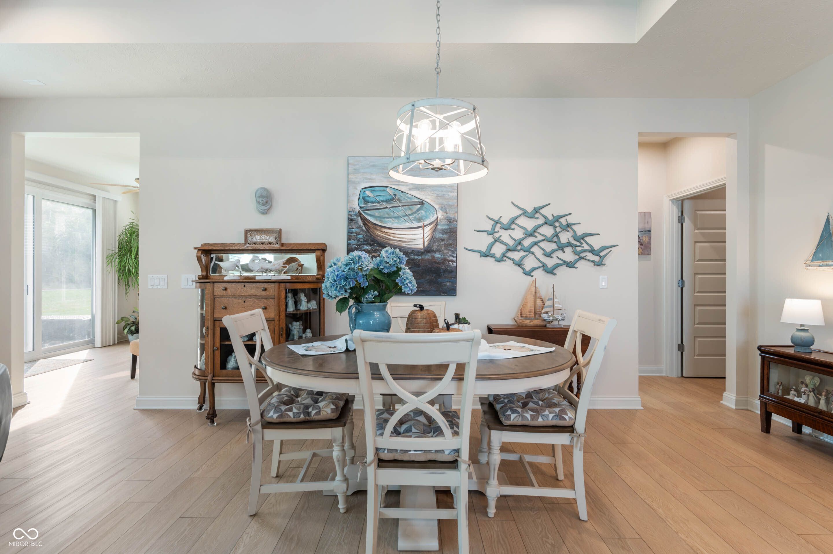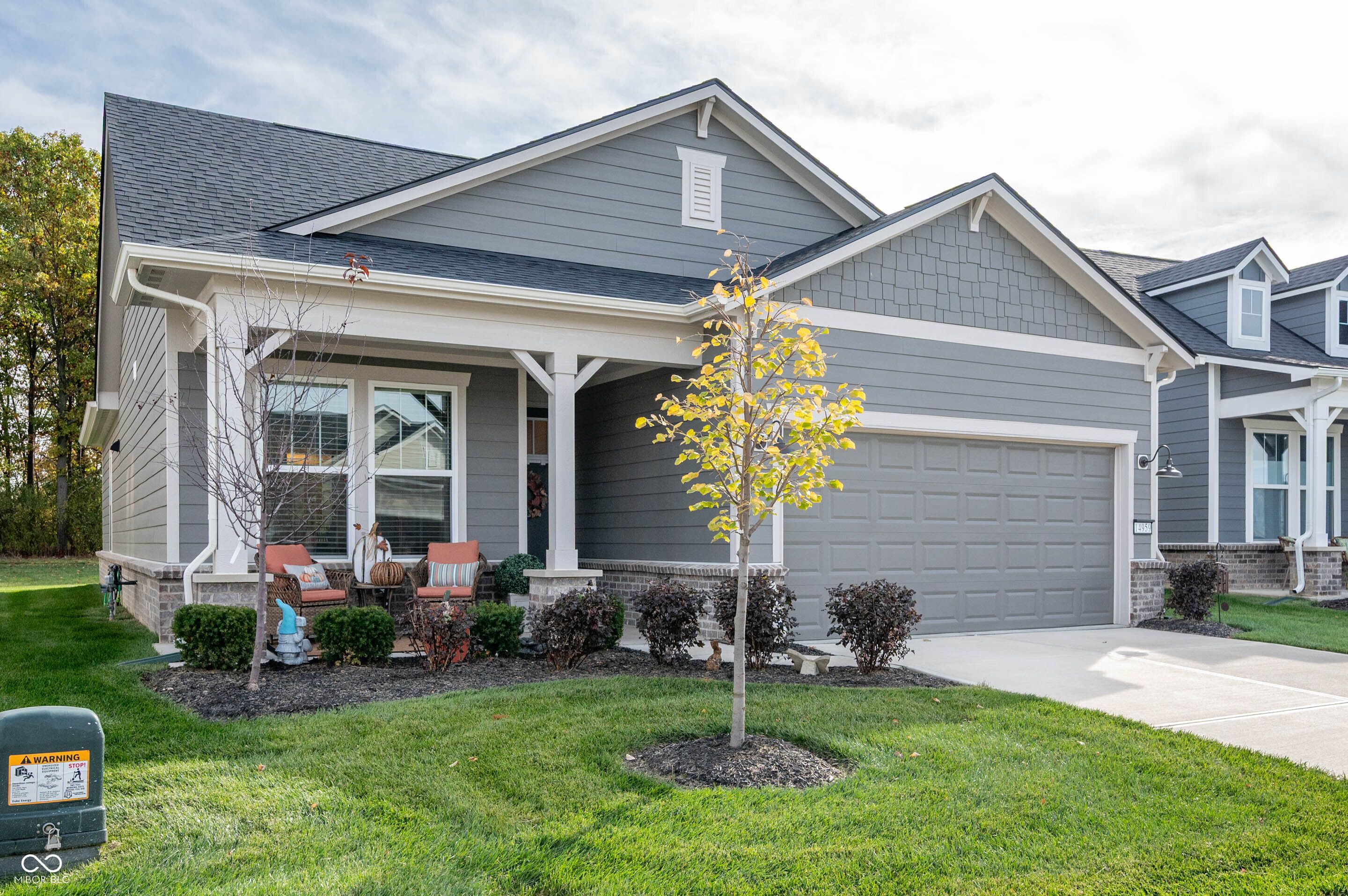 Discover unparalleled low maintenance living in this stunning, like new, Westfield home that backs up to a tree line providing privacy and great scenery from your well-lit Sunroom with patio and easy access to a walking path. Perfectly situated north of Carmel, this home was built in 2024 and offers a low-maintenance, 55+ lifestyle with upgrades throughout and upgraded brick wrap around the home. Features included a large Gathering Room with Tray Ceiling, upgraded kitchen with 42" soft-close cabinets, quartz counters, stainless appliances, electric cooktop with hood vent, built-in oven and microwave, reverse osmosis system and a kitchen island perfect for conversations while cooking and entertaining. Garage has finished, insulated walls, epoxy floor and a 4 ft extension providing great storage space. The home has luxury vinyl plank in the main living spaces and carpet in bedrooms. Kimblewick amenities include indoor/outdoor pools, fitness center, pickleball, dog parks, walking trails, a vibrant social calendar and more! HOA dues include community internet and cable. It's more than a home, it's an invitation to an active, engaging and carefree lifestyle.