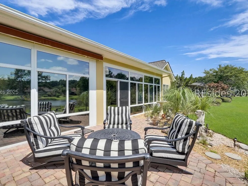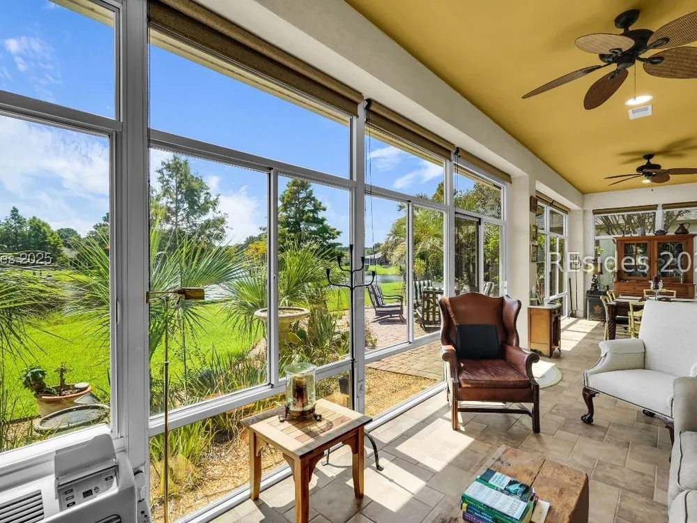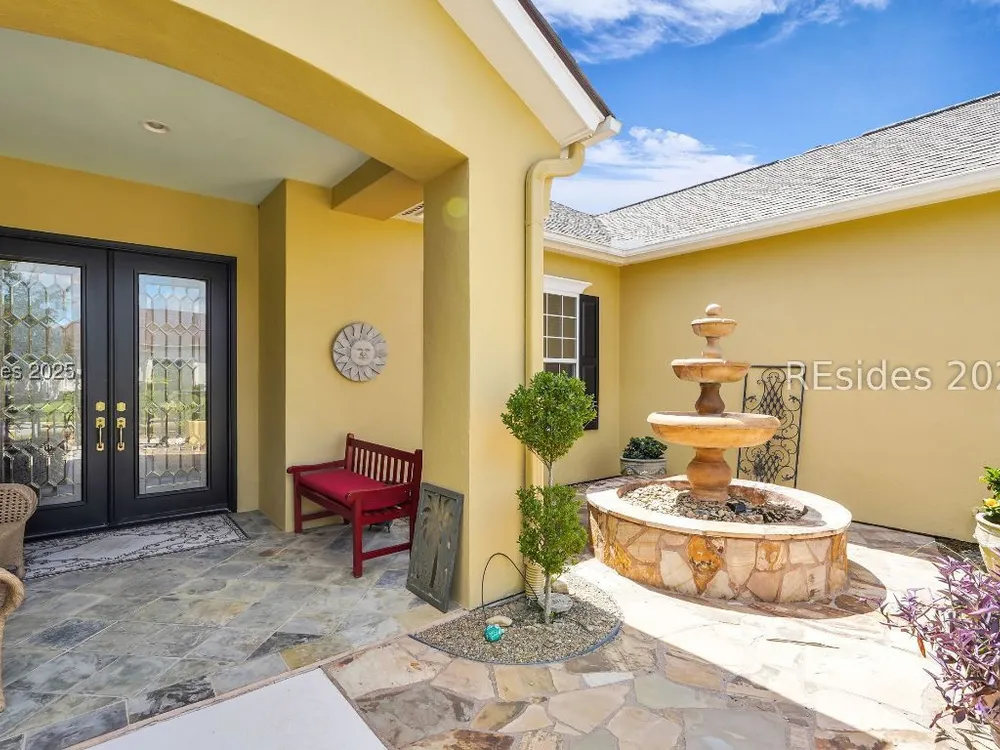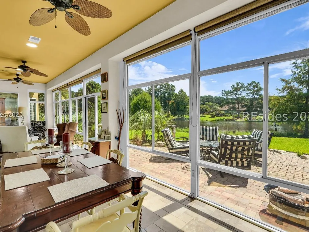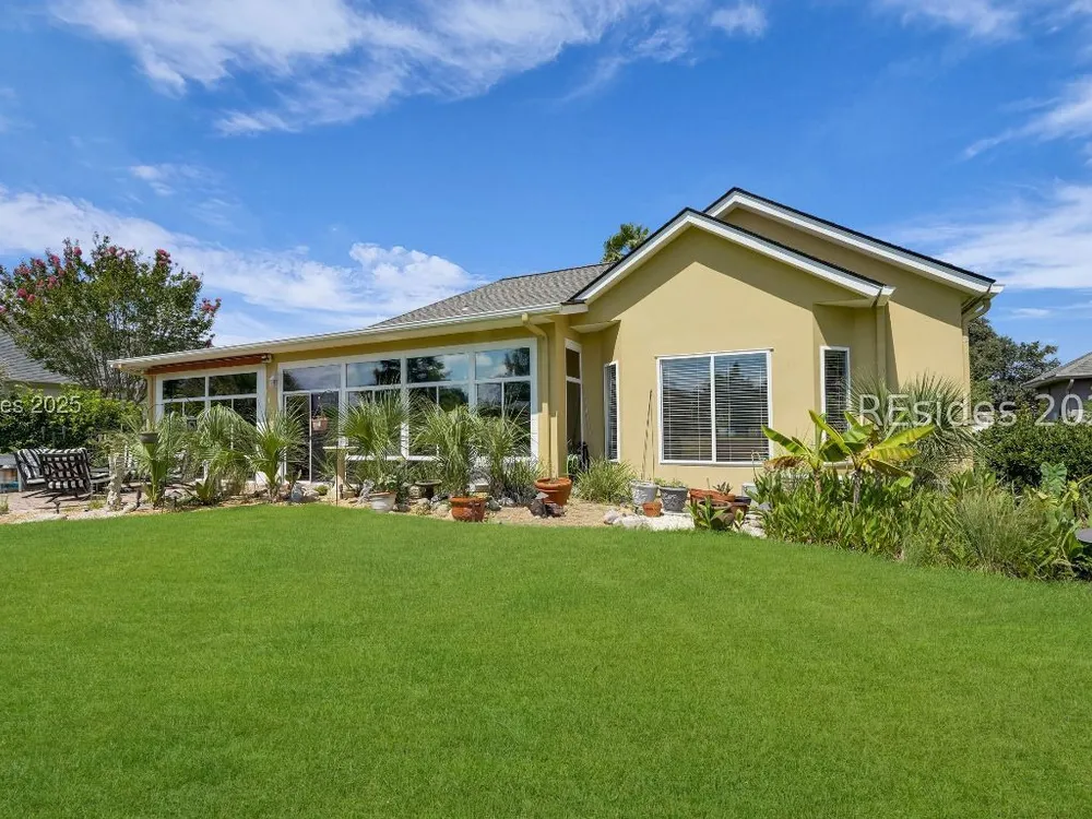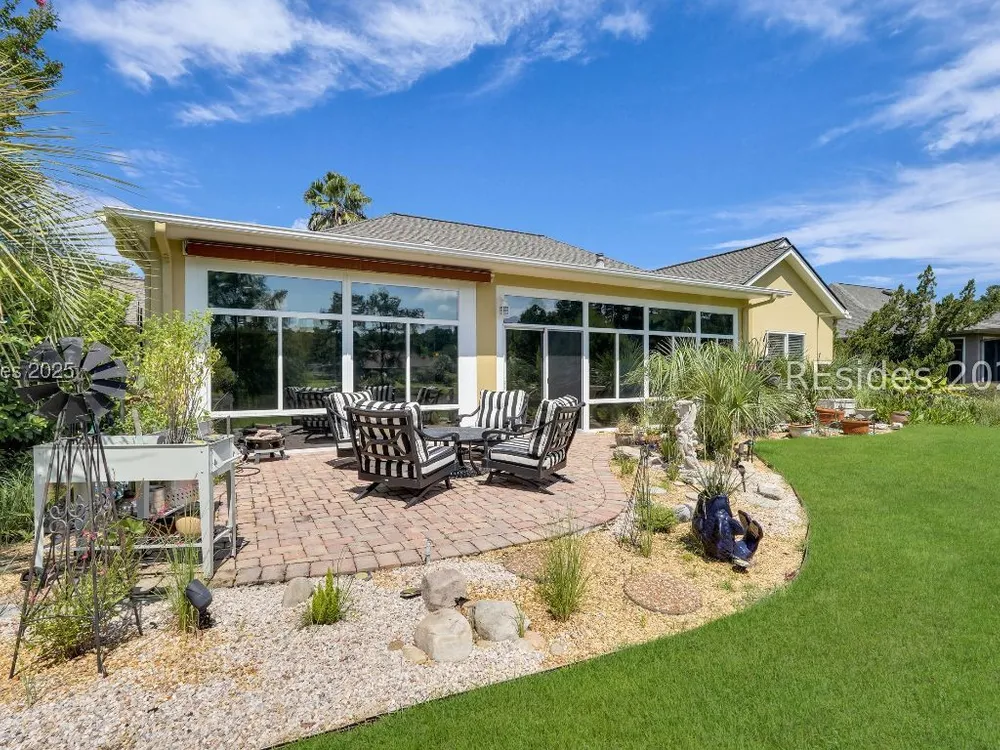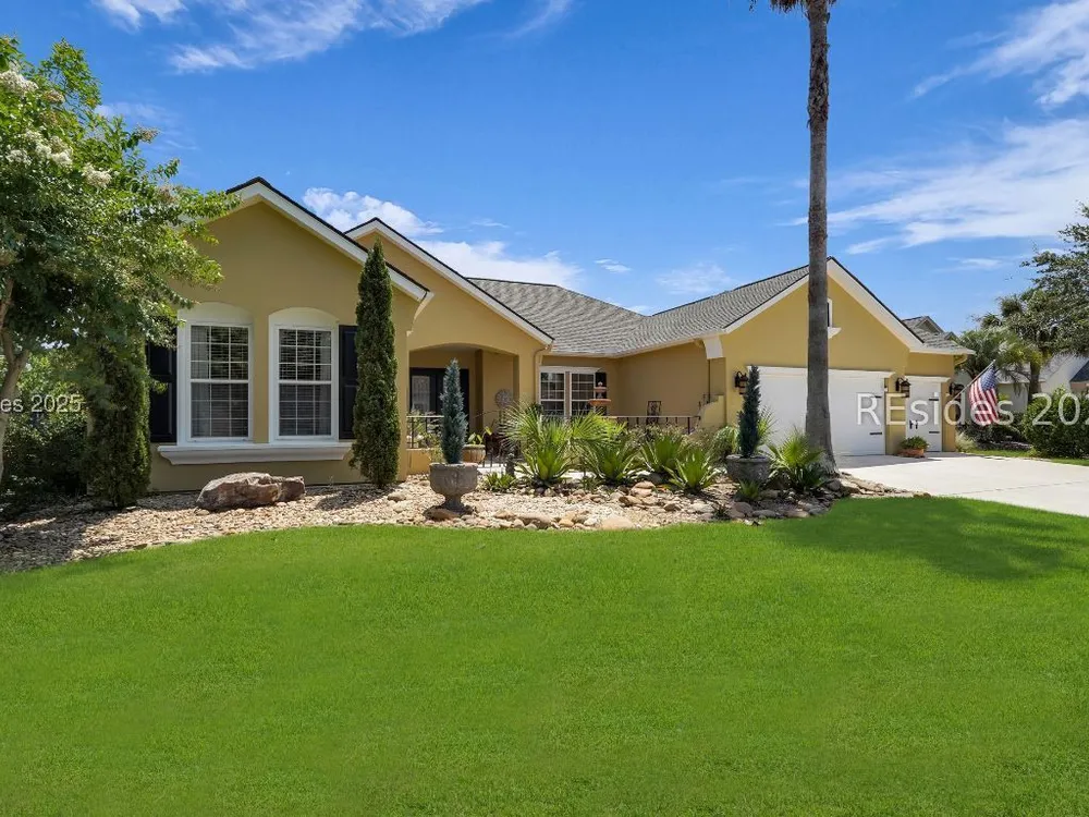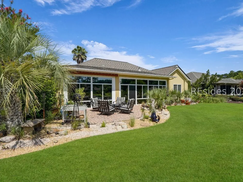 Lowcountry living amplified in this exquisite, rarely available Yellowstone model - one of Sun Citys most sought-after designs! This beautifully appointed 2800 sq ft. 2 Bedroom, 2.5 Bath home with an additional Office/Den, 3-car garage plus climatized workspace is perfectly positioned near the end of a quiet cul-de-sac road in the exclusive Estates section of Sun City. Enjoy sweeping, panoramic, magnificent lagoon views from your climatized Carolina room, bringing wildlife and natural beauty right to your doorstep. Mature, vibrant landscaping and hardscapes, newly sodded lawn, and majestic palm, lead to a spacious front courtyard with a charming fountain and custom iron railings! Embrace luxury as you enter the grand foyer with soaring 10-12 foot ceilings throughout complimented by timeless and elegant marble flooring. The spacious Great Room showcases custom built-ins, an impressive gas-log fireplace, and a bonus bar area off great room with plumbing for a sink - all accented by refined crown molding and stylish finishes throughout. Newly installed 8 inch LEDs throughout on smooth ceilings, a new 50-year roof, tinted windows, new whole home water filtration system, clean stucco inspection, and just painted exterior with 3 Coats high value Sherwin Williams paint make this home seem new! New garage doors, smart, wireless openers, wireless smart thermostats, new upgraded ceiling fans, and upgraded HVAC just add to this incredible list of owner investments and upgrades. The roomy, open, kitchen offers a generous breakfast area, bar seating, ample pantry space, and quality finishes that make both daily living and entertaining a joy. Two large en suite bedrooms provide comfort and privacy, with the luxurious primary suite offering picture-perfect lagoon views and a spa-inspired bath. The convenient side, covered porch area off kitchen provides the perfect outdoor cooking location to grill, smoke, griddle and chill! This exceptional home accelerates comfort and class in the Estate section- one of the best locations in Sun City making it an exceptional opportunity you don't want to miss!