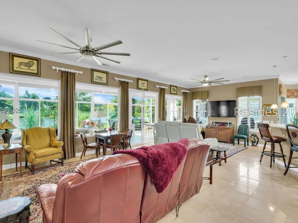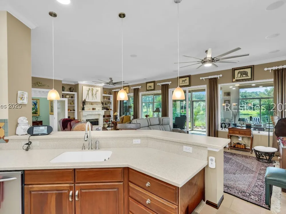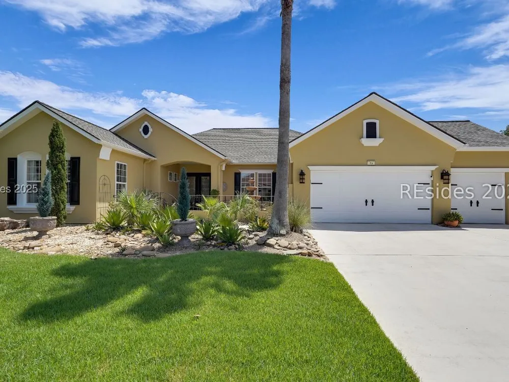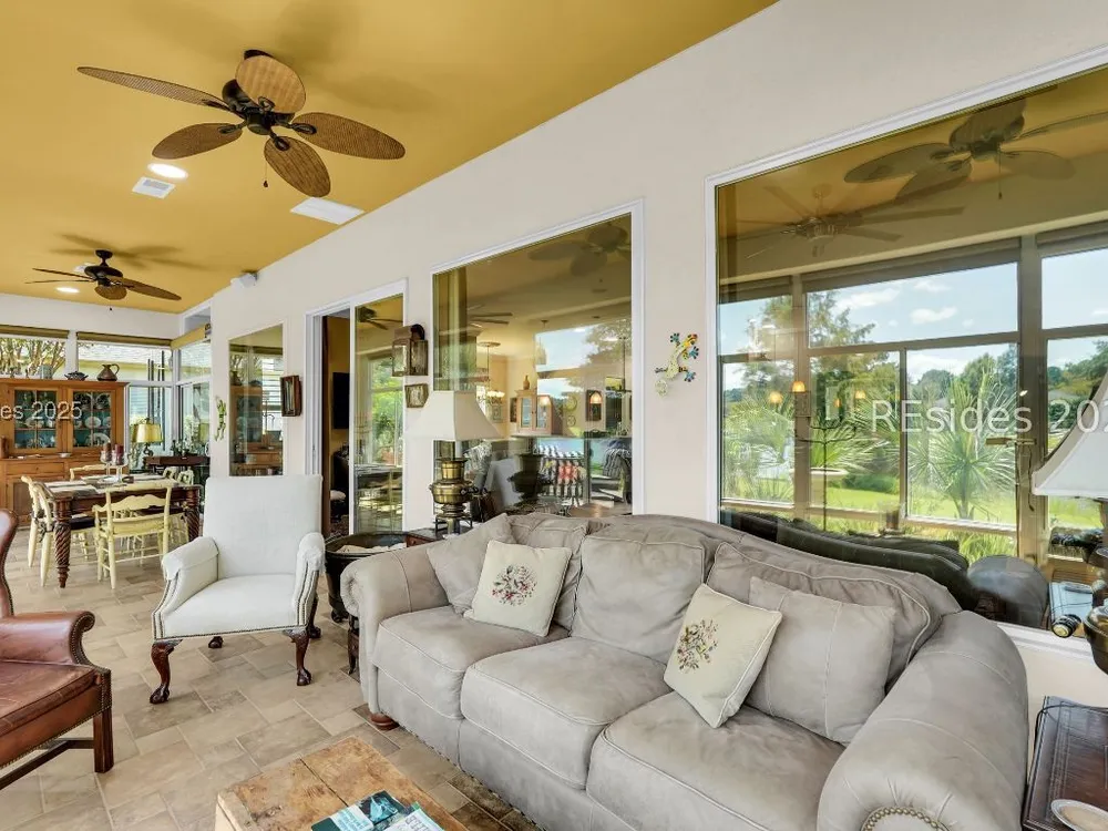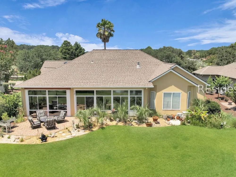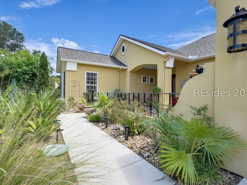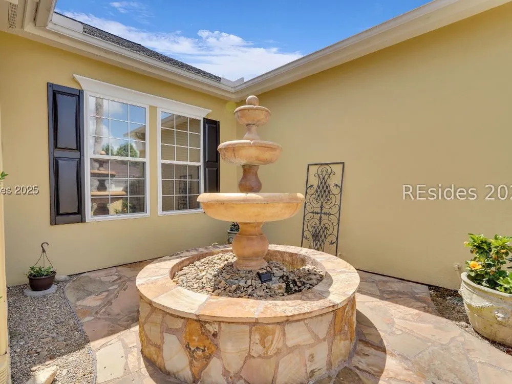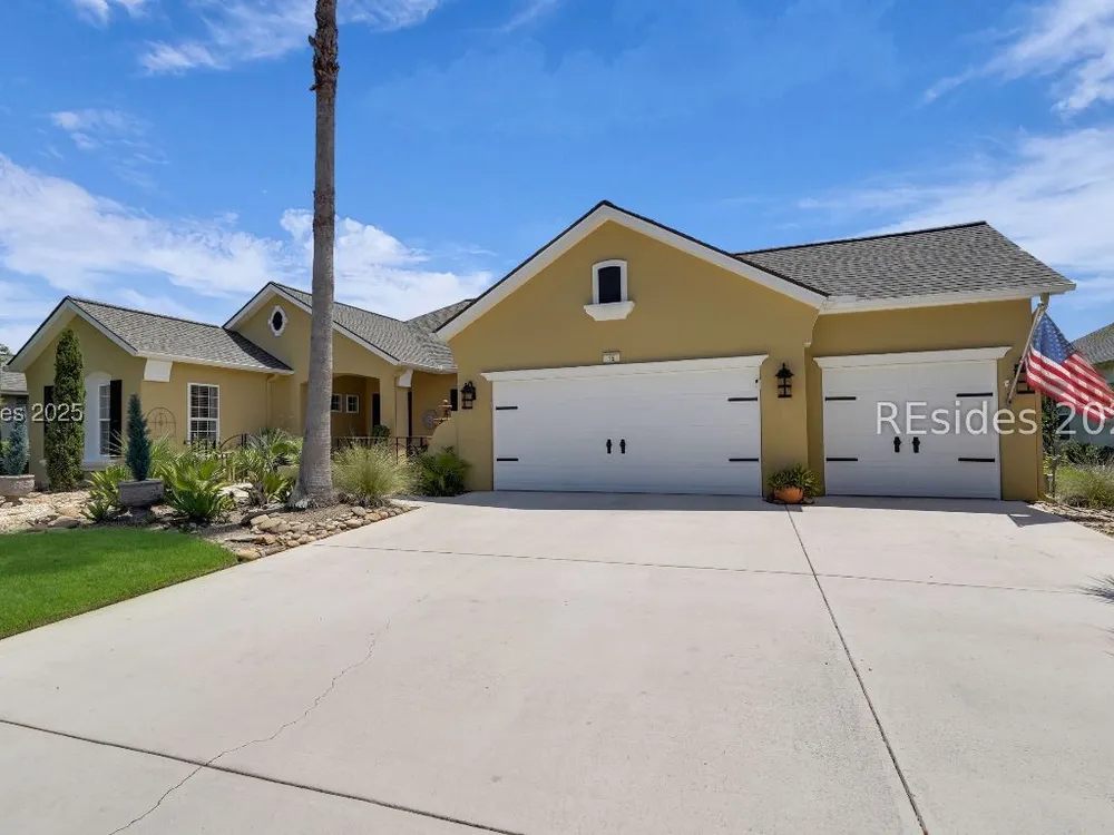 Lowcountry living amplified in this exquisite, rarely available Yellowstone model - one of Sun Citys most sought-after designs! This beautifully appointed 2800 sq ft. 2 Bedroom, 2.5 Bath home with an additional Office/Den, 3-car garage plus climatized workspace is perfectly positioned near the end of a quiet cul-de-sac road in the exclusive Estates section of Sun City. Enjoy sweeping, panoramic, magnificent lagoon views from your climatized Carolina room, bringing wildlife and natural beauty right to your doorstep. Mature, vibrant landscaping and hardscapes, newly sodded lawn, and majestic palm, lead to a spacious front courtyard with a charming fountain and custom iron railings! Embrace luxury as you enter the grand foyer with soaring 10-12 foot ceilings throughout complimented by timeless and elegant marble flooring. The spacious Great Room showcases custom built-ins, an impressive gas-log fireplace, and a bonus bar area off great room with plumbing for a sink - all accented by refined crown molding and stylish finishes throughout. Newly installed 8 inch LEDs throughout on smooth ceilings, a new 50-year roof, tinted windows, new whole home water filtration system, clean stucco inspection, and just painted exterior with 3 Coats high value Sherwin Williams paint make this home seem new! New garage doors, smart, wireless openers, wireless smart thermostats, new upgraded ceiling fans, and upgraded HVAC just add to this incredible list of owner investments and upgrades. The roomy, open, kitchen offers a generous breakfast area, bar seating, ample pantry space, and quality finishes that make both daily living and entertaining a joy. Two large en suite bedrooms provide comfort and privacy, with the luxurious primary suite offering picture-perfect lagoon views and a spa-inspired bath. The convenient side, covered porch area off kitchen provides the perfect outdoor cooking location to grill, smoke, griddle and chill! This exceptional home accelerates comfort and class in the Estate section- one of the best locations in Sun City making it an exceptional opportunity you don't want to miss!