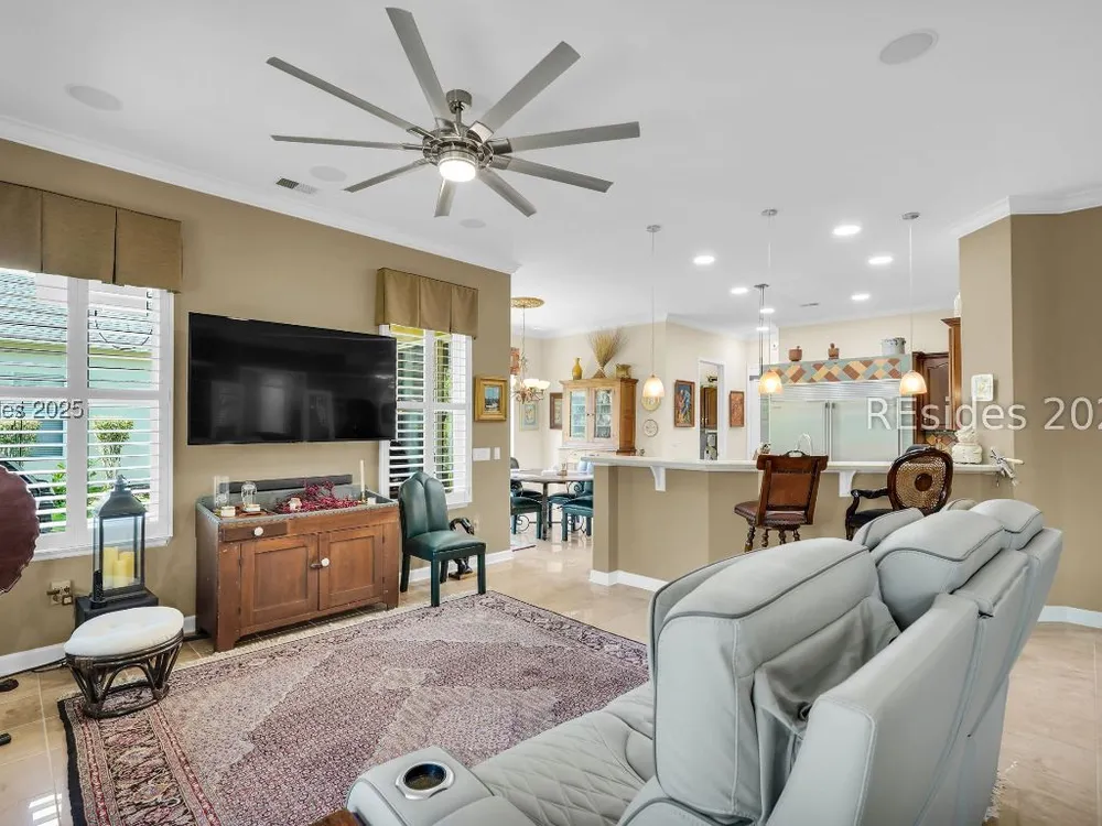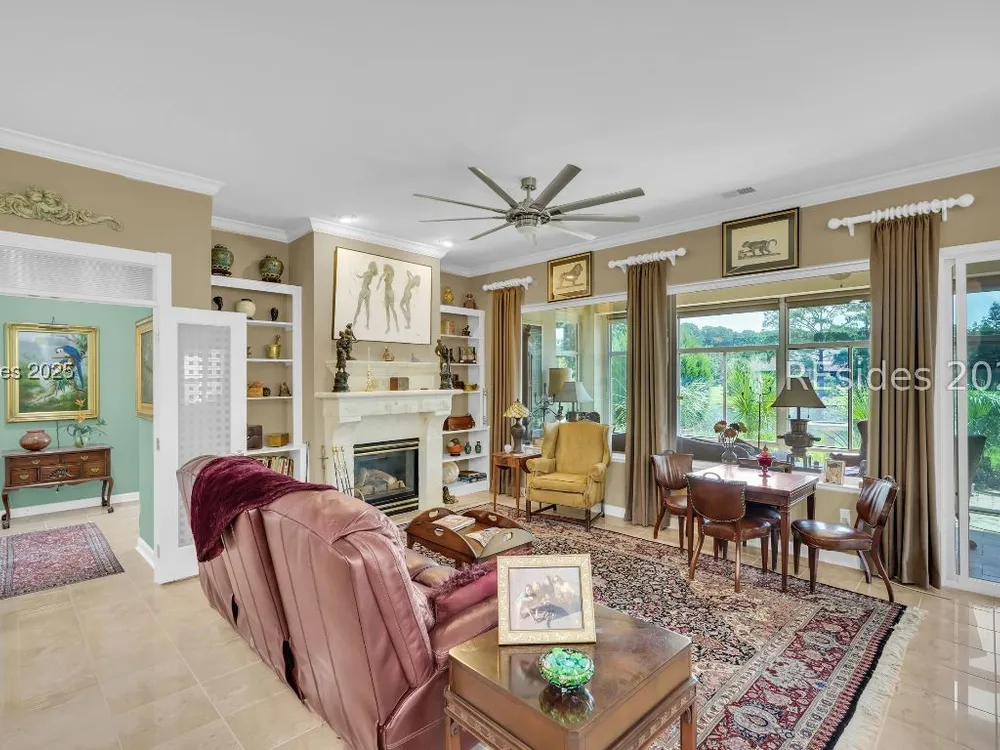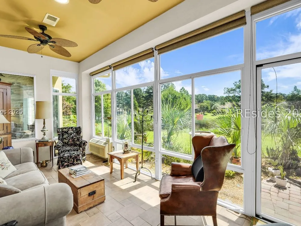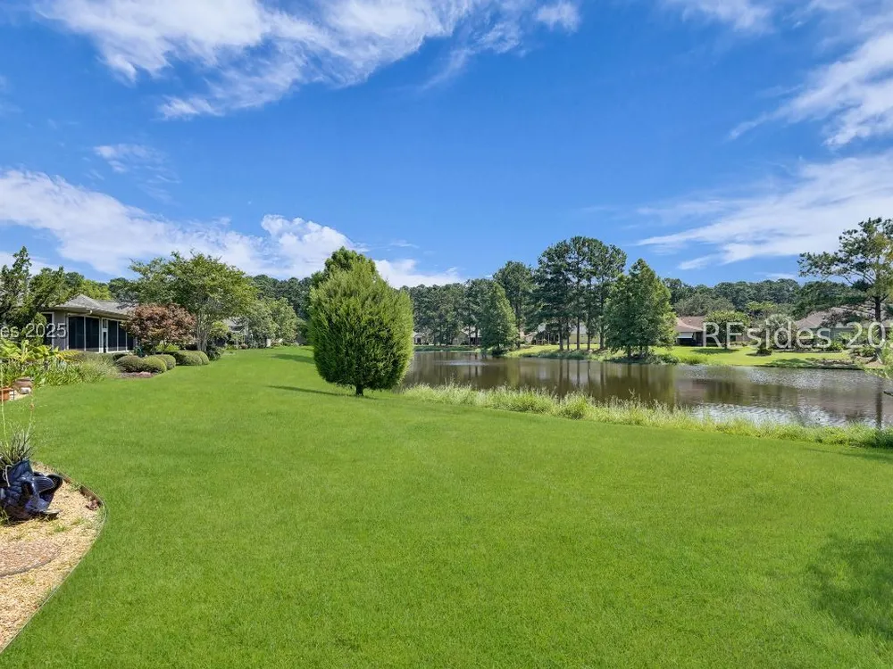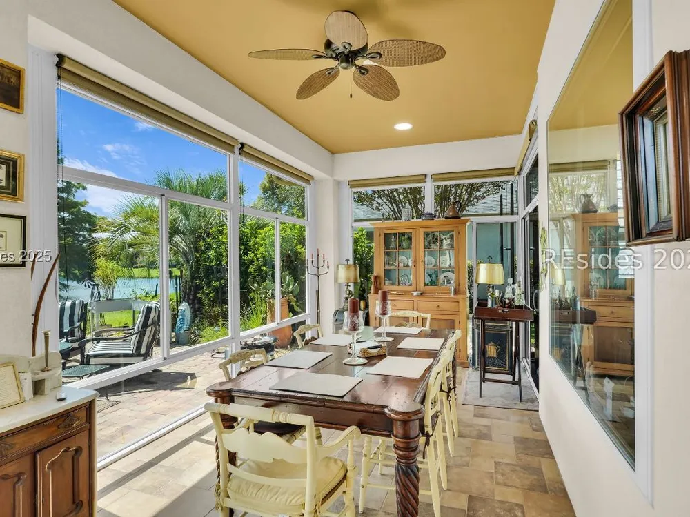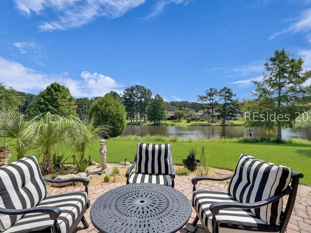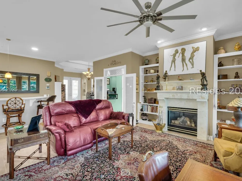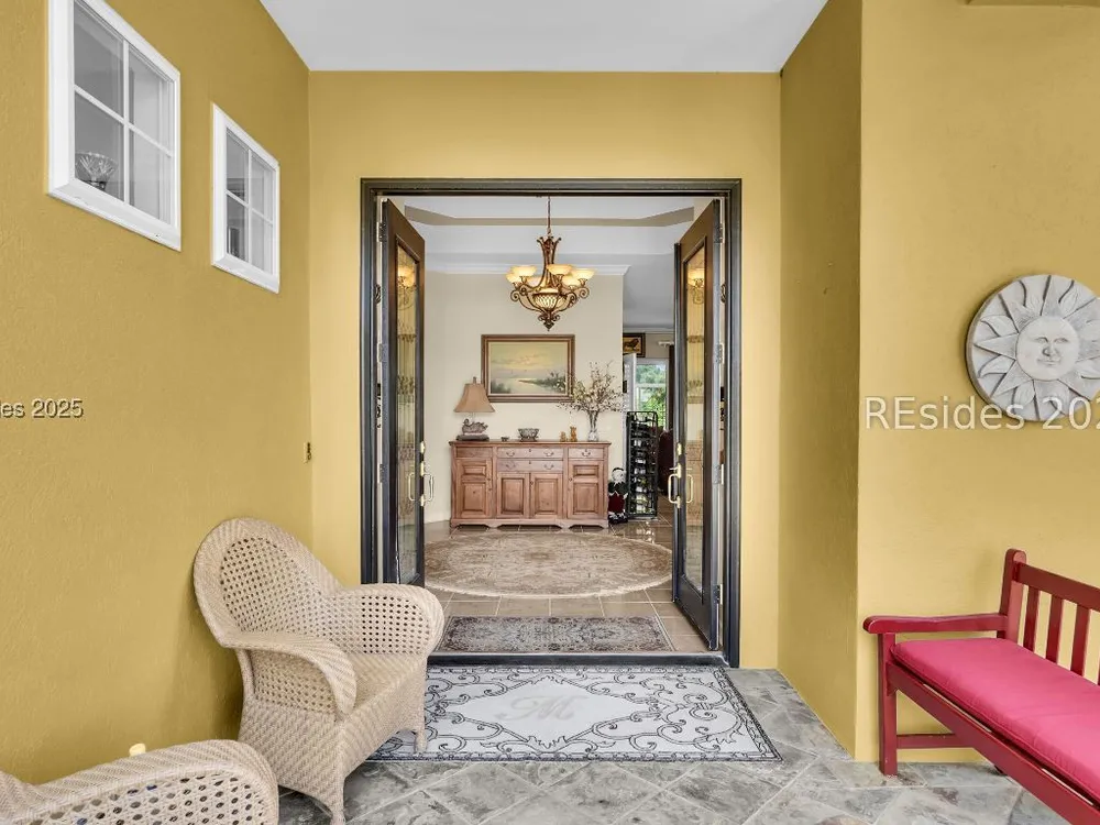 Lowcountry living amplified in this exquisite, rarely available Yellowstone model - one of Sun Citys most sought-after designs! This beautifully appointed 2800 sq ft. 2 Bedroom, 2.5 Bath home with an additional Office/Den, 3-car garage plus climatized workspace is perfectly positioned near the end of a quiet cul-de-sac road in the exclusive Estates section of Sun City. Enjoy sweeping, panoramic, magnificent lagoon views from your climatized Carolina room, bringing wildlife and natural beauty right to your doorstep. Mature, vibrant landscaping and hardscapes, newly sodded lawn, and majestic palm, lead to a spacious front courtyard with a charming fountain and custom iron railings! Embrace luxury as you enter the grand foyer with soaring 10-12 foot ceilings throughout complimented by timeless and elegant marble flooring. The spacious Great Room showcases custom built-ins, an impressive gas-log fireplace, and a bonus bar area off great room with plumbing for a sink - all accented by refined crown molding and stylish finishes throughout. Newly installed 8 inch LEDs throughout on smooth ceilings, a new 50-year roof, tinted windows, new whole home water filtration system, clean stucco inspection, and just painted exterior with 3 Coats high value Sherwin Williams paint make this home seem new! New garage doors, smart, wireless openers, wireless smart thermostats, new upgraded ceiling fans, and upgraded HVAC just add to this incredible list of owner investments and upgrades. The roomy, open, kitchen offers a generous breakfast area, bar seating, ample pantry space, and quality finishes that make both daily living and entertaining a joy. Two large en suite bedrooms provide comfort and privacy, with the luxurious primary suite offering picture-perfect lagoon views and a spa-inspired bath. The convenient side, covered porch area off kitchen provides the perfect outdoor cooking location to grill, smoke, griddle and chill! This exceptional home accelerates comfort and class in the Estate section- one of the best locations in Sun City making it an exceptional opportunity you don't want to miss!