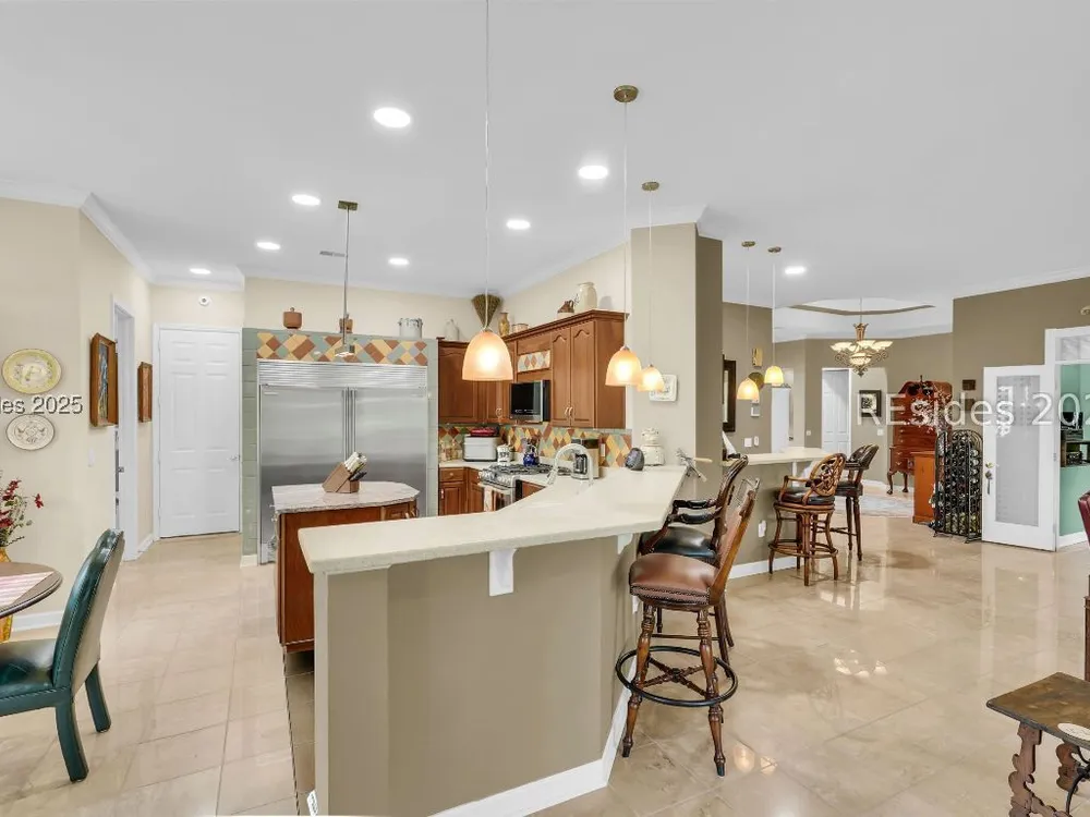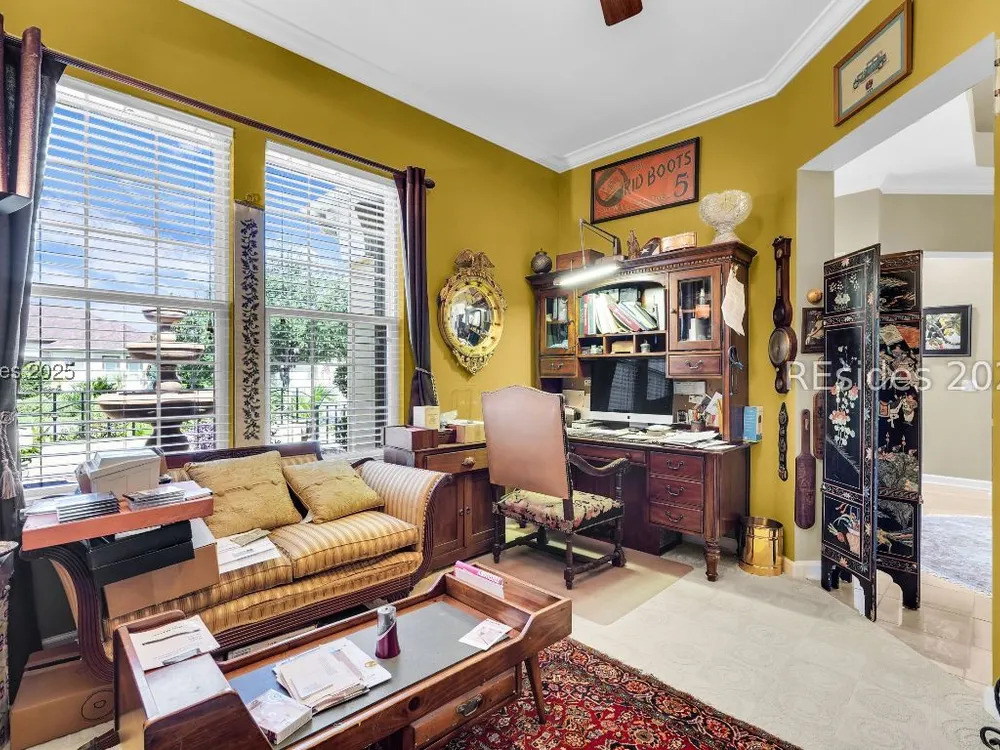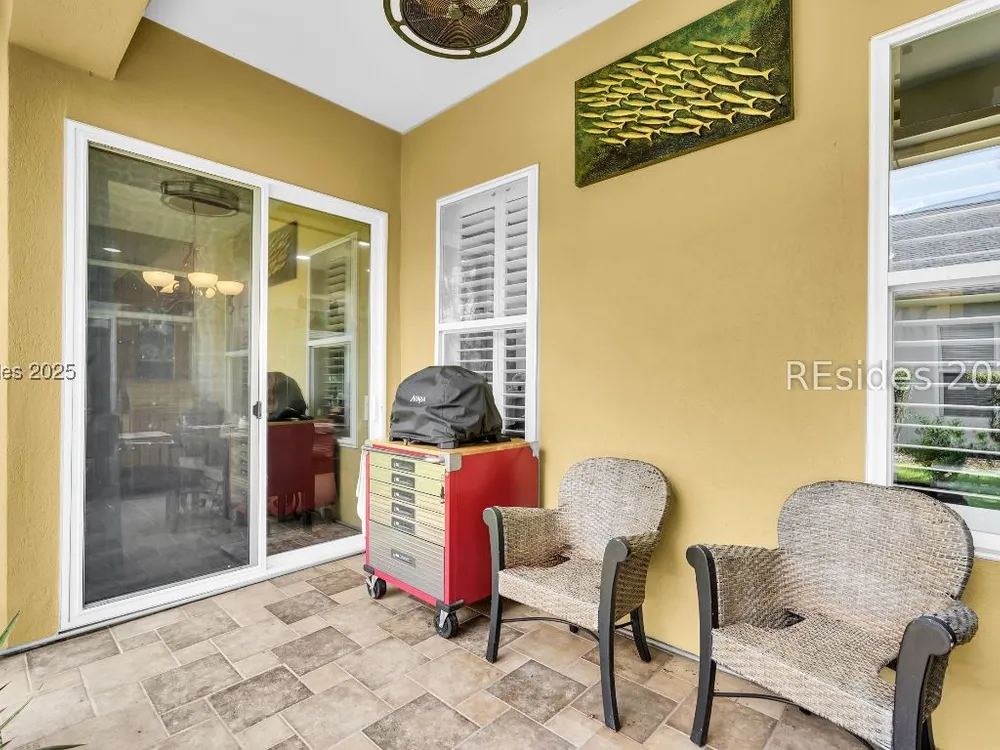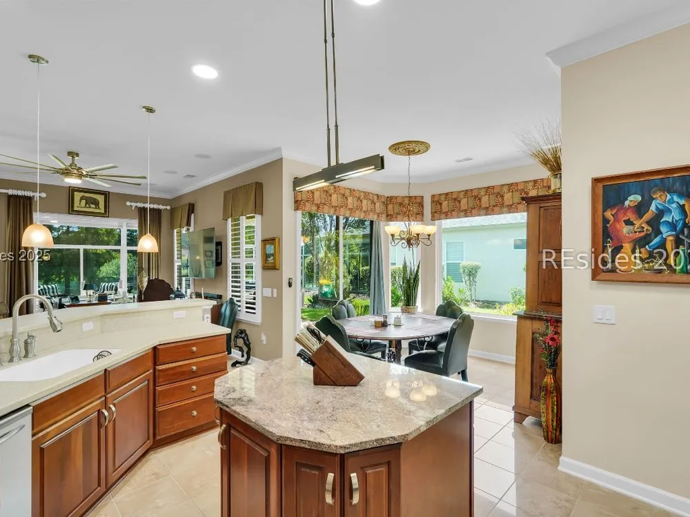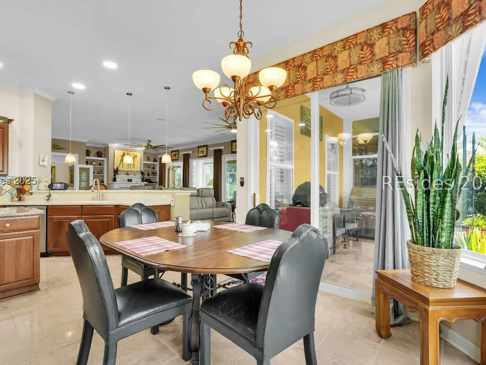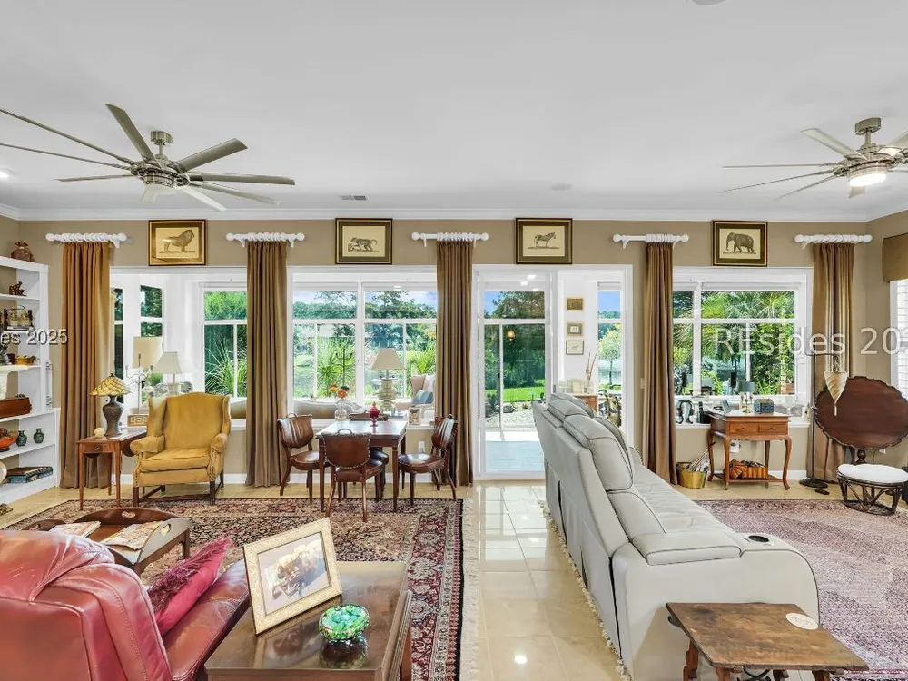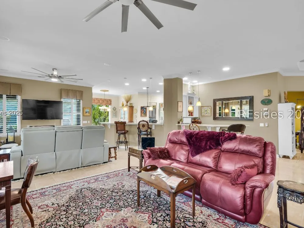 Lowcountry living amplified in this exquisite, rarely available Yellowstone model - one of Sun Citys most sought-after designs! This beautifully appointed 2800 sq ft. 2 Bedroom, 2.5 Bath home with an additional Office/Den, 3-car garage plus climatized workspace is perfectly positioned near the end of a quiet cul-de-sac road in the exclusive Estates section of Sun City. Enjoy sweeping, panoramic, magnificent lagoon views from your climatized Carolina room, bringing wildlife and natural beauty right to your doorstep. Mature, vibrant landscaping and hardscapes, newly sodded lawn, and majestic palm, lead to a spacious front courtyard with a charming fountain and custom iron railings! Embrace luxury as you enter the grand foyer with soaring 10-12 foot ceilings throughout complimented by timeless and elegant marble flooring. The spacious Great Room showcases custom built-ins, an impressive gas-log fireplace, and a bonus bar area off great room with plumbing for a sink - all accented by refined crown molding and stylish finishes throughout. Newly installed 8 inch LEDs throughout on smooth ceilings, a new 50-year roof, tinted windows, new whole home water filtration system, clean stucco inspection, and just painted exterior with 3 Coats high value Sherwin Williams paint make this home seem new! New garage doors, smart, wireless openers, wireless smart thermostats, new upgraded ceiling fans, and upgraded HVAC just add to this incredible list of owner investments and upgrades. The roomy, open, kitchen offers a generous breakfast area, bar seating, ample pantry space, and quality finishes that make both daily living and entertaining a joy. Two large en suite bedrooms provide comfort and privacy, with the luxurious primary suite offering picture-perfect lagoon views and a spa-inspired bath. The convenient side, covered porch area off kitchen provides the perfect outdoor cooking location to grill, smoke, griddle and chill! This exceptional home accelerates comfort and class in the Estate section- one of the best locations in Sun City making it an exceptional opportunity you don't want to miss!