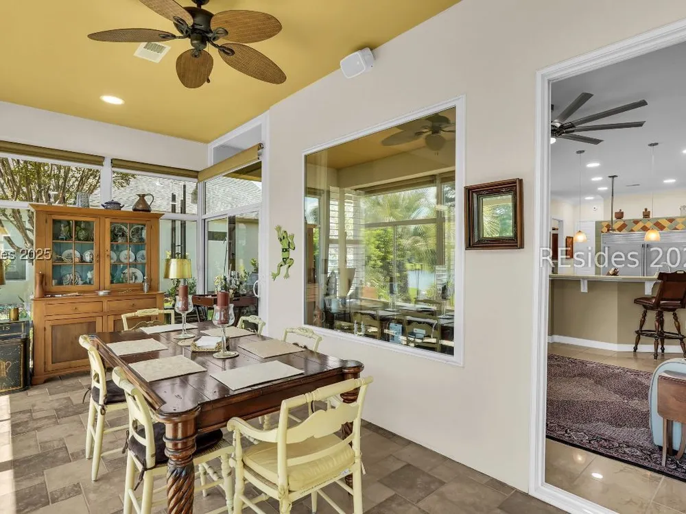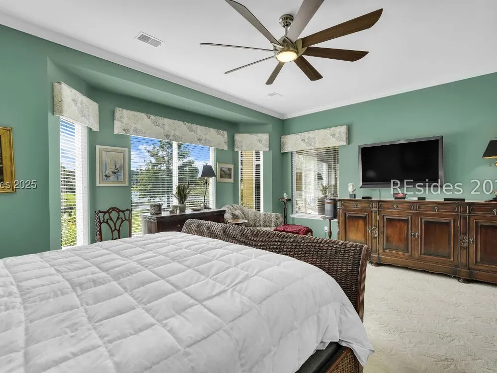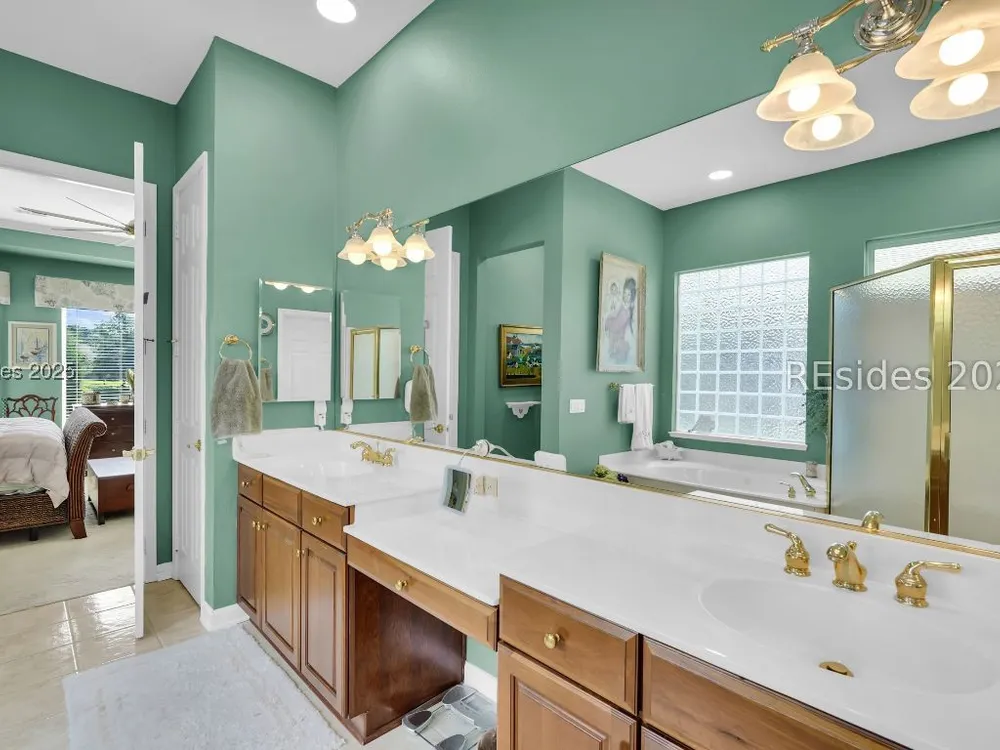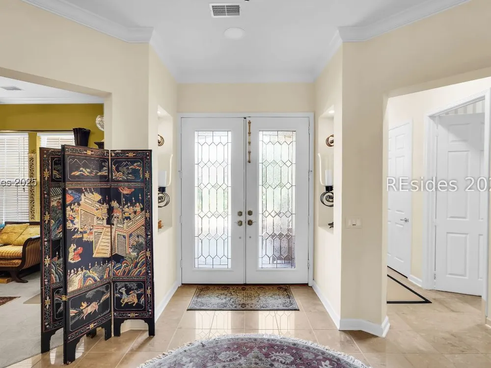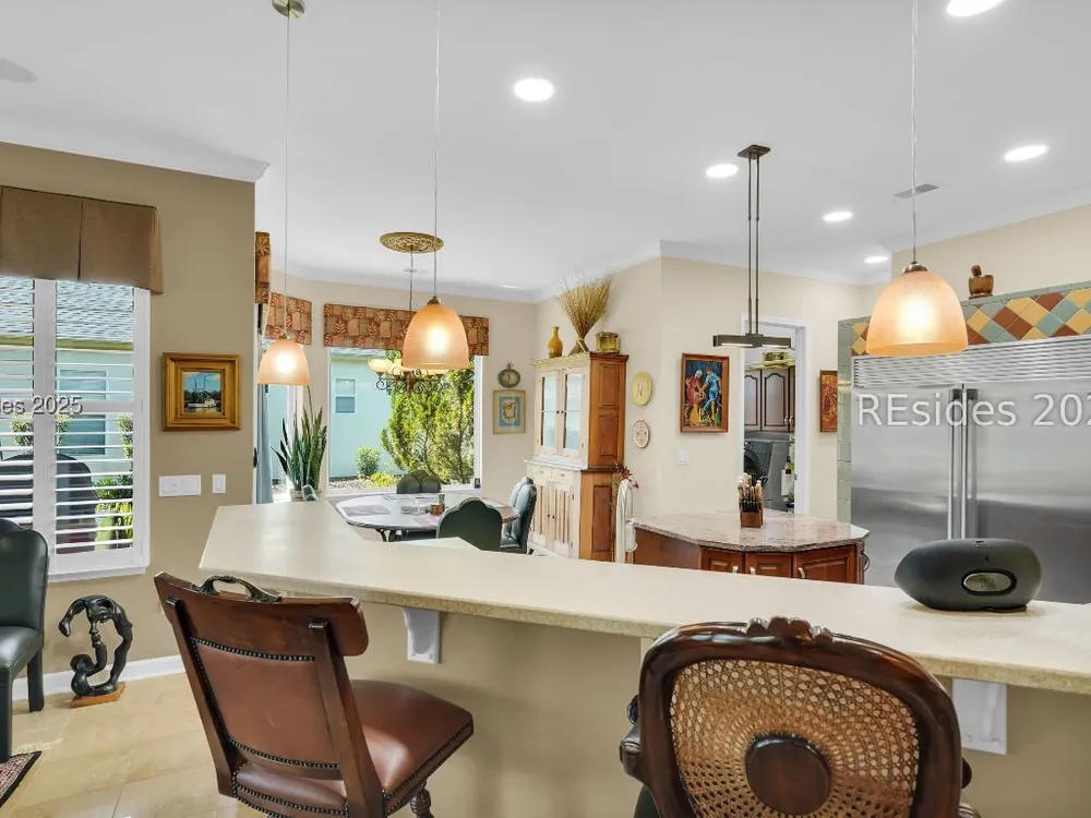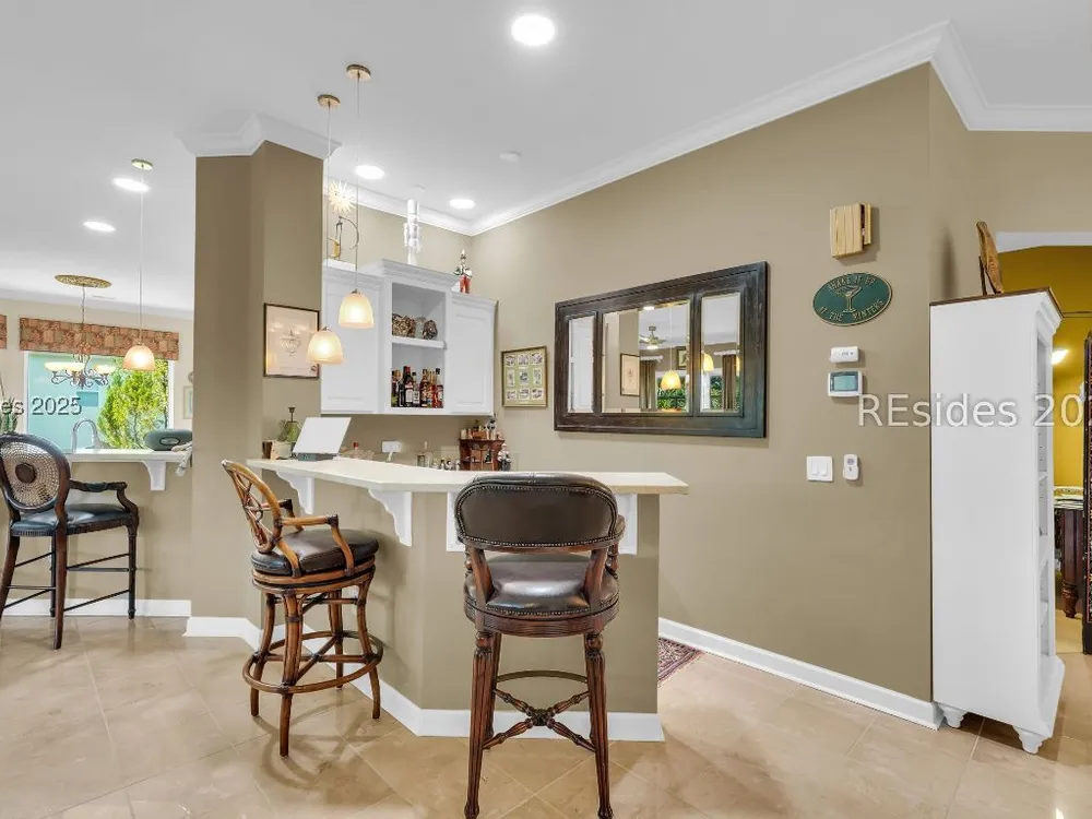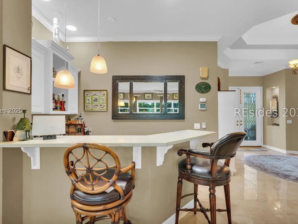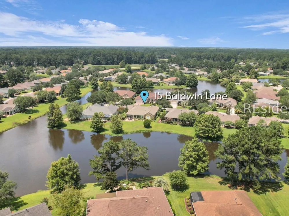 Lowcountry living amplified in this exquisite, rarely available Yellowstone model - one of Sun Citys most sought-after designs! This beautifully appointed 2800 sq ft. 2 Bedroom, 2.5 Bath home with an additional Office/Den, 3-car garage plus climatized workspace is perfectly positioned near the end of a quiet cul-de-sac road in the exclusive Estates section of Sun City. Enjoy sweeping, panoramic, magnificent lagoon views from your climatized Carolina room, bringing wildlife and natural beauty right to your doorstep. Mature, vibrant landscaping and hardscapes, newly sodded lawn, and majestic palm, lead to a spacious front courtyard with a charming fountain and custom iron railings! Embrace luxury as you enter the grand foyer with soaring 10-12 foot ceilings throughout complimented by timeless and elegant marble flooring. The spacious Great Room showcases custom built-ins, an impressive gas-log fireplace, and a bonus bar area off great room with plumbing for a sink - all accented by refined crown molding and stylish finishes throughout. Newly installed 8 inch LEDs throughout on smooth ceilings, a new 50-year roof, tinted windows, new whole home water filtration system, clean stucco inspection, and just painted exterior with 3 Coats high value Sherwin Williams paint make this home seem new! New garage doors, smart, wireless openers, wireless smart thermostats, new upgraded ceiling fans, and upgraded HVAC just add to this incredible list of owner investments and upgrades. The roomy, open, kitchen offers a generous breakfast area, bar seating, ample pantry space, and quality finishes that make both daily living and entertaining a joy. Two large en suite bedrooms provide comfort and privacy, with the luxurious primary suite offering picture-perfect lagoon views and a spa-inspired bath. The convenient side, covered porch area off kitchen provides the perfect outdoor cooking location to grill, smoke, griddle and chill! This exceptional home accelerates comfort and class in the Estate section- one of the best locations in Sun City making it an exceptional opportunity you don't want to miss!