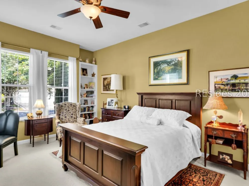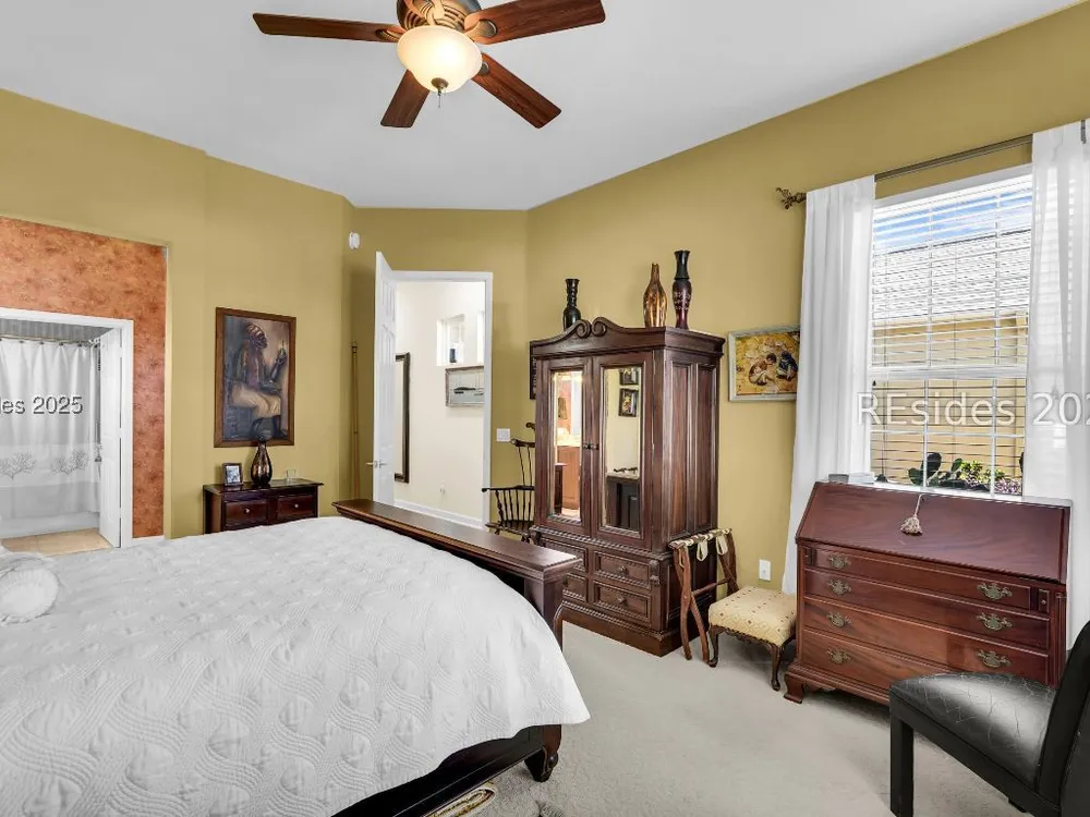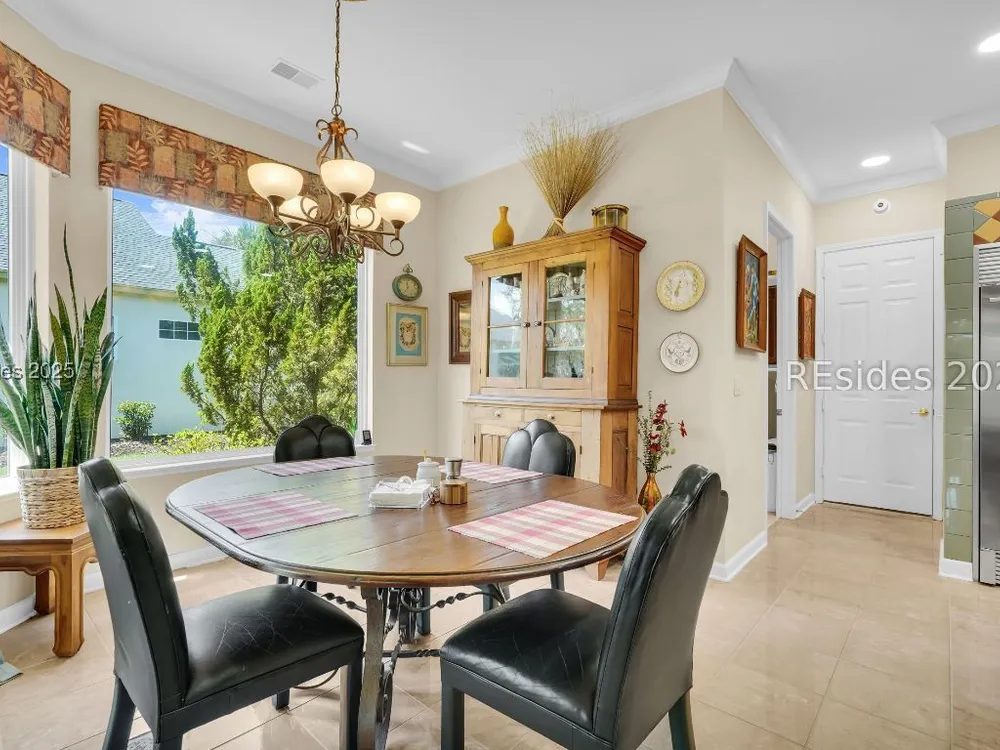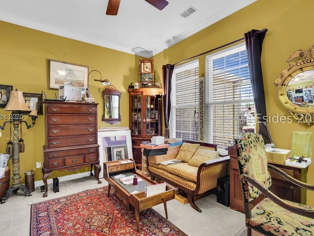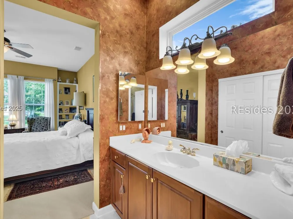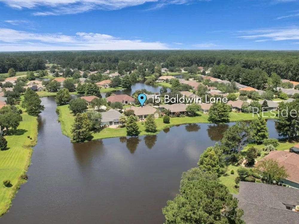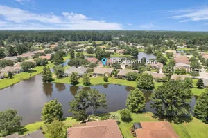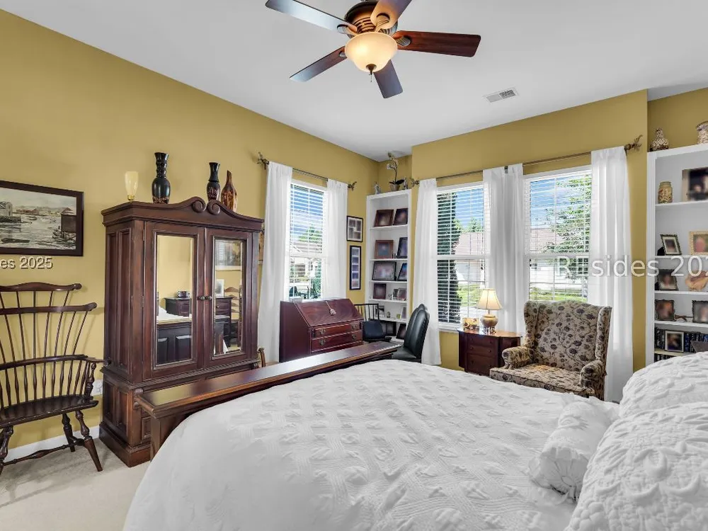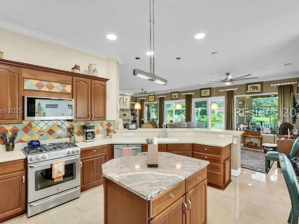 Lowcountry living amplified in this exquisite, rarely available Yellowstone model - one of Sun Citys most sought-after designs! This beautifully appointed 2800 sq ft. 2 Bedroom, 2.5 Bath home with an additional Office/Den, 3-car garage plus climatized workspace is perfectly positioned near the end of a quiet cul-de-sac road in the exclusive Estates section of Sun City. Enjoy sweeping, panoramic, magnificent lagoon views from your climatized Carolina room, bringing wildlife and natural beauty right to your doorstep. Mature, vibrant landscaping and hardscapes, newly sodded lawn, and majestic palm, lead to a spacious front courtyard with a charming fountain and custom iron railings! Embrace luxury as you enter the grand foyer with soaring 10-12 foot ceilings throughout complimented by timeless and elegant marble flooring. The spacious Great Room showcases custom built-ins, an impressive gas-log fireplace, and a bonus bar area off great room with plumbing for a sink - all accented by refined crown molding and stylish finishes throughout. Newly installed 8 inch LEDs throughout on smooth ceilings, a new 50-year roof, tinted windows, new whole home water filtration system, clean stucco inspection, and just painted exterior with 3 Coats high value Sherwin Williams paint make this home seem new! New garage doors, smart, wireless openers, wireless smart thermostats, new upgraded ceiling fans, and upgraded HVAC just add to this incredible list of owner investments and upgrades. The roomy, open, kitchen offers a generous breakfast area, bar seating, ample pantry space, and quality finishes that make both daily living and entertaining a joy. Two large en suite bedrooms provide comfort and privacy, with the luxurious primary suite offering picture-perfect lagoon views and a spa-inspired bath. The convenient side, covered porch area off kitchen provides the perfect outdoor cooking location to grill, smoke, griddle and chill! This exceptional home accelerates comfort and class in the Estate section- one of the best locations in Sun City making it an exceptional opportunity you don't want to miss!