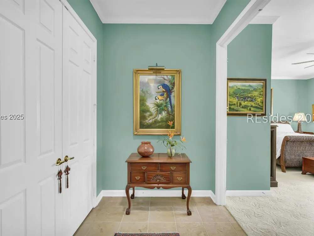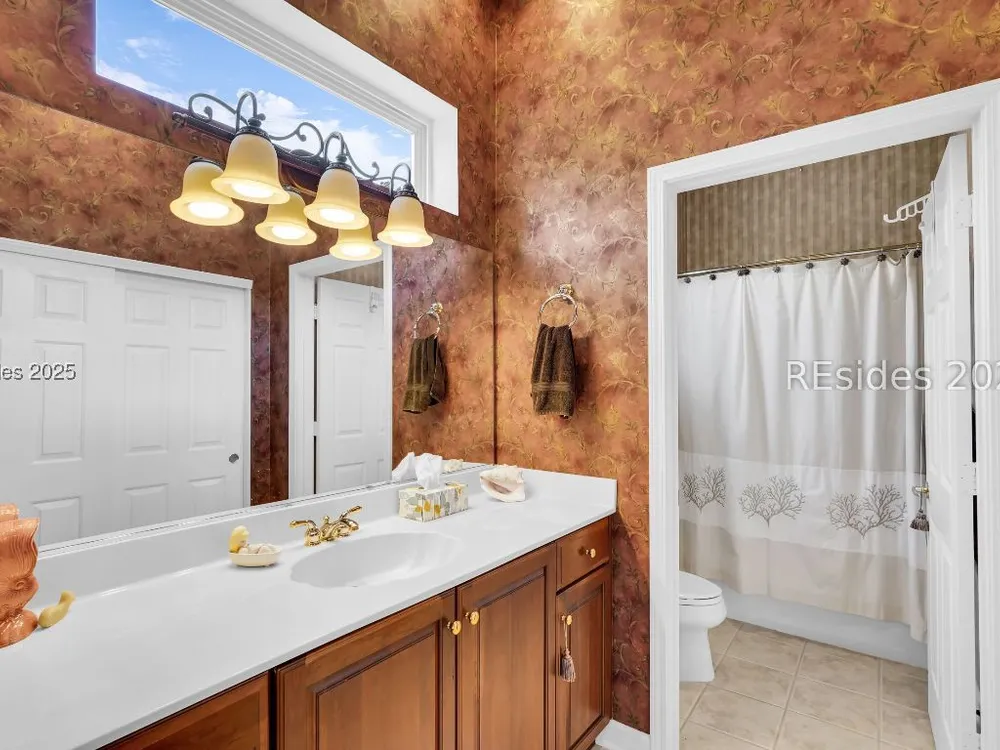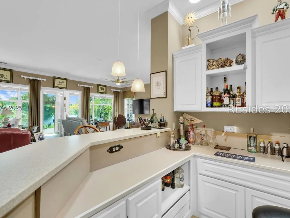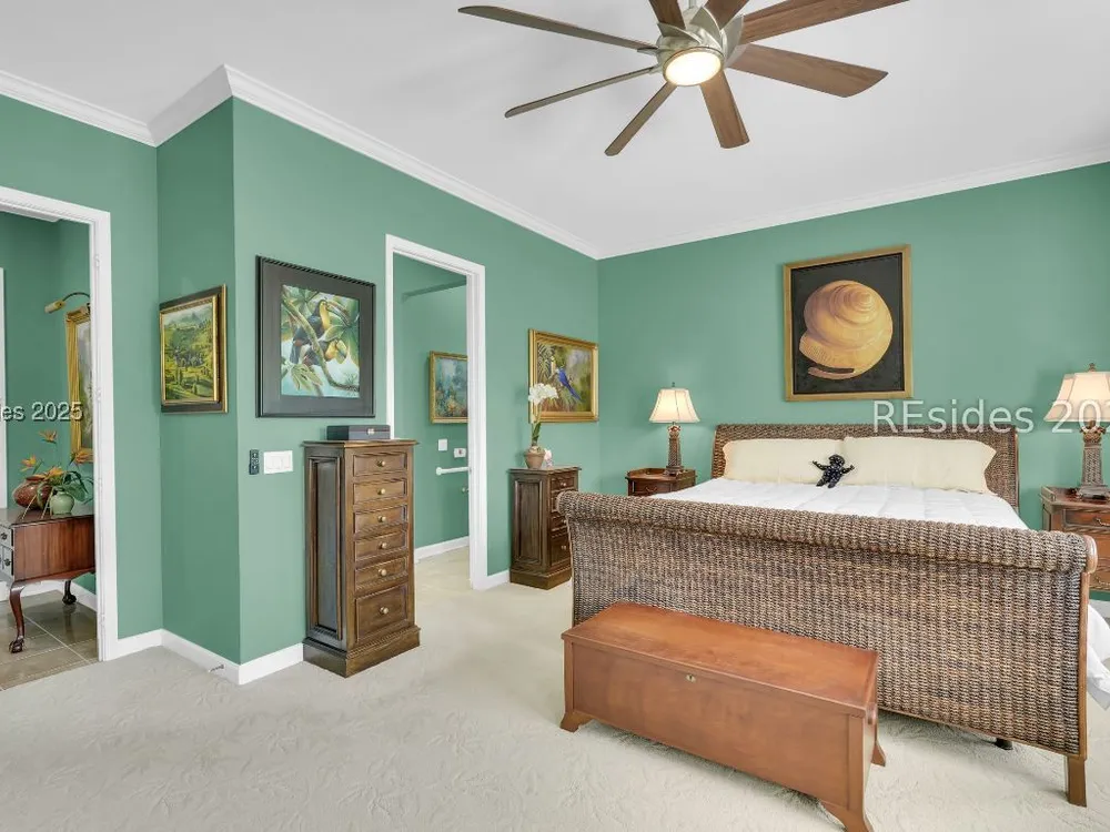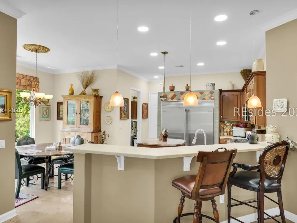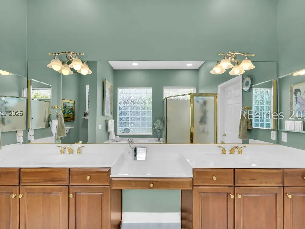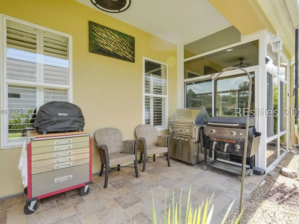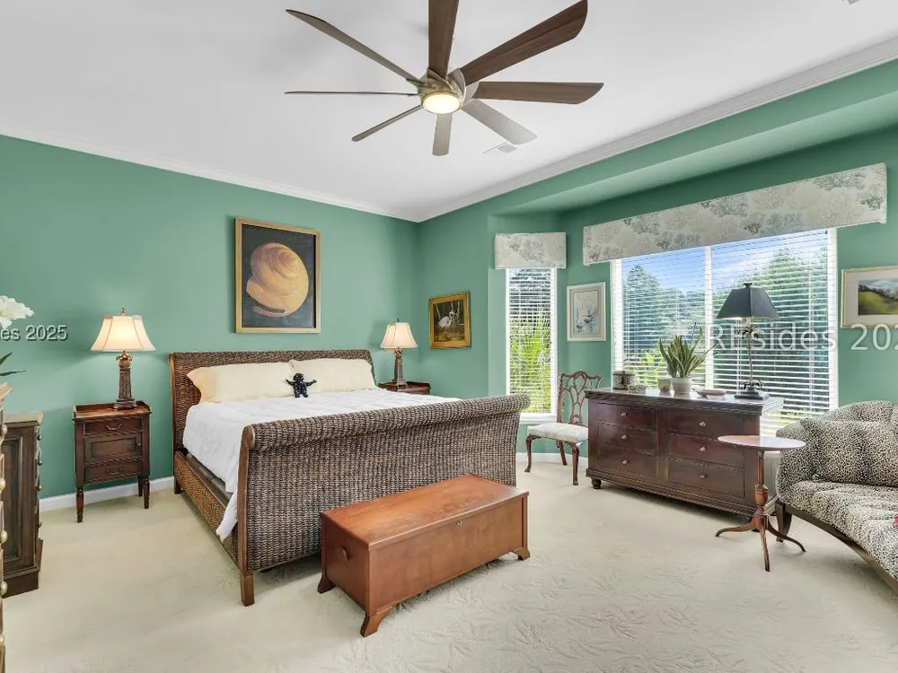 Lowcountry living amplified in this exquisite, rarely available Yellowstone model - one of Sun Citys most sought-after designs! This beautifully appointed 2800 sq ft. 2 Bedroom, 2.5 Bath home with an additional Office/Den, 3-car garage plus climatized workspace is perfectly positioned near the end of a quiet cul-de-sac road in the exclusive Estates section of Sun City. Enjoy sweeping, panoramic, magnificent lagoon views from your climatized Carolina room, bringing wildlife and natural beauty right to your doorstep. Mature, vibrant landscaping and hardscapes, newly sodded lawn, and majestic palm, lead to a spacious front courtyard with a charming fountain and custom iron railings! Embrace luxury as you enter the grand foyer with soaring 10-12 foot ceilings throughout complimented by timeless and elegant marble flooring. The spacious Great Room showcases custom built-ins, an impressive gas-log fireplace, and a bonus bar area off great room with plumbing for a sink - all accented by refined crown molding and stylish finishes throughout. Newly installed 8 inch LEDs throughout on smooth ceilings, a new 50-year roof, tinted windows, new whole home water filtration system, clean stucco inspection, and just painted exterior with 3 Coats high value Sherwin Williams paint make this home seem new! New garage doors, smart, wireless openers, wireless smart thermostats, new upgraded ceiling fans, and upgraded HVAC just add to this incredible list of owner investments and upgrades. The roomy, open, kitchen offers a generous breakfast area, bar seating, ample pantry space, and quality finishes that make both daily living and entertaining a joy. Two large en suite bedrooms provide comfort and privacy, with the luxurious primary suite offering picture-perfect lagoon views and a spa-inspired bath. The convenient side, covered porch area off kitchen provides the perfect outdoor cooking location to grill, smoke, griddle and chill! This exceptional home accelerates comfort and class in the Estate section- one of the best locations in Sun City making it an exceptional opportunity you don't want to miss!