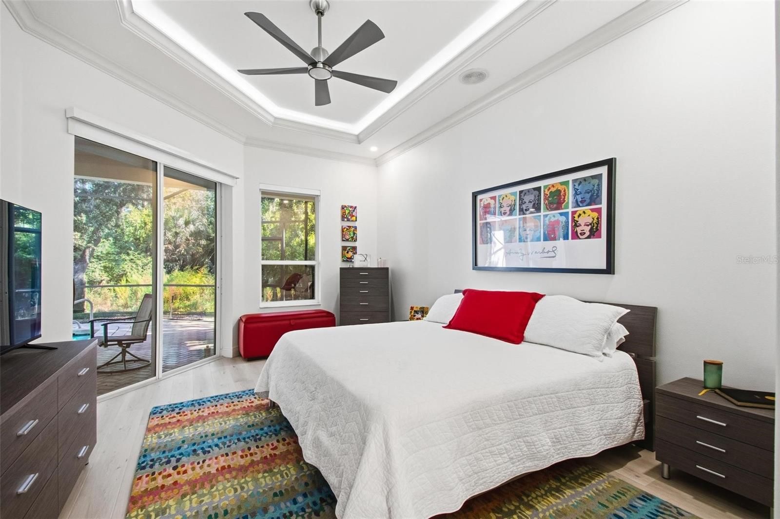 - Ceiling Fan(s), Crown Molding, Eat-in Kitchen, High Ceilings, Kitchen/Family Room Combo, Living/Dining Room, Main Level Primary, Solid Surface Counters, Stone Counters, Tray Ceiling(s)