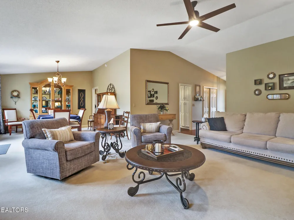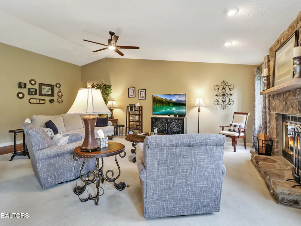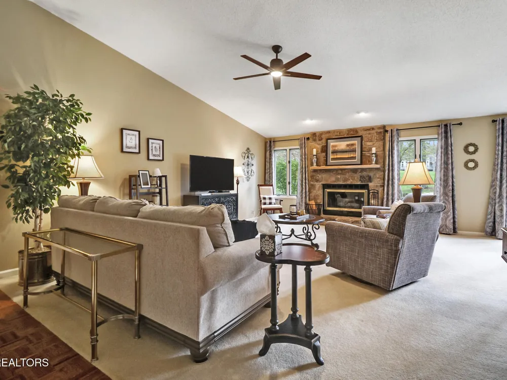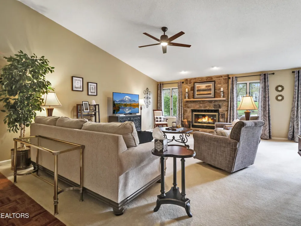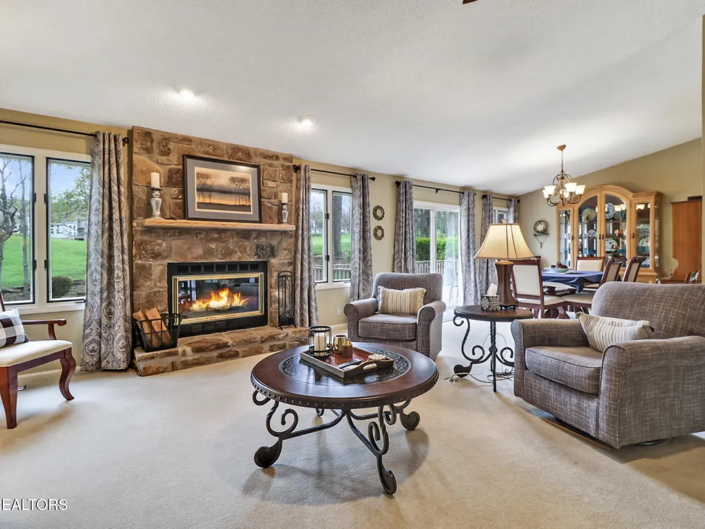 Welcome to this charming ranch home that sits on the 11th green of Stonehenge, Fairfield Glade's Signature Golf Course. This beautifully maintained home is centrally located to the amenities that FFG has to offer. Walk into an inviting foyer which leads to a spacious living room with a stone wood burning fireplace. The formal dining room has sliding doors that leads to the deck and relaxing views of the golf course. Your kitchen has plenty of cabinets and counterspace, pantry with pull out shelves and stainless steel appliances, plus a cozy eat-in kitchen area which leads to a sunroom plus laundry area with a pocket door and 1/2 bath. The bedrooms feature ceiling fans and the primary bath has tile flooring and a walk in shower. The 2 car garage has tons of storage cabinets. Crawl space has a concreted area. The HVAC system is approx. 3 years old. Furniture is negotiable.