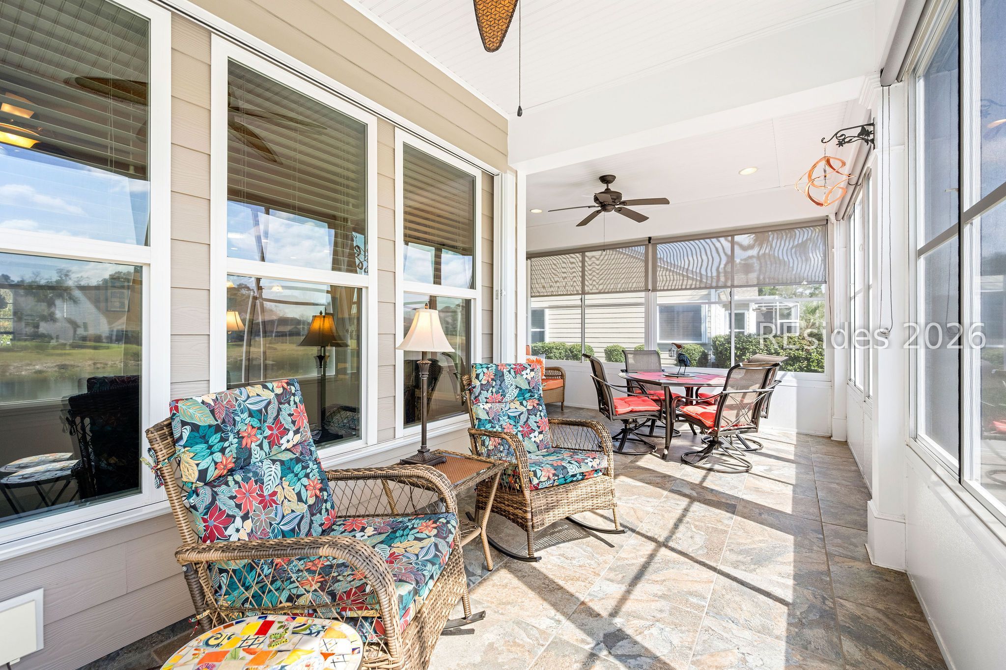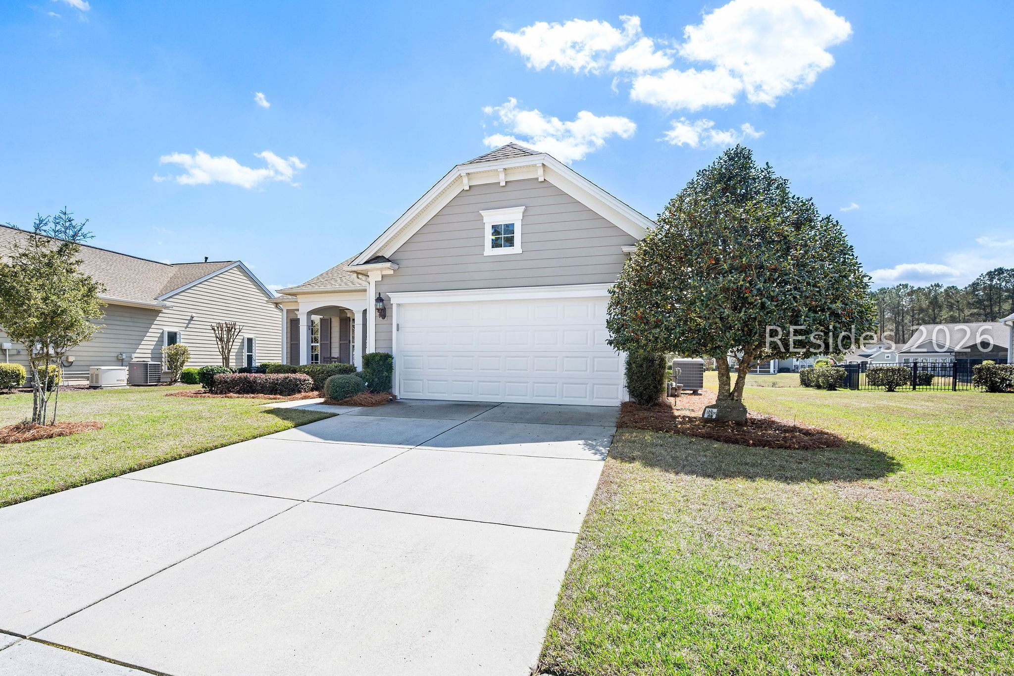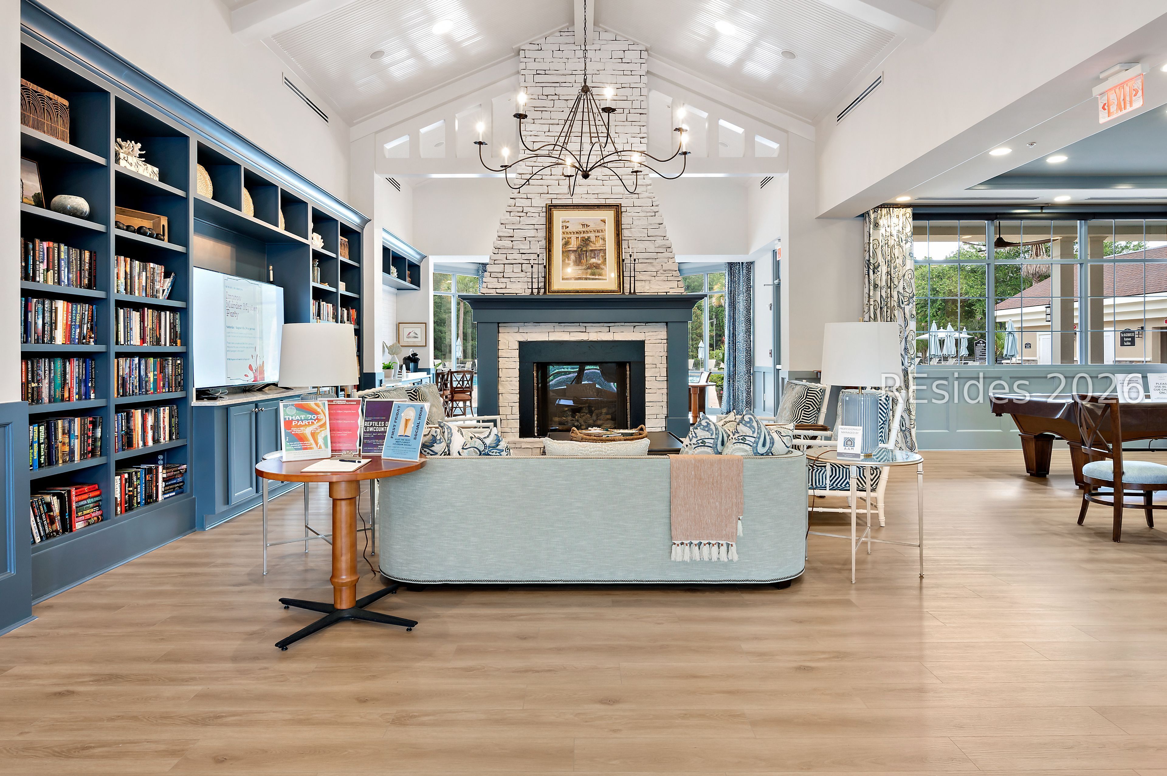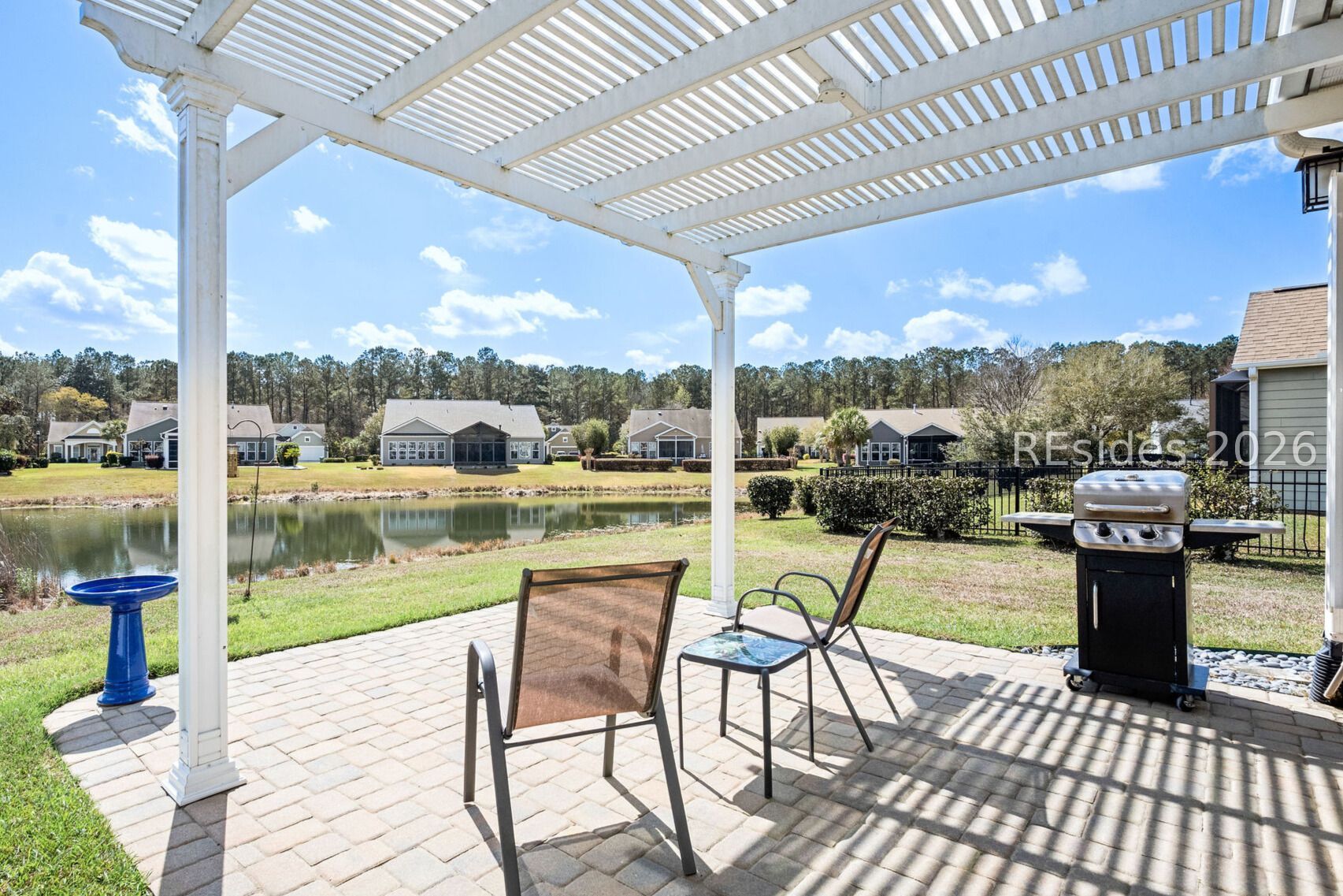 Discover the perfect home to complement your active yet relaxed 55+ lifestyle. This thoughtfully designed 2-bedroom, 2-bath residence with a dedicated library offers comfortable living with beautiful wood flooring throughout the main living areas-no carpet. The well-appointed kitchen features upgraded cabinetry, a gas range, and stainless steel appliances, ideal for both everyday living and entertaining. The spacious primary suite includes double vanities, a large walk-in closet, and a separate shower for added comfort. Enjoy Lowcountry living at its finest from the expansive screened porch with vinyl slider windows, or step outside to the paver patio and pergola overlooking a tranquil lagoon. Watch waterfowl glide by as you savor your morning coffee, unwind with a good book, or host friends for grilling and evening cocktails. Additional highlights include functional hurricane protection, convenient permanent attic stairs for easy storage access, and an oversized two-car garage-enhancing both peace of mind and everyday convenience. New roof installed 9/2022 and new HVAC system installed 6/2021.