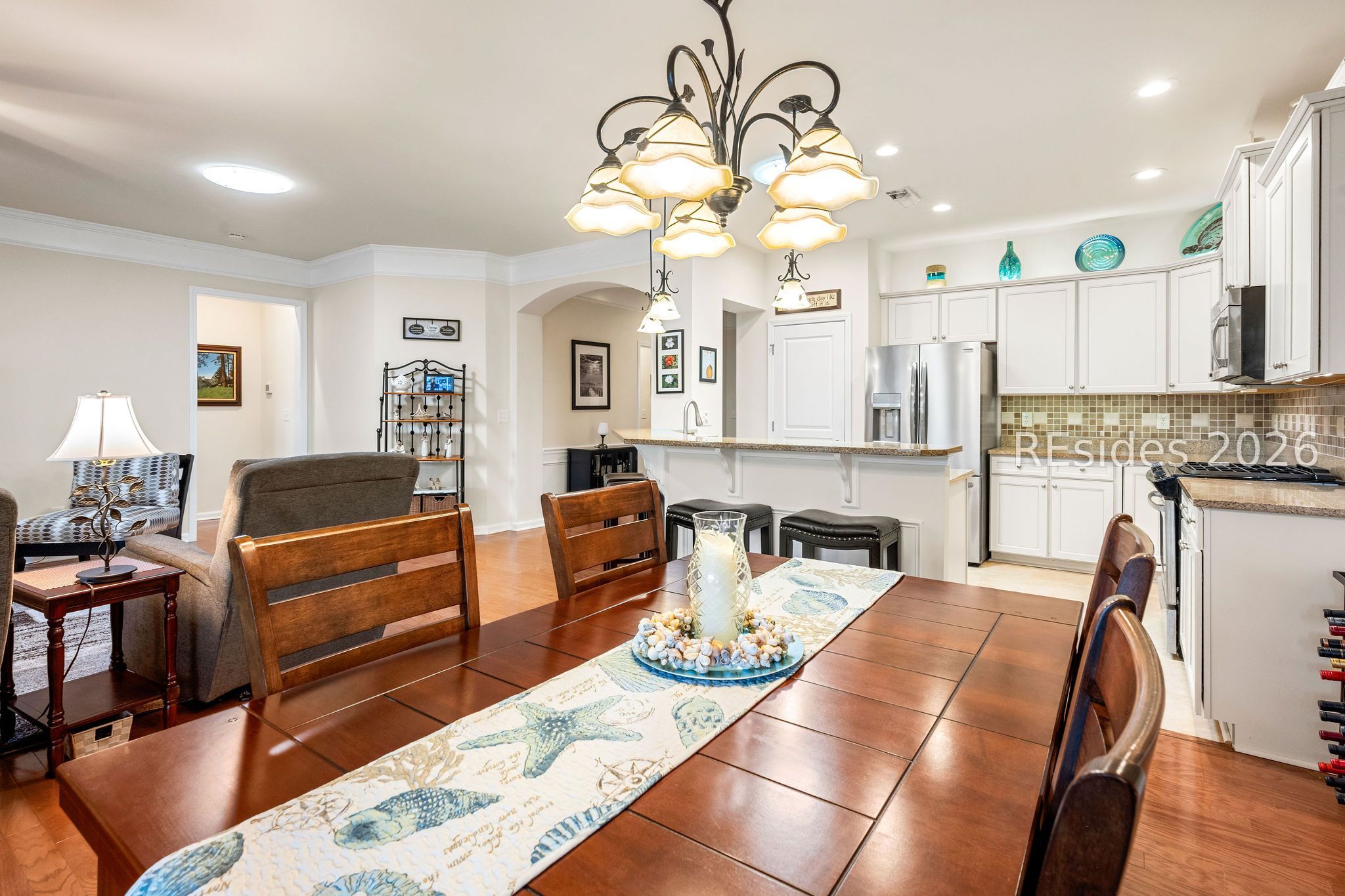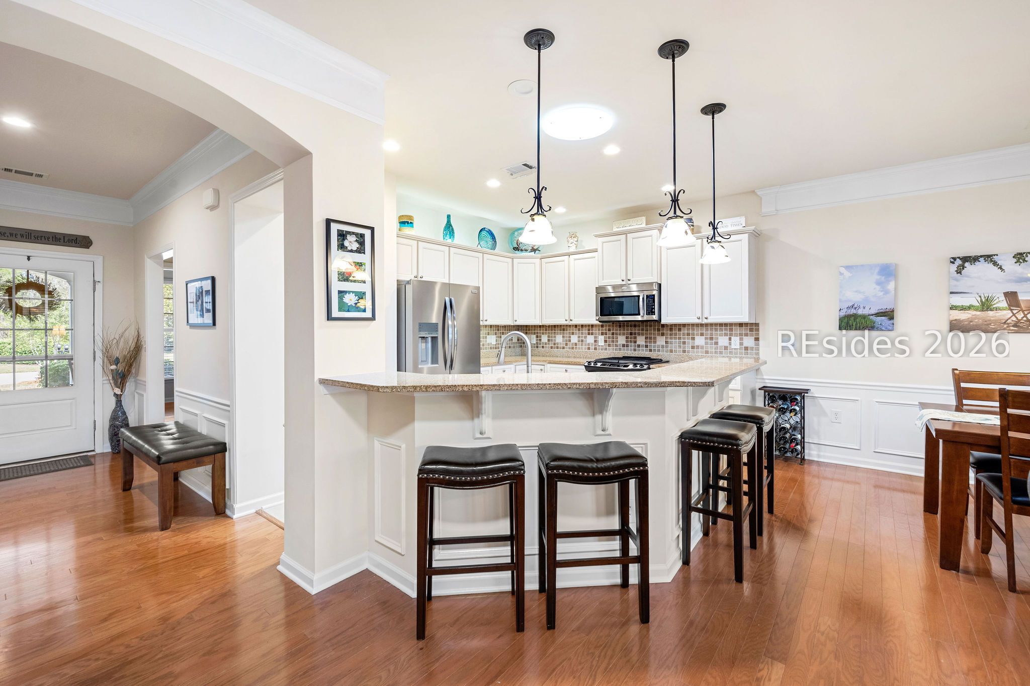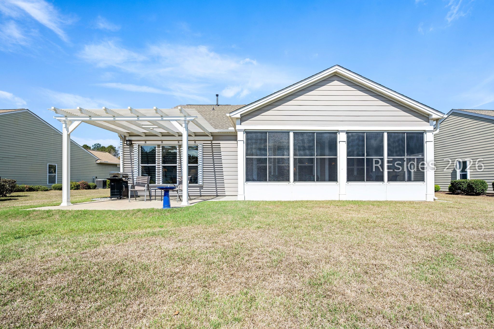 Discover the perfect home to complement your active yet relaxed 55+ lifestyle. This thoughtfully designed 2-bedroom, 2-bath residence with a dedicated library offers comfortable living with beautiful wood flooring throughout the main living areas-no carpet. The well-appointed kitchen features upgraded cabinetry, a gas range, and stainless steel appliances, ideal for both everyday living and entertaining. The spacious primary suite includes double vanities, a large walk-in closet, and a separate shower for added comfort. Enjoy Lowcountry living at its finest from the expansive screened porch with vinyl slider windows, or step outside to the paver patio and pergola overlooking a tranquil lagoon. Watch waterfowl glide by as you savor your morning coffee, unwind with a good book, or host friends for grilling and evening cocktails. Additional highlights include functional hurricane protection, convenient permanent attic stairs for easy storage access, and an oversized two-car garage-enhancing both peace of mind and everyday convenience. New roof installed 9/2022 and new HVAC system installed 6/2021.