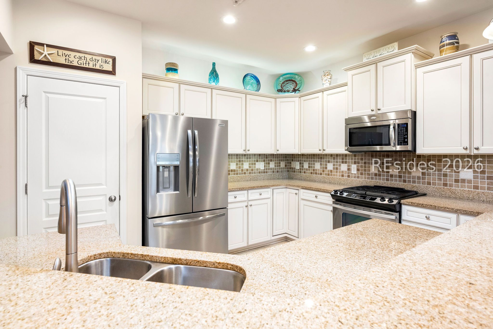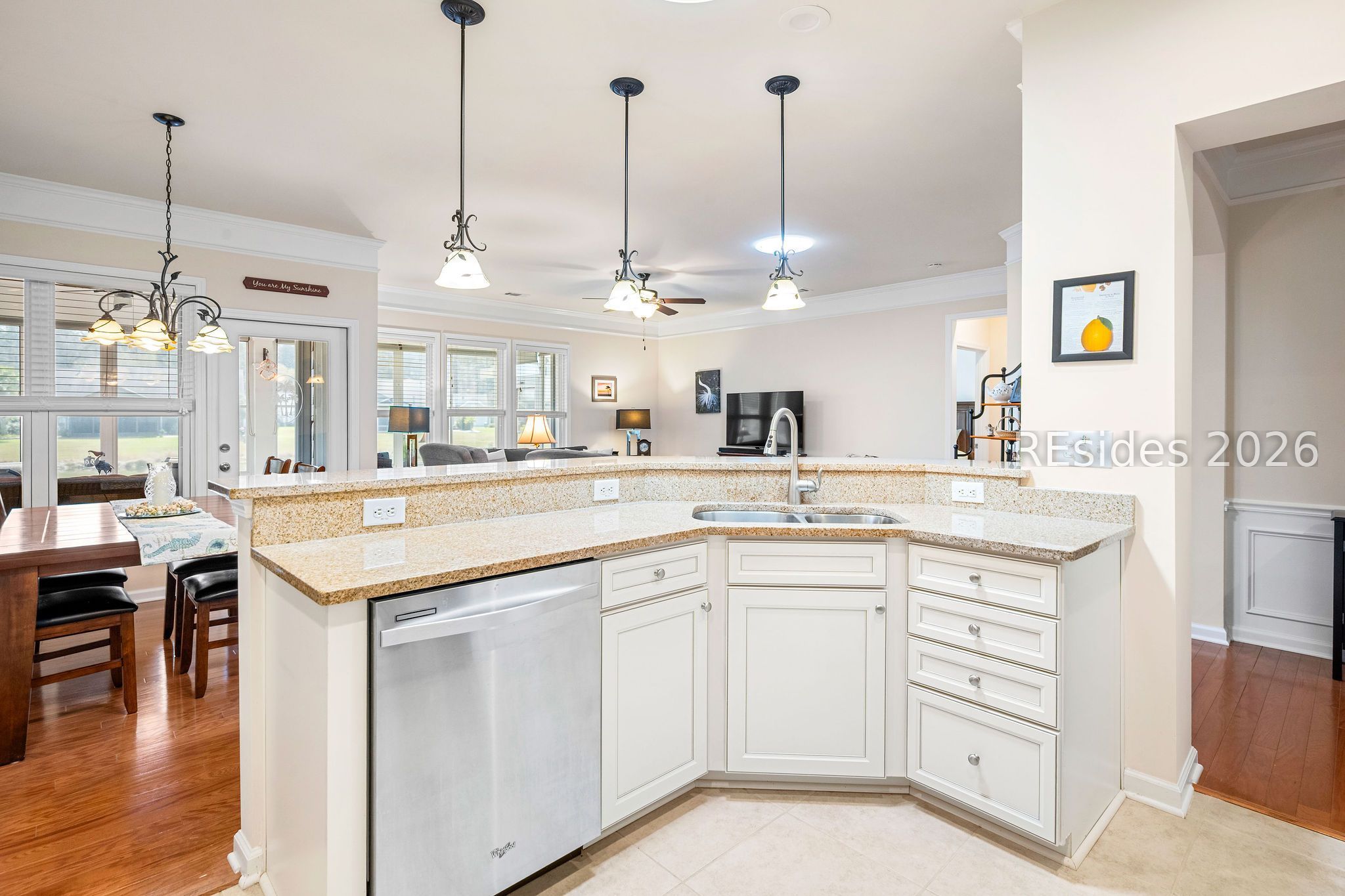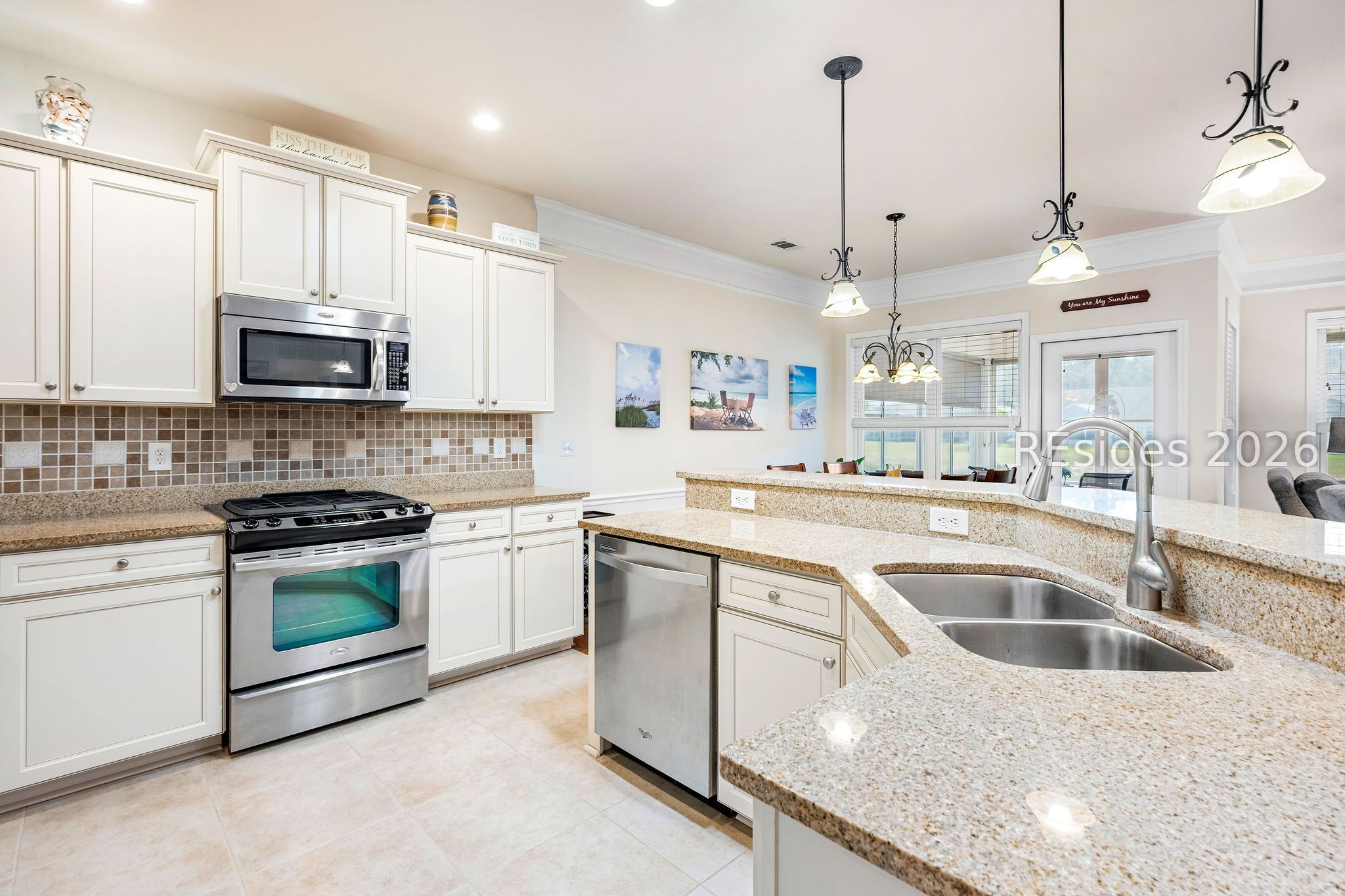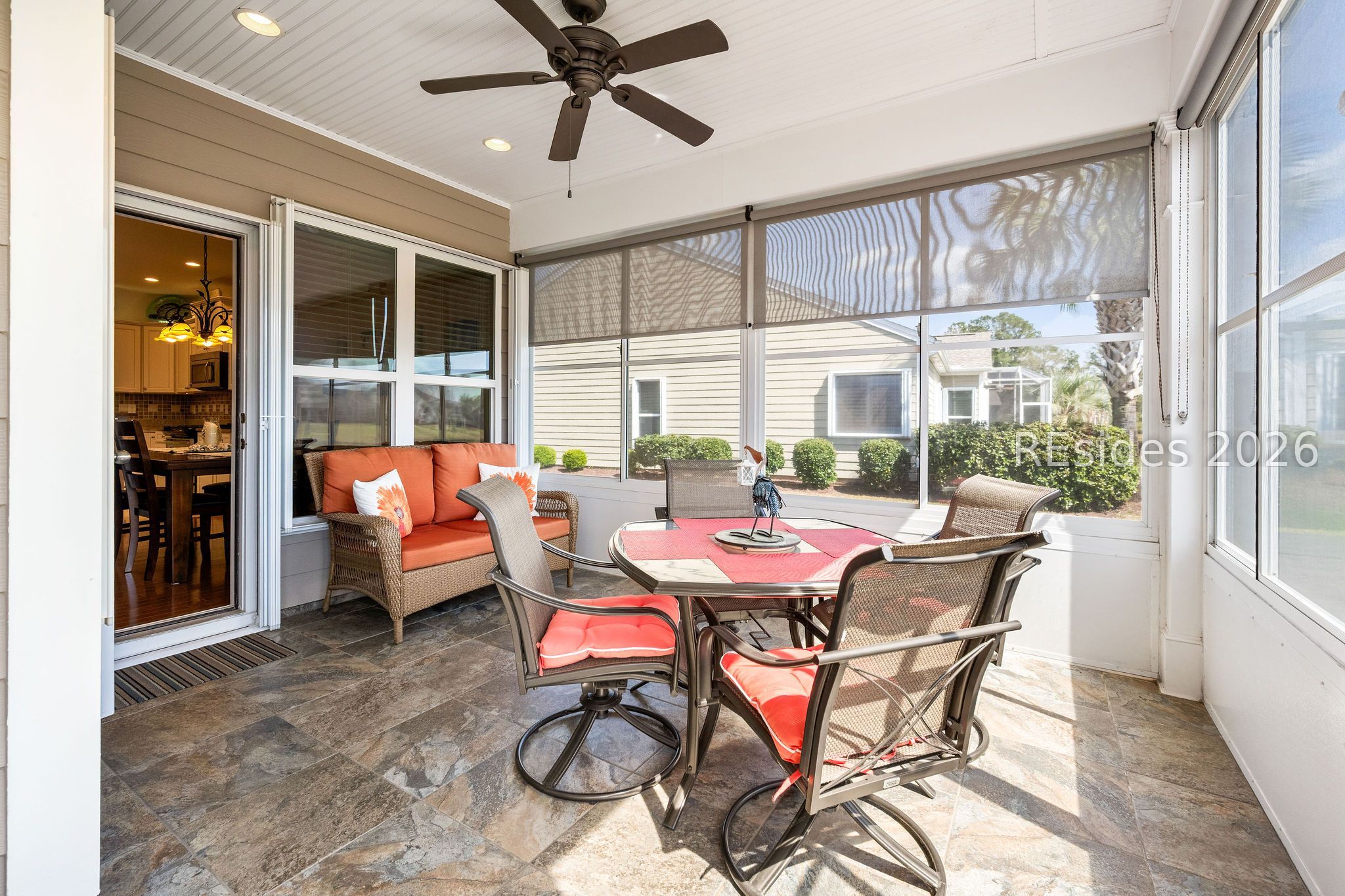 Discover the perfect home to complement your active yet relaxed 55+ lifestyle. This thoughtfully designed 2-bedroom, 2-bath residence with a dedicated library offers comfortable living with beautiful wood flooring throughout the main living areas-no carpet. The well-appointed kitchen features upgraded cabinetry, a gas range, and stainless steel appliances, ideal for both everyday living and entertaining. The spacious primary suite includes double vanities, a large walk-in closet, and a separate shower for added comfort. Enjoy Lowcountry living at its finest from the expansive screened porch with vinyl slider windows, or step outside to the paver patio and pergola overlooking a tranquil lagoon. Watch waterfowl glide by as you savor your morning coffee, unwind with a good book, or host friends for grilling and evening cocktails. Additional highlights include functional hurricane protection, convenient permanent attic stairs for easy storage access, and an oversized two-car garage-enhancing both peace of mind and everyday convenience. New roof installed 9/2022 and new HVAC system installed 6/2021.