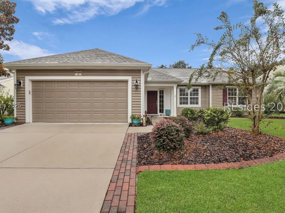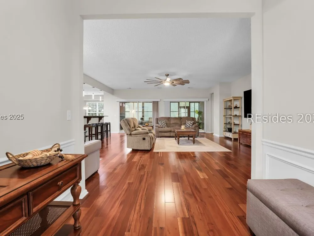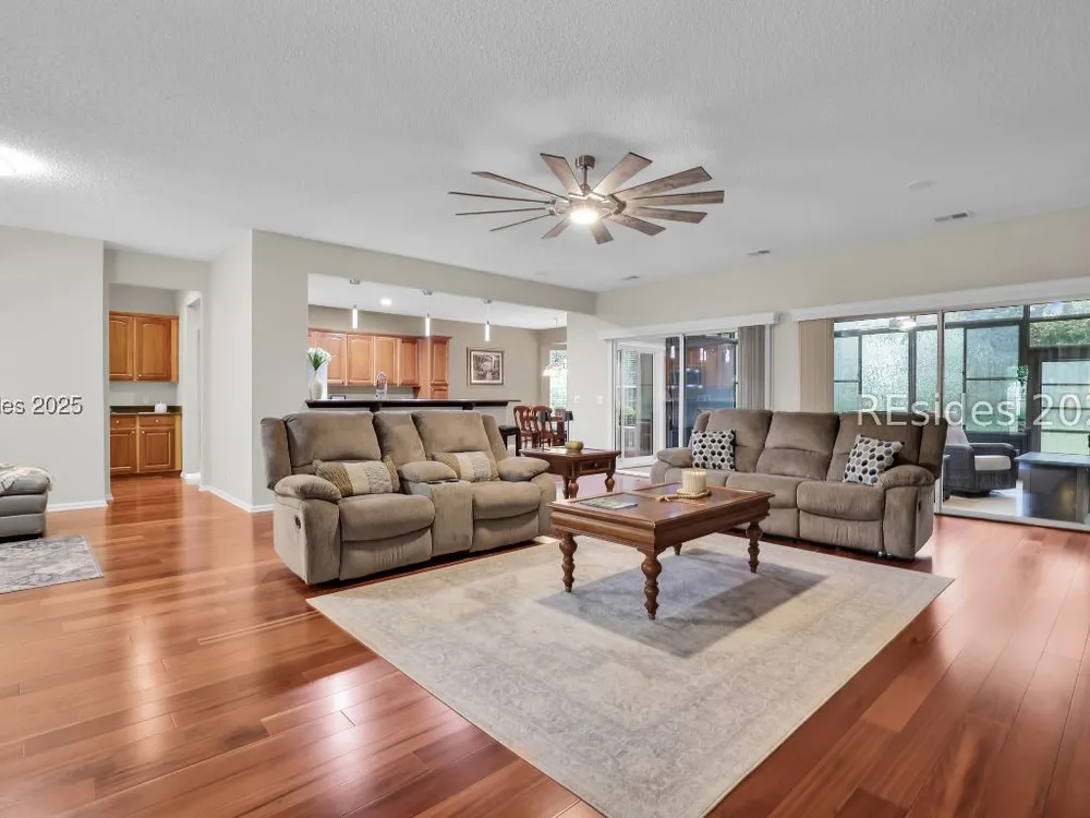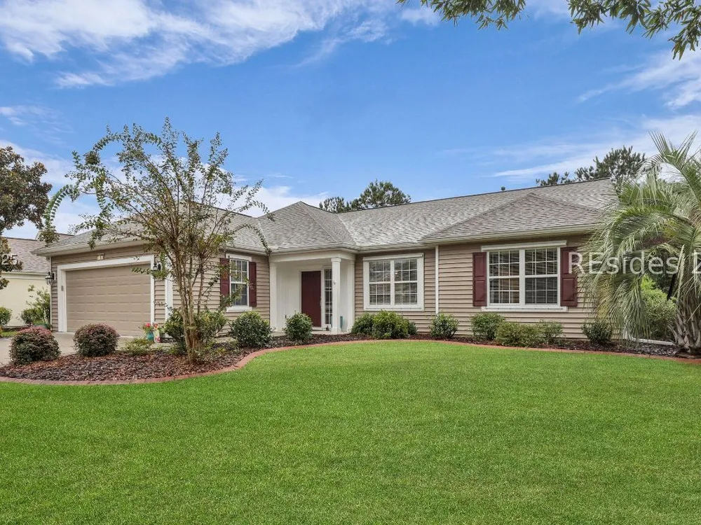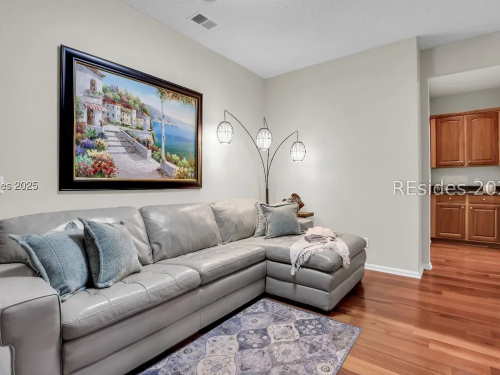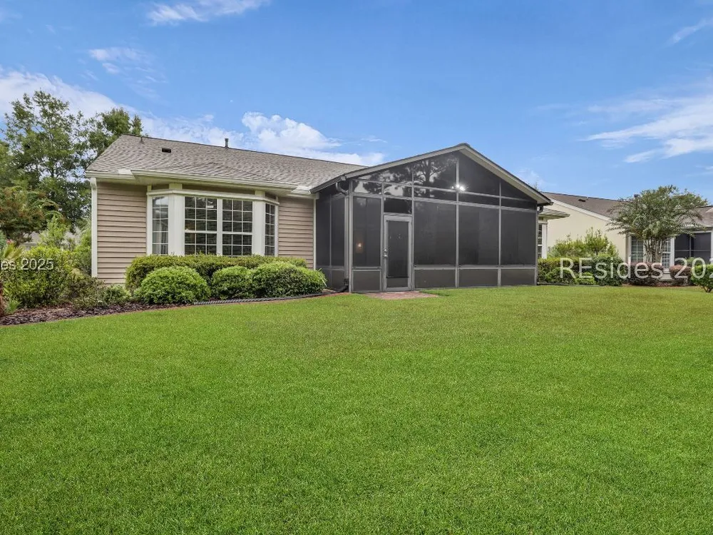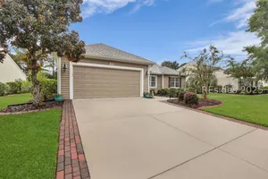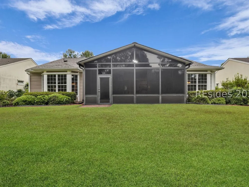 Welcome to this beautifully maintained Dogwood model in the vibrant 55+ community of Sun City Hilton Head! Gleaming hardwood floors flow through the open layout, while the versatile den with Murphy bed provides flexible living and welcomes extra guests. Wainscoting graces the foyer and dining room, and the kitchen shines with timeless cherry wood cabinetry, stainless appliances, and a gas stove for cooking consistency. Both baths have been tastefully updated with marble-like tile and sleek glass barn door hardware. Step out to the vaulted, hard-roof, 4 season lanai and enjoy year round private wooded views. Beyond your doorstep, Sun City offers a lifestyle like no other three golf courses, six pools, pickleball and tennis courts, walking trails, and over 100 social clubs to fill your days with activity and connection.