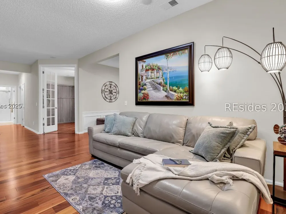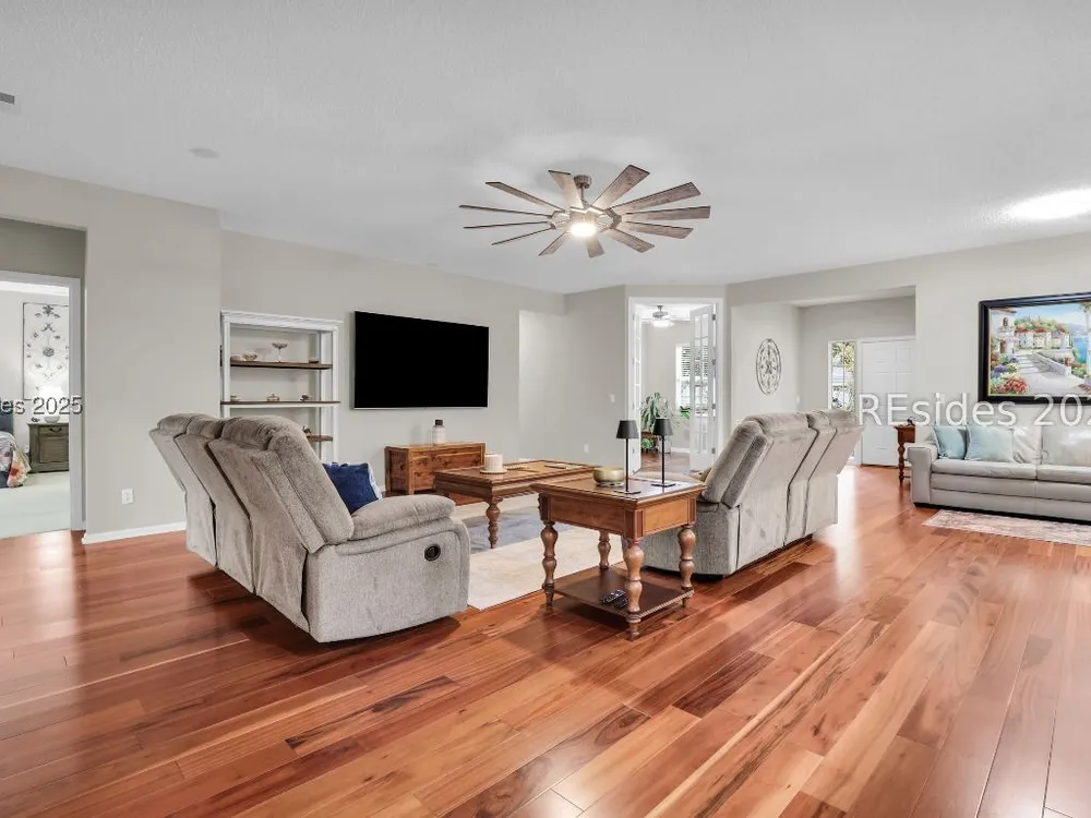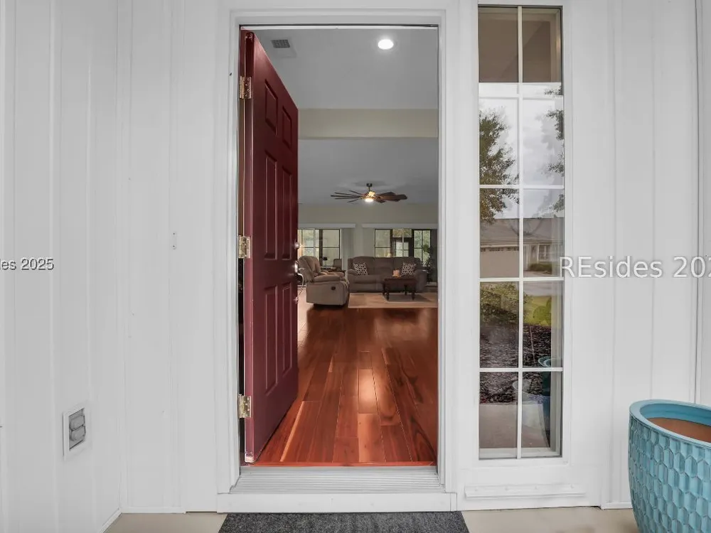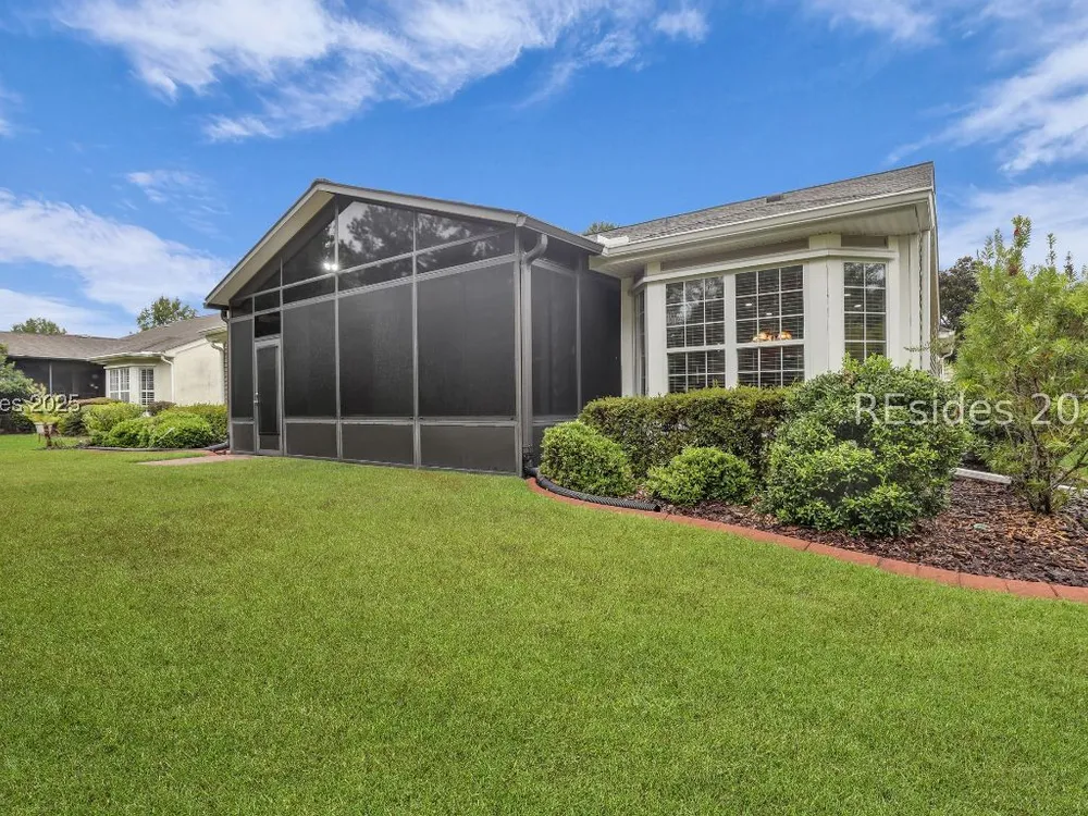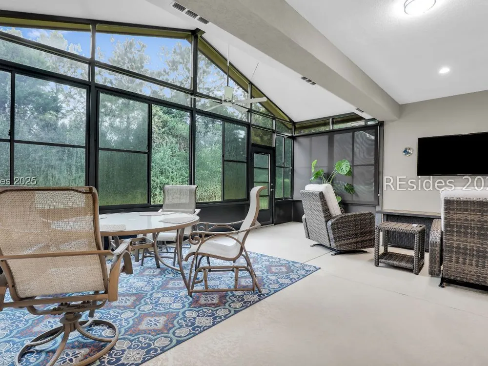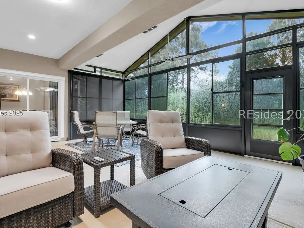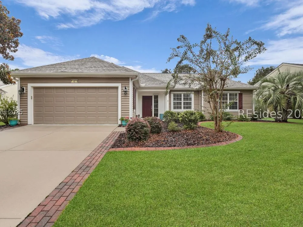 Welcome to this beautifully maintained Dogwood model in the vibrant 55+ community of Sun City Hilton Head! Gleaming hardwood floors flow through the open layout, while the versatile den with Murphy bed provides flexible living and welcomes extra guests. Wainscoting graces the foyer and dining room, and the kitchen shines with timeless cherry wood cabinetry, stainless appliances, and a gas stove for cooking consistency. Both baths have been tastefully updated with marble-like tile and sleek glass barn door hardware. Step out to the vaulted, hard-roof, 4 season lanai and enjoy year round private wooded views. Beyond your doorstep, Sun City offers a lifestyle like no other three golf courses, six pools, pickleball and tennis courts, walking trails, and over 100 social clubs to fill your days with activity and connection.