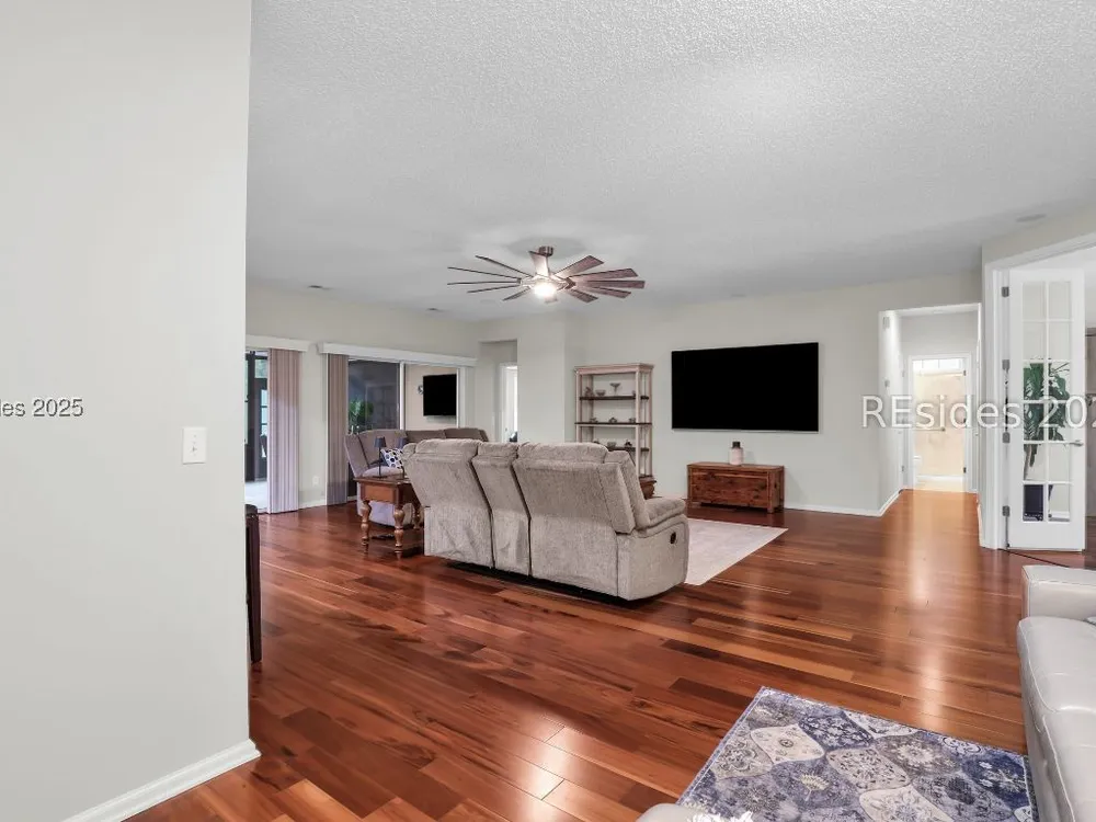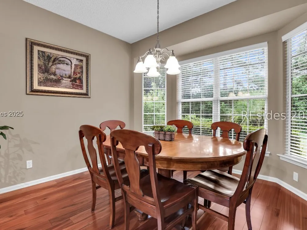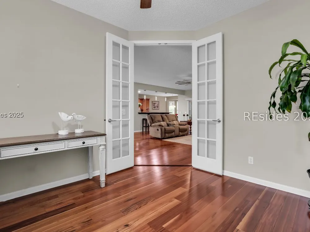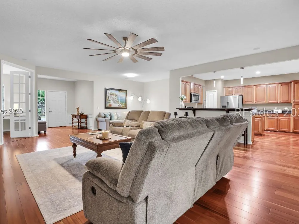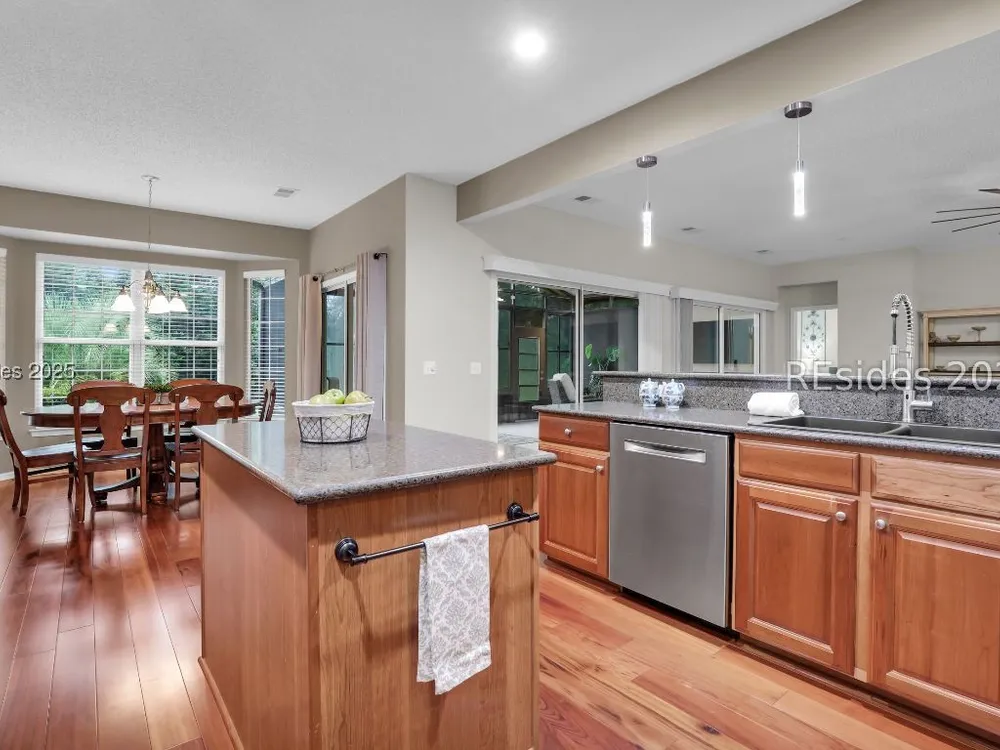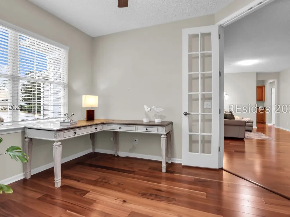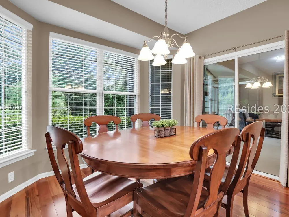 Welcome to this beautifully maintained Dogwood model in the vibrant 55+ community of Sun City Hilton Head! Gleaming hardwood floors flow through the open layout, while the versatile den with Murphy bed provides flexible living and welcomes extra guests. Wainscoting graces the foyer and dining room, and the kitchen shines with timeless cherry wood cabinetry, stainless appliances, and a gas stove for cooking consistency. Both baths have been tastefully updated with marble-like tile and sleek glass barn door hardware. Step out to the vaulted, hard-roof, 4 season lanai and enjoy year round private wooded views. Beyond your doorstep, Sun City offers a lifestyle like no other three golf courses, six pools, pickleball and tennis courts, walking trails, and over 100 social clubs to fill your days with activity and connection.