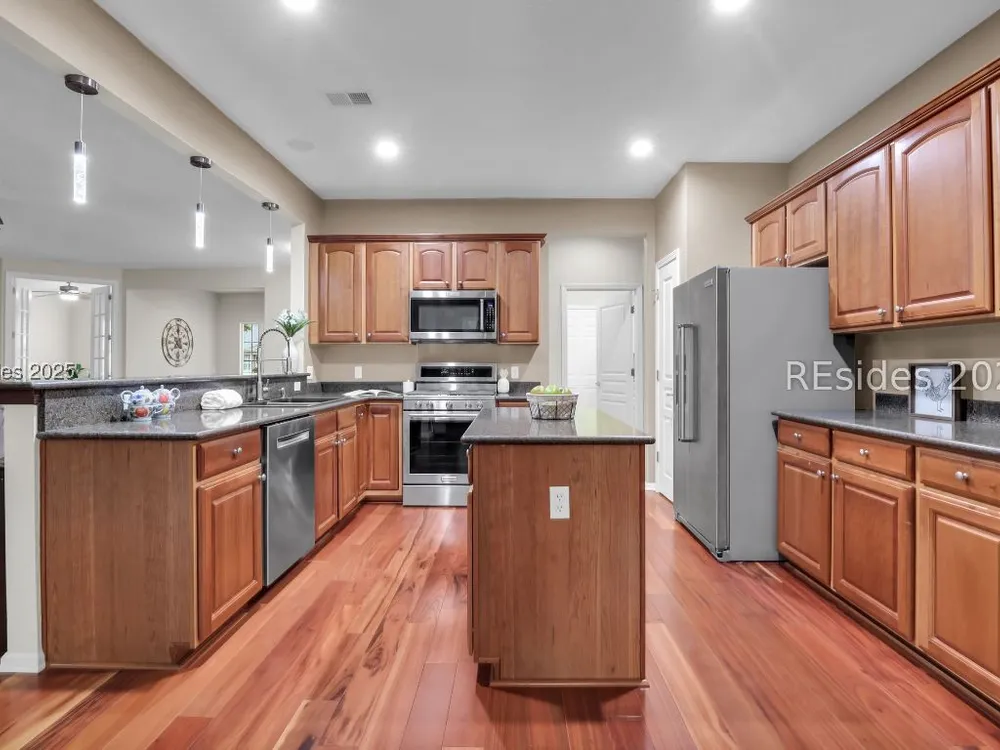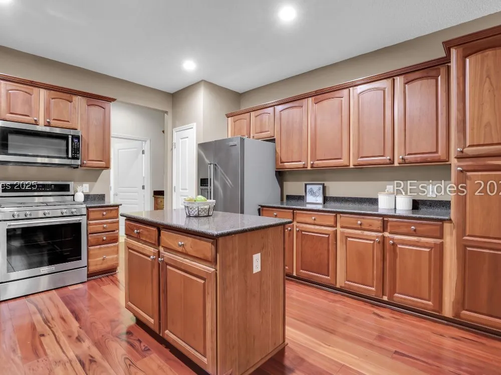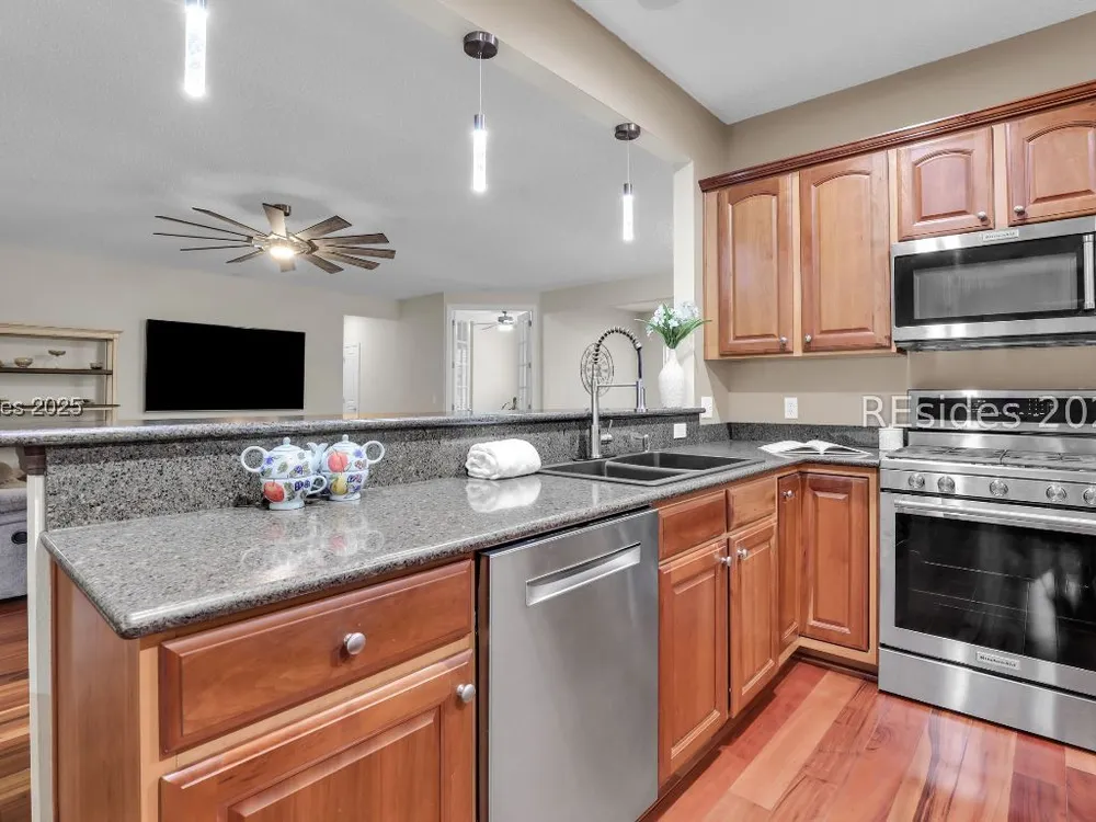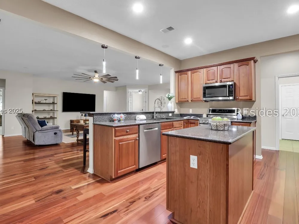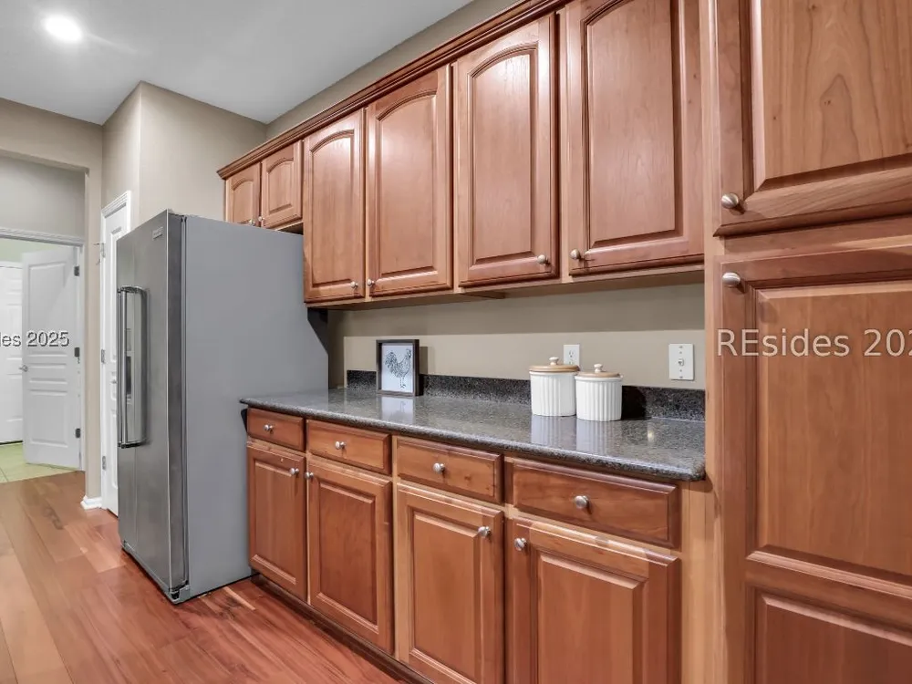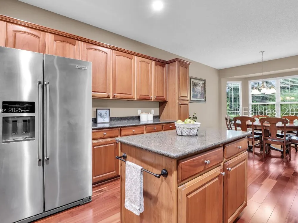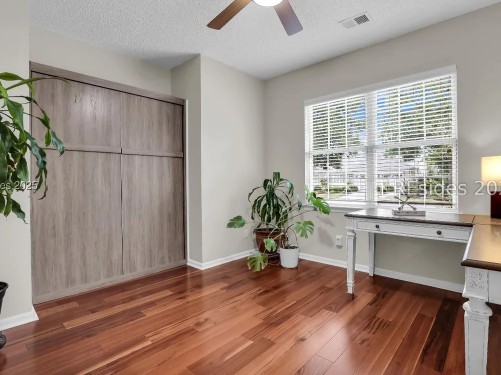 Welcome to this beautifully maintained Dogwood model in the vibrant 55+ community of Sun City Hilton Head! Gleaming hardwood floors flow through the open layout, while the versatile den with Murphy bed provides flexible living and welcomes extra guests. Wainscoting graces the foyer and dining room, and the kitchen shines with timeless cherry wood cabinetry, stainless appliances, and a gas stove for cooking consistency. Both baths have been tastefully updated with marble-like tile and sleek glass barn door hardware. Step out to the vaulted, hard-roof, 4 season lanai and enjoy year round private wooded views. Beyond your doorstep, Sun City offers a lifestyle like no other three golf courses, six pools, pickleball and tennis courts, walking trails, and over 100 social clubs to fill your days with activity and connection.