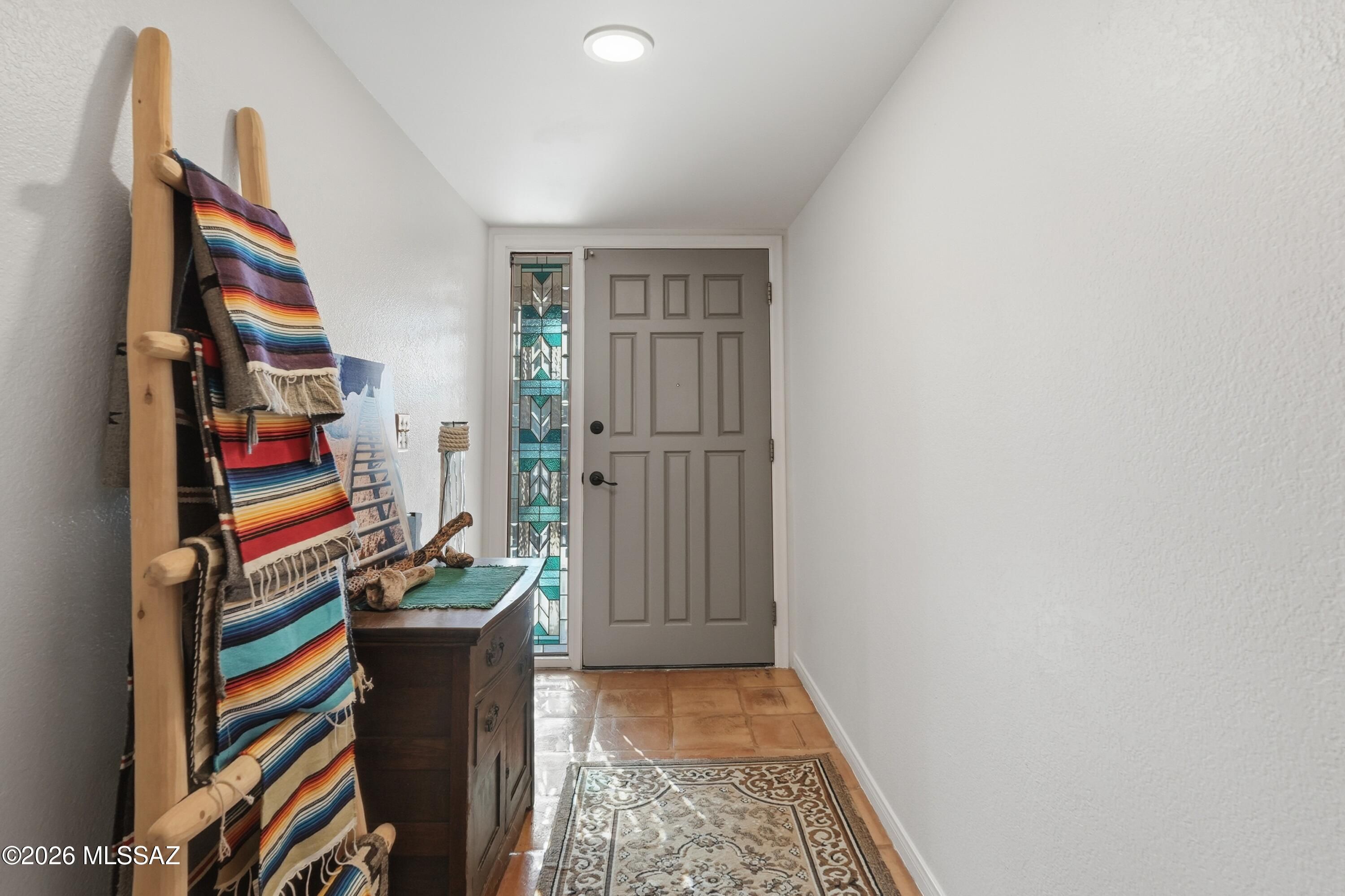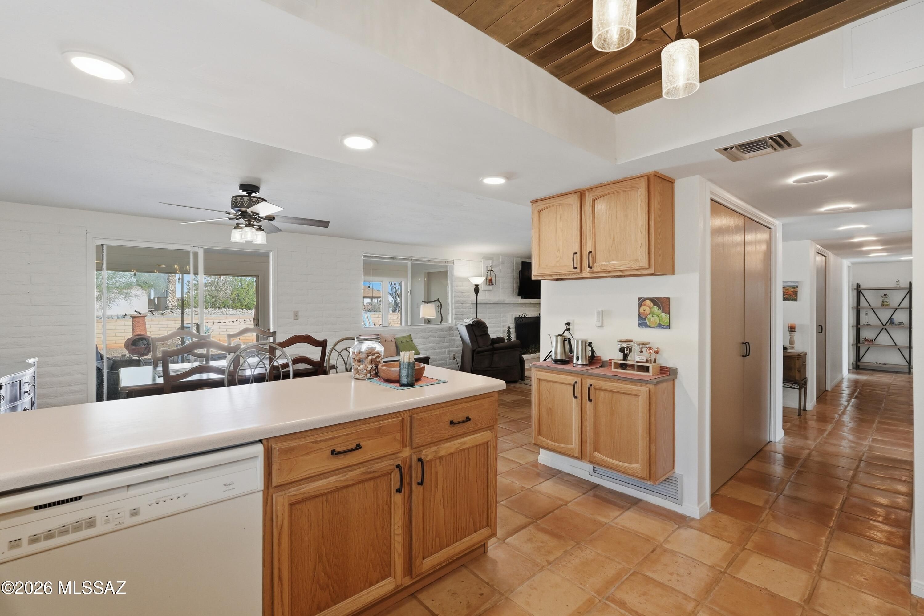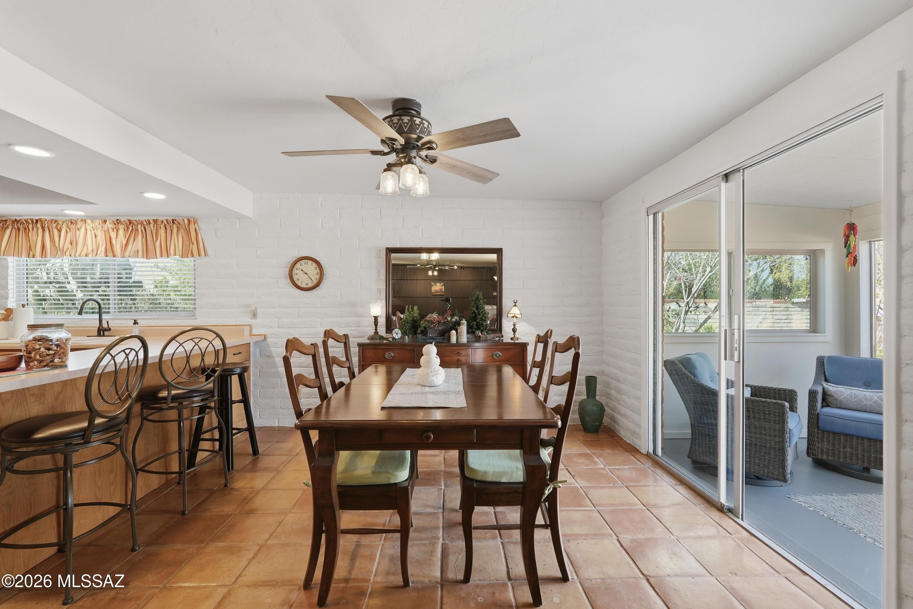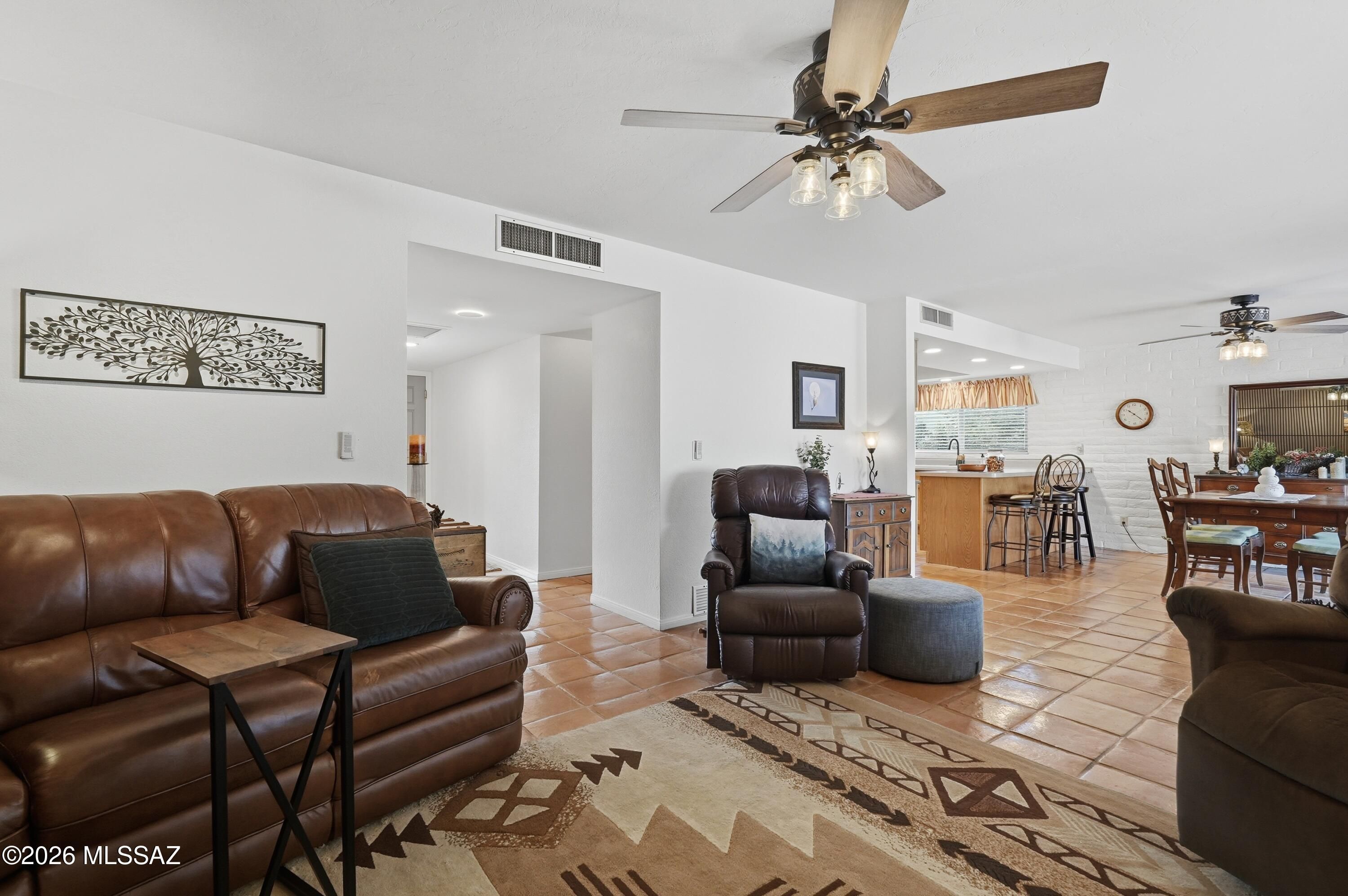 Nestled in Green Valley with breathtaking mountain vistas, this loving home welcomes you with Saltillo tile, fresh modern lighting, and abundant natural light from new windows. The open kitchen has stainless appliances, while bedrooms feature new ceiling fans for comfort. The spacious Arizona room, complete with sliding doors and its own storage, invites year-round enjoyment. Outside, a lush desert landscape includes saguaro cacti, peach and Meyer lemon trees, and an upgraded irrigation system. The garage is insulated with storage galore. As part of Green Valley Rec, you'll enjoy access to championship golf, multiple pools, fitness centers, and vibrant social activities. Sellers are including a home warranty for peace of mind. Move-in ready and bursting with charm!