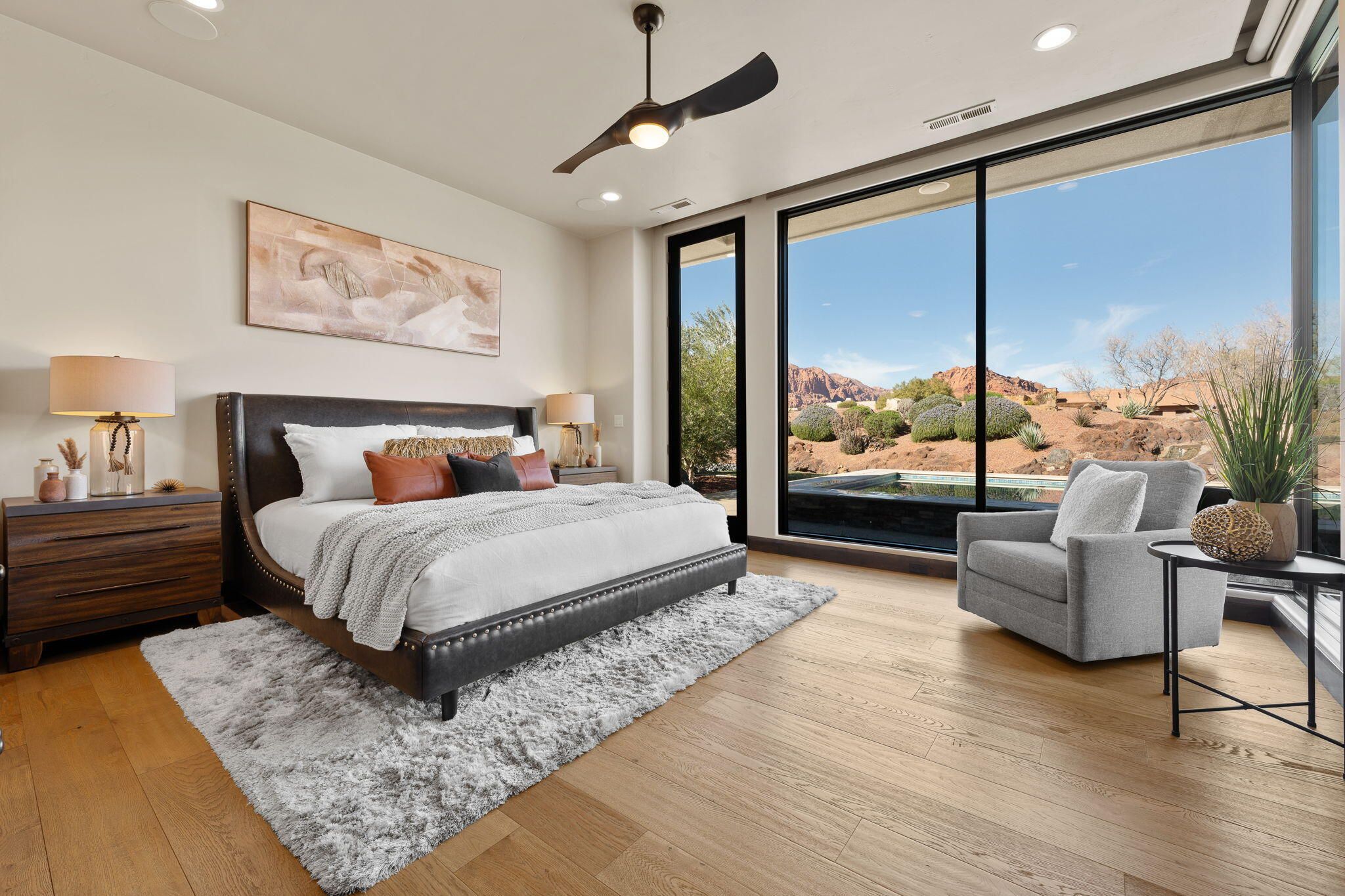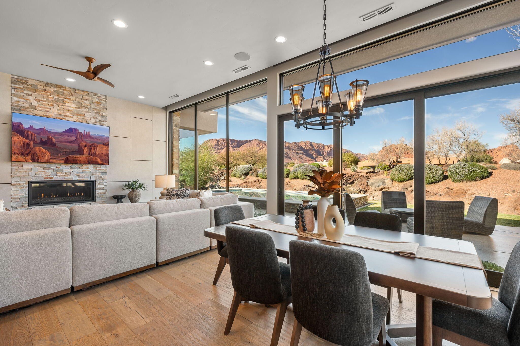 Feel right at home in this Warm Contemporary Oasis, nestled perfectly in the heart of Snow Canyon. This immaculate former Split Rock Model Home, located in the highly coveted and gated The Reserve at Entrada, has stunning views of Red Mountain, Padre Canyon, Snow Canyon, and the Red Cliffs Desert Reserve. Open your doors to the sound of several waterfalls, while warming by one of the 2 fireplaces inside and out. Oversized 3 car Garage + bonus storage, Roof Top Patio, Thermador appliances, and much more. Furniture available on a separate bill of sale. Associate Membership to Entrada Country Club required with purchase. See agent for monthly fee details. Visit https://www.golfentrada.com/ for Entrada Country Club Amenity info.