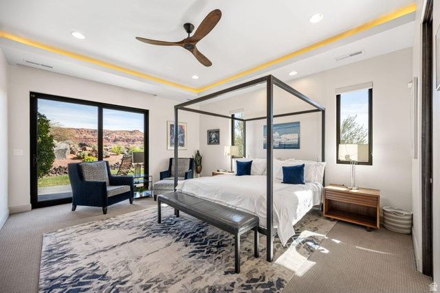 Welcome to Reserve of Entrada Snow Canyon Patio Homes, a stunning contemporary residence perfectly positioned on a premier corner lot in Ivins, offering breathtaking mountain views and seamless indoor-outdoor living. Designed with both comfort and sophistication in mind, the spacious layout showcases a statement fireplace framed in stacked stone, expansive living areas, and dramatic multi-panel sliding glass doors that open completely to the backyard, blending the beauty of the desert landscape with refined interior spaces. The thoughtfully designed kitchen features upgraded appliances, including an induction cooktop, while a large walk-in pantry with a second refrigerator provides exceptional storage and functionality. A generous mudroom adds everyday convenience, while the office has 2 built in desks to facilitate day-to-day clerical tasks. The primary suite is a private retreat with direct outdoor access and a luxurious en-suite bath featuring a walk-in shower and separate soaking tub. Every detail was designed with intention. Outdoor living surrounds the home on every side. Enjoy peaceful mornings taking place on the east side of the home, ideal for lunch in the shade, and comfortable outdoor lounging and socializing, all set against unobstructed red rock views and a tranquil waterfall feature. Energy efficiency meets modern luxury with solar panels and whole house battery system that allow the owners to operate off the grid. The spacious 3-car garage includes dedicated storage rooms and a vehicle charger for electric and hybrid cars, adding both practicality and forward-thinking design. Set within one of Ivins' most desirable communities, this property captures the essence of elevated living.