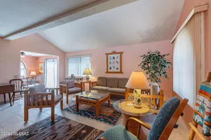 Before you enter this fully furnished freestanding home, pause along the front walkway and patio to admire the mountain views. Savor the magnitude and beauty of Madera Canyon and its twin peaks. The viewing deck on the rear patio offers a panoramic perspective of the northern range. The exterior block construction, arched windows and combination tile/built-up roof lines present an appealing Southwestern design. The tile roof creates a vaulted ceiling, light interior with clerestory windows in the living/dining area. Light-colored ceramic tile flows throughout this open floorplan (with no popcorn ceilings) into the den, kitchen and split bedrooms. Both bedrooms feature a walk-in closet and privacy. All rooms lead to the large kitchen with a breakfast bar.