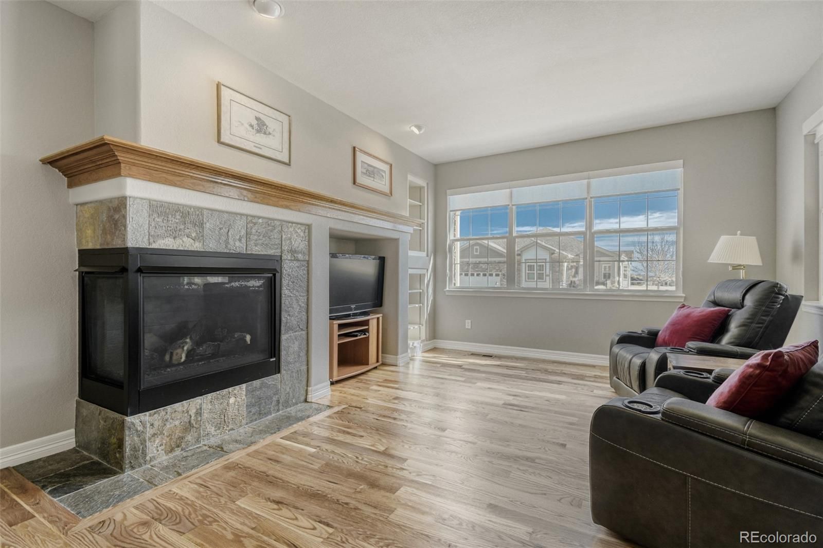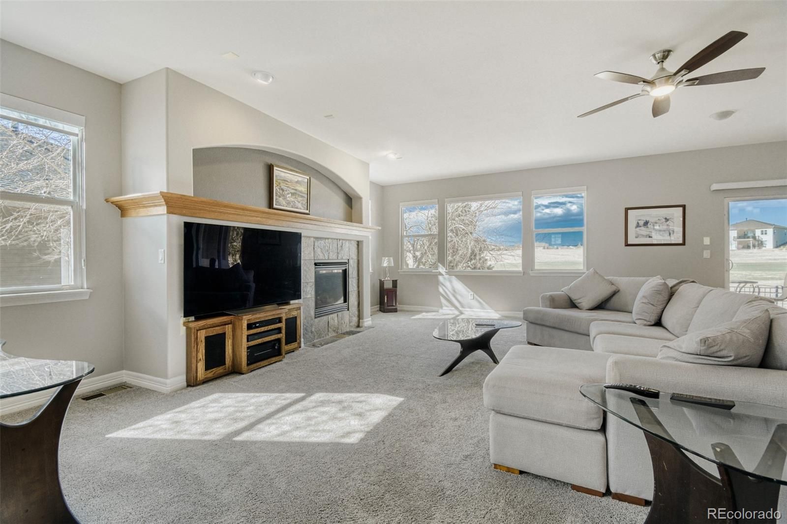 Welcome to the highly sought after Heritage Todd Creek Community. This home sits on the 10th hole of the Todd Creek Golf course - positioned well so few golf balls are hit on property. One of the best locations in Heritage Todd Creek, it has expansive views of the 10th and 11th holes, and mountains. Imagine sitting on your back covered patio with your favorite beverage enjoying a classic Colorado sunset or quiet morning while looking out on this expansive view. This active adult community features 50+ clubs/activities. So something for everyone to participate in. A lot of these activities happen within the expansive club house area, which includes an indoor and outdoor pool, Hot tub + Locker room with showers, tennis/pickleball courts, fitness center, ball room, billiard room, card room, conference rooms that are used for many of the club activities, a library, and an onsite restaurant. This home boasts an abundance of natural light and has many upgrades/Features including: Kitchen counter and back splash, grab bars in Primary bath shower and tub, Ceiling fans, hardwoods and Built-in TV stand in the family room, 4 year old carpet in main level, 2 year old carpet in the basement, Brand new interior paint, 2 year old blinds, wired for surround sound, Front and back landscaping including concrete edging, and an artificial turf area, hardwoods just refinished, carpets cleaned, dishwasher, microwave, and refrigerator are 3 years old. Finally, a new garage door and opener. Also has a whole house vacuum system, and humidifier, and there's plenty of storage space in the basement. Don't miss this one. It's priced to sell and so won't last long. Note: Mounted TV in basement and any remaining furniture in the home can be included, if interested. (not the coffee tables, or the chairs/table in the hearth room)