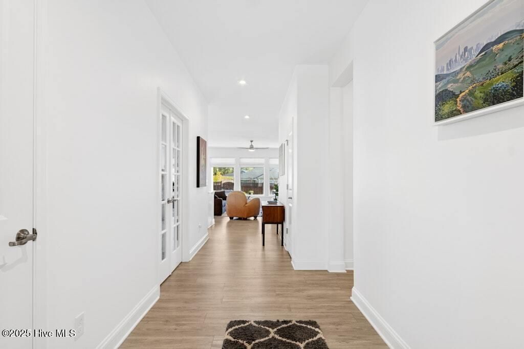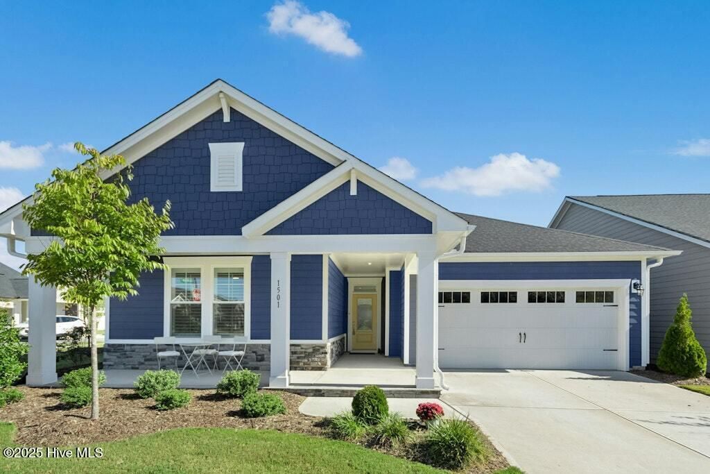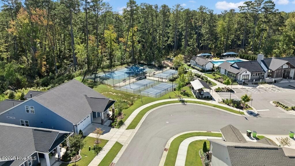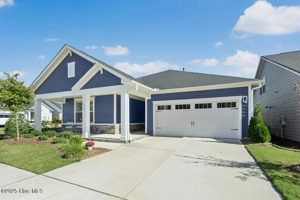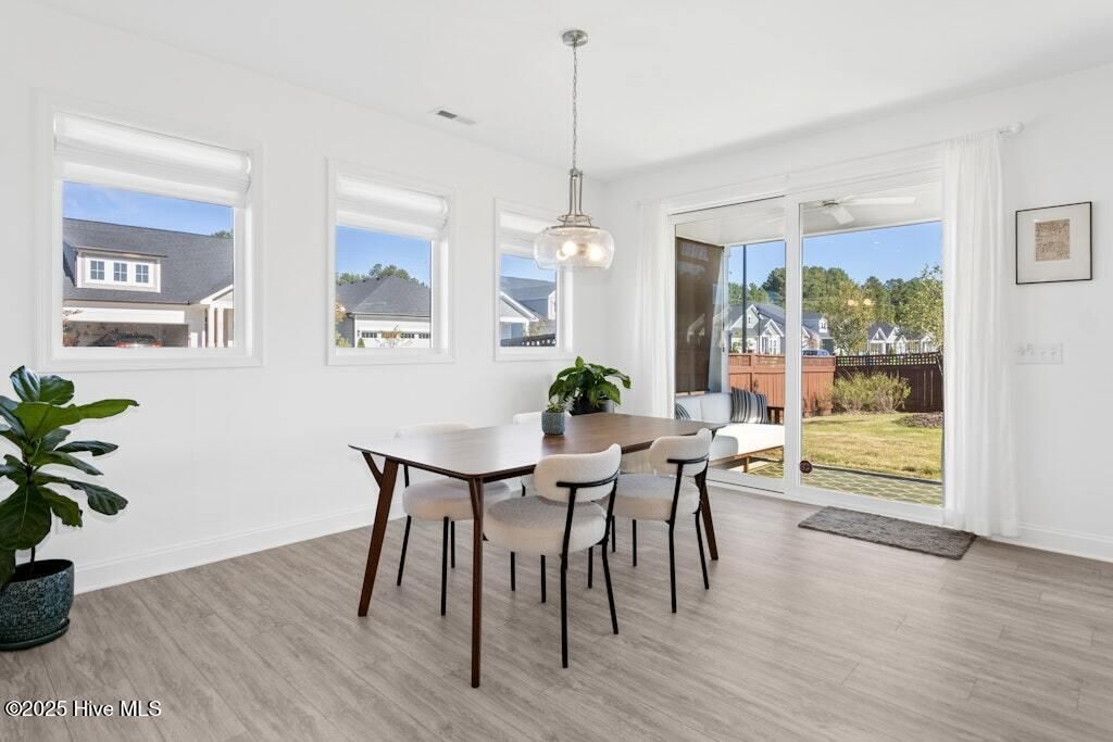 Welcome to Encore at Wendell Falls, a premier 55+ community offering sidewalks, and community amenities GALORE to include Resort style pool, exercise room, tennis and pickleball courts, fitness center, indoor and outdoor fireplaces, Big screen TVs, kitchen area, meeting in multipurpose room, walking trails, and scenic Lake Oliver and MORE--everything you need for luxury, low-maintenance living. This beautiful corner-lot ONE LEVEL home features fiber cement siding with stone and shake style accents, a GRAND covered front porch, and a welcoming entryway. Inside, 9-foot ceilings and luxury vinyl plank flooring extend throughout the main living areas. The spacious foyer opens to a bright family room filled with natural light from large windows dressed with shades when privacy is needed. The adjoining dining area features even more windows and a sliding door leading to a COVERED PATIO and additional outdoor living space with a retractable awning--perfect for entertaining or relaxing. The kitchen impresses with QUARTZ countertops, an elegant TILE backsplash, enormous island with eat-at bar, walk-in pantry, and appliances including wall oven, cooktop, microwave, dishwasher, and refrigerator and disposal. The primary suite offers a TRAY ceiling, plantation shutters, and a luxurious ensuite bath with dual sinks, TILE shower with bench seat, and a generous walk-in closet with lots of shelving. Two additional bedrooms provide flexible space, including one with its own private bath and another currently used as an office with French doors and built-in shelving. A conveniently located tile-floor laundry room lends ample space. A built-in cubby area is just off the two-car garage entry to the home. Outside, enjoy the FENCED backyard, COVERED PATIO, and extended patio with retractable awning for year-round enjoyment. Experience the perfect blend of comfort, style, and community living--welcome home to Encore at Wendell Falls.