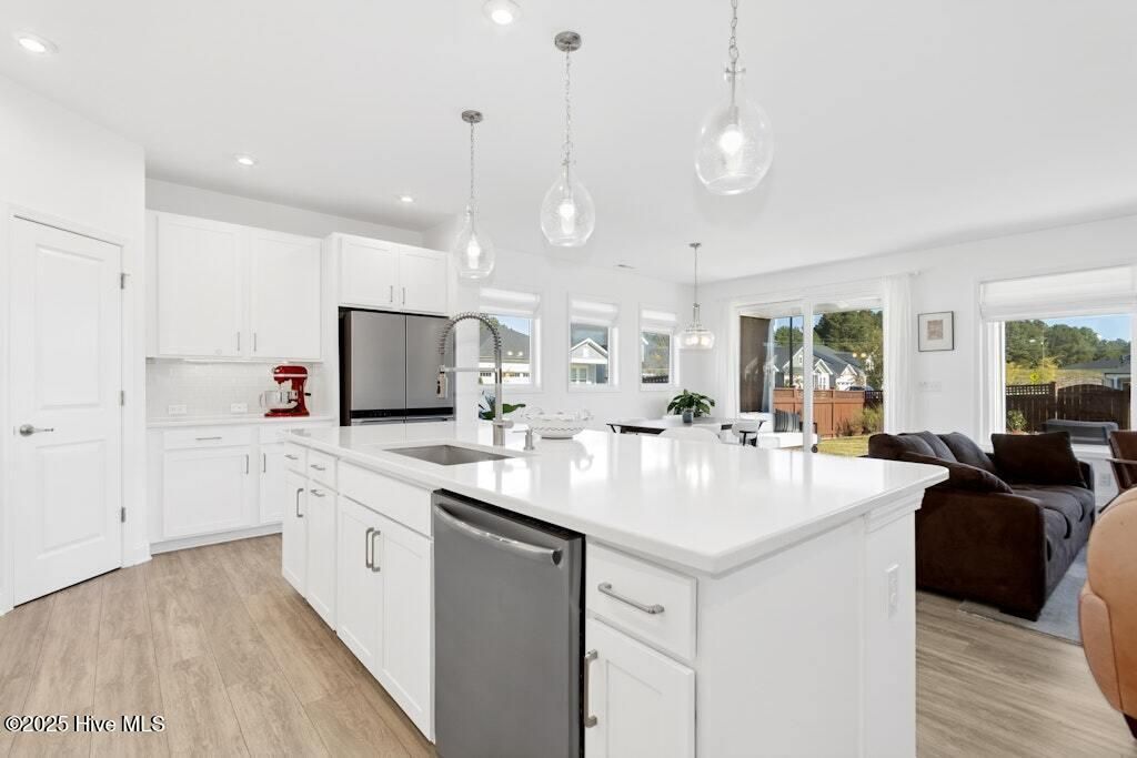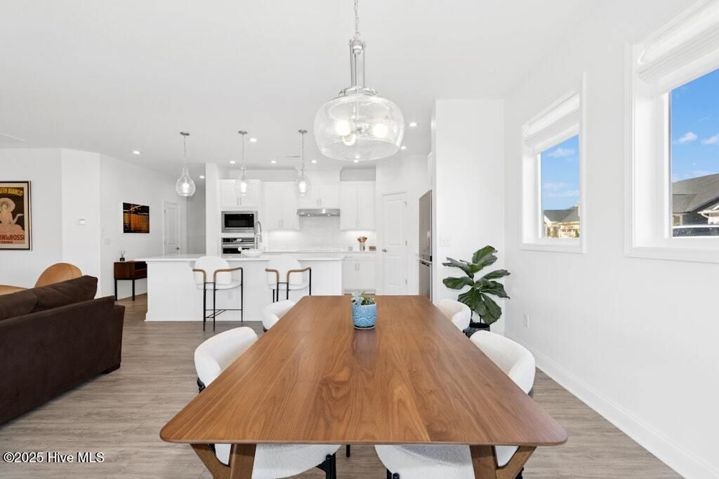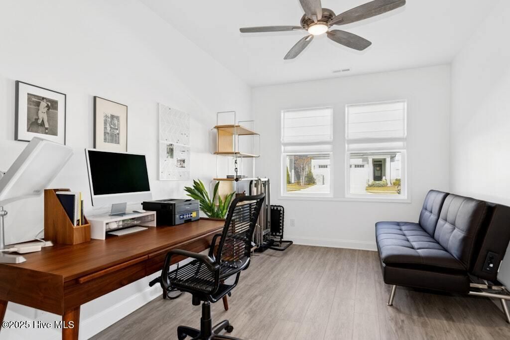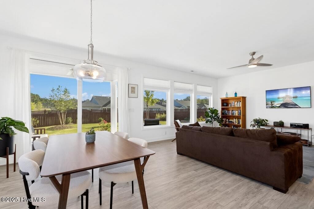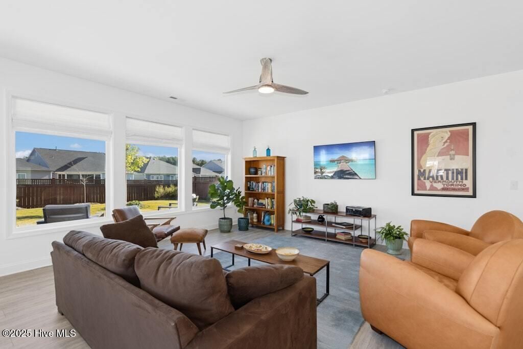 Welcome to Encore at Wendell Falls, a premier 55+ community offering sidewalks, and community amenities GALORE to include Resort style pool, exercise room, tennis and pickleball courts, fitness center, indoor and outdoor fireplaces, Big screen TVs, kitchen area, meeting in multipurpose room, walking trails, and scenic Lake Oliver and MORE--everything you need for luxury, low-maintenance living. This beautiful corner-lot ONE LEVEL home features fiber cement siding with stone and shake style accents, a GRAND covered front porch, and a welcoming entryway. Inside, 9-foot ceilings and luxury vinyl plank flooring extend throughout the main living areas. The spacious foyer opens to a bright family room filled with natural light from large windows dressed with shades when privacy is needed. The adjoining dining area features even more windows and a sliding door leading to a COVERED PATIO and additional outdoor living space with a retractable awning--perfect for entertaining or relaxing. The kitchen impresses with QUARTZ countertops, an elegant TILE backsplash, enormous island with eat-at bar, walk-in pantry, and appliances including wall oven, cooktop, microwave, dishwasher, and refrigerator and disposal. The primary suite offers a TRAY ceiling, plantation shutters, and a luxurious ensuite bath with dual sinks, TILE shower with bench seat, and a generous walk-in closet with lots of shelving. Two additional bedrooms provide flexible space, including one with its own private bath and another currently used as an office with French doors and built-in shelving. A conveniently located tile-floor laundry room lends ample space. A built-in cubby area is just off the two-car garage entry to the home. Outside, enjoy the FENCED backyard, COVERED PATIO, and extended patio with retractable awning for year-round enjoyment. Experience the perfect blend of comfort, style, and community living--welcome home to Encore at Wendell Falls.