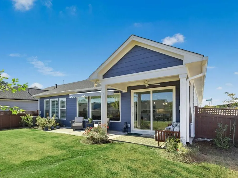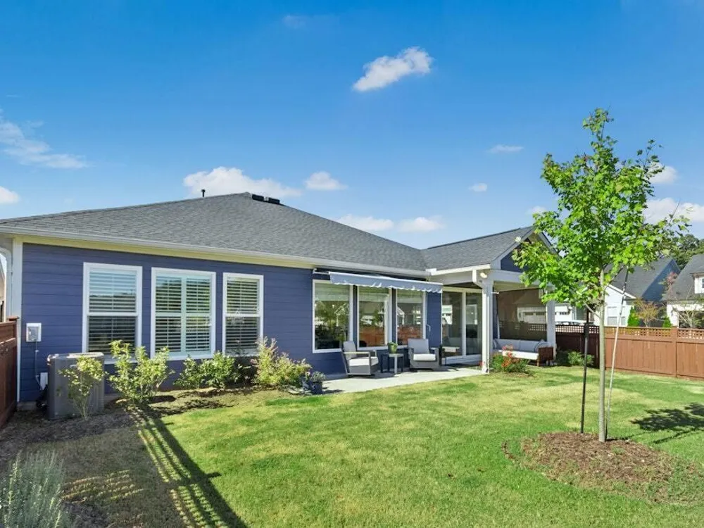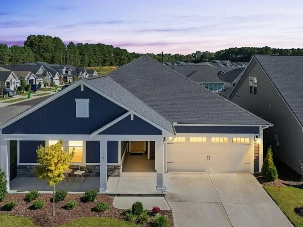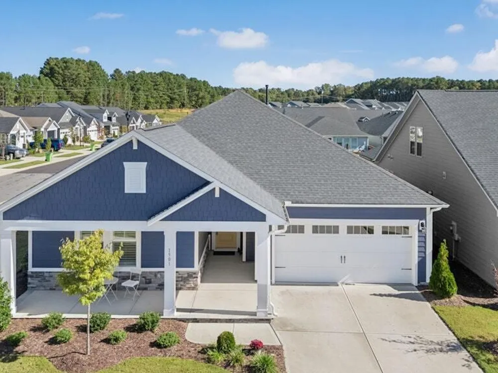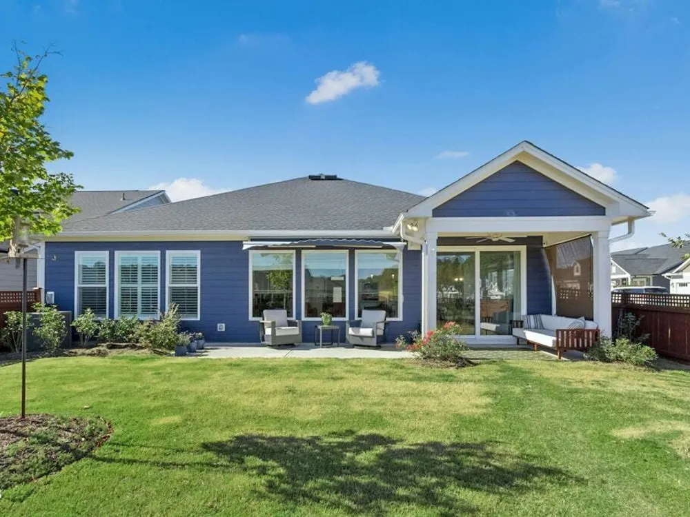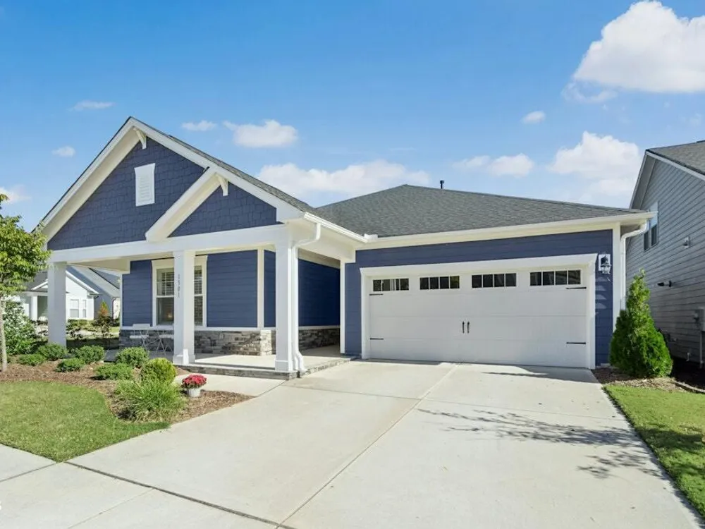Welcome to Encore at Wendell Falls, a premier 55+ community offering sidewalks, and community amenities GALORE to include Resort style pool, exercise room, tennis and pickleball courts, fitness center, indoor and outdoor fireplaces, Big screen TVs, kitchen area, meeting in multipurpose room, walking trails, and scenic Lake Oliver and MORE—everything you need for luxury, low-maintenance living. This beautiful corner-lot ONE LEVEL home features fiber cement siding with stone and shake style accents, a GRAND covered front porch, and a welcoming entryway. Inside, 9-foot ceilings and luxury vinyl plank flooring extend throughout the main living areas. The spacious foyer opens to a bright family room filled with natural light from large windows dressed with shades when privacy is needed. The adjoining dining area features even more windows and a sliding door leading to a COVERED PATIO and additional outdoor living space with a retractable awning—perfect for entertaining or relaxing. The kitchen impresses with QUARTZ countertops, an elegant TILE backsplash, enormous island with eat-at bar, walk-in pantry, and appliances including wall oven, cooktop, microwave, dishwasher, and refrigerator and disposal. The primary suite offers a TRAY ceiling, plantation shutters, and a luxurious ensuite bath with dual sinks, TILE shower with bench seat, and a generous walk-in closet with lots of shelving. Two additional bedrooms provide flexible space, including one with its own private bath and another currently used as an office with French doors and built-in shelving. A conveniently located tile-floor laundry room lends ample space. A built-in cubby area is just off the two-car garage entry to the home. Outside, enjoy the FENCED backyard, COVERED PATIO, and extended patio with retractable awning for year-round enjoyment. Experience the perfect blend of comfort, style, and community living—welcome home to Encore at Wendell Falls.