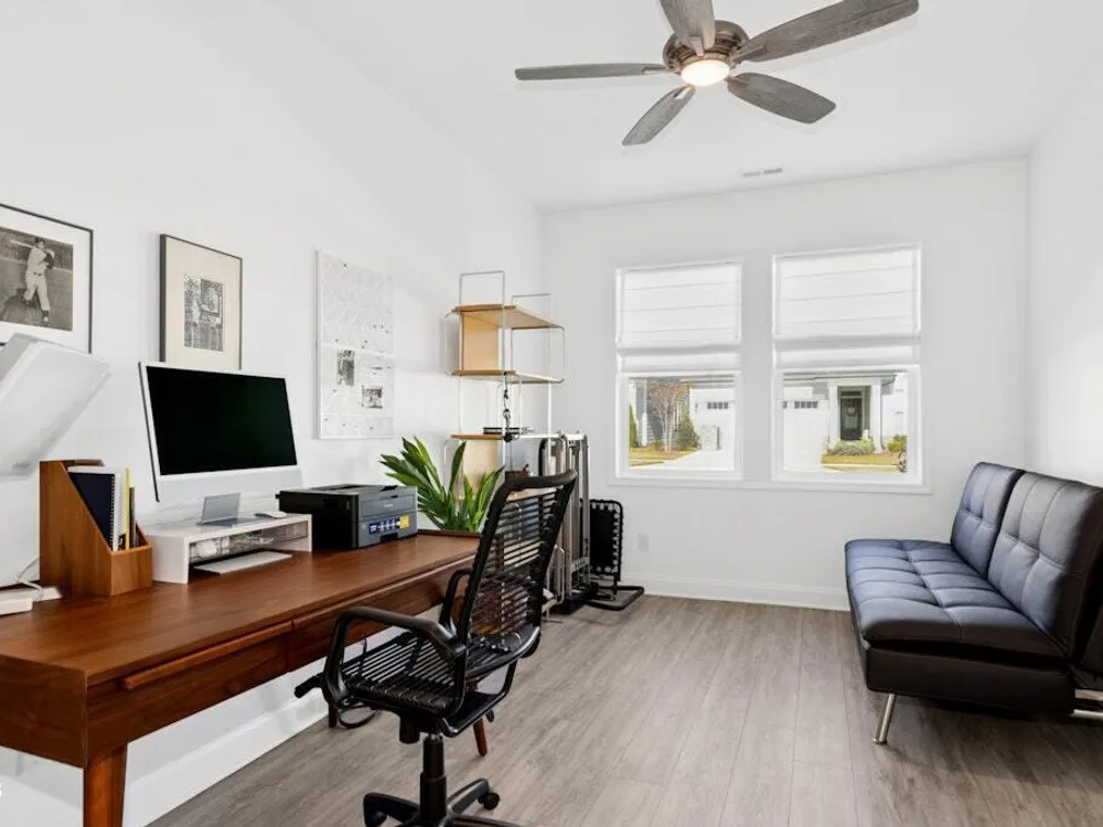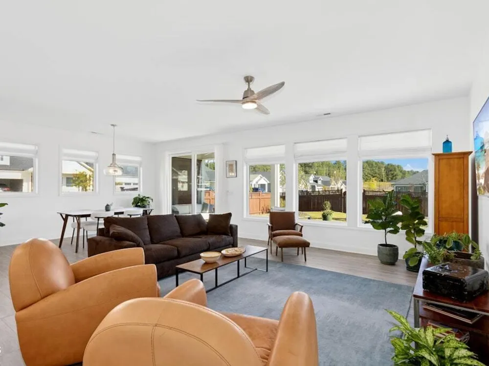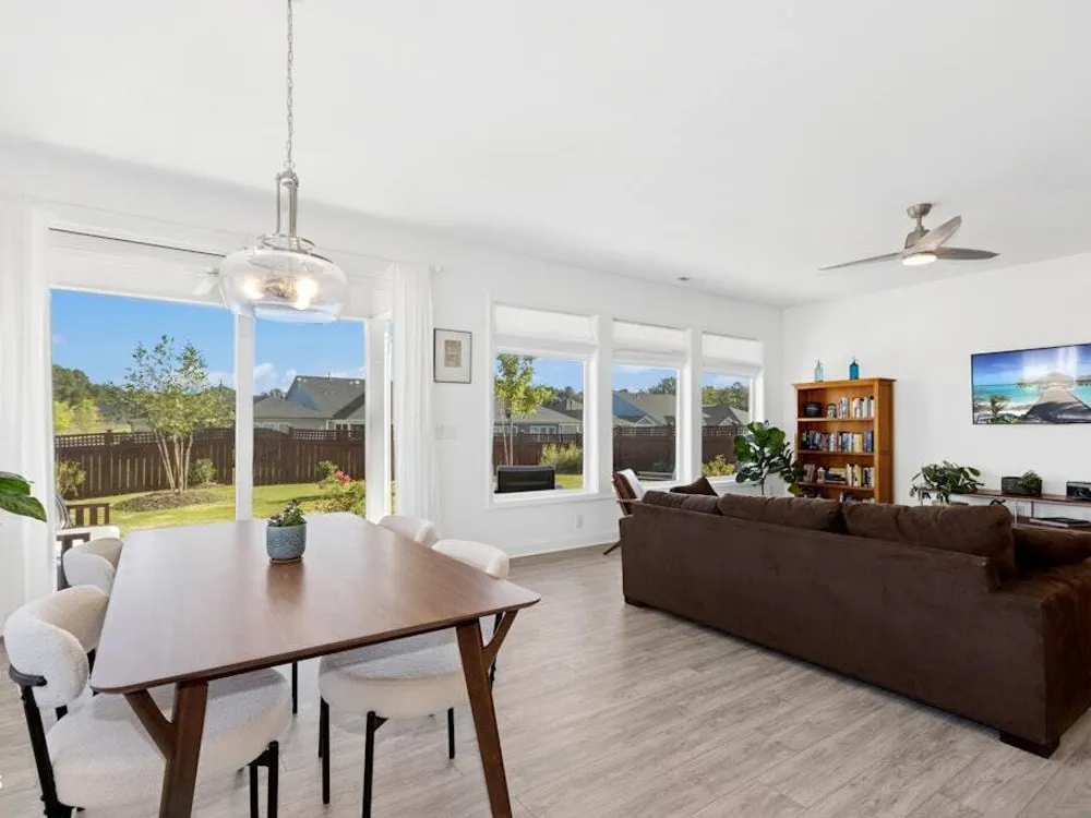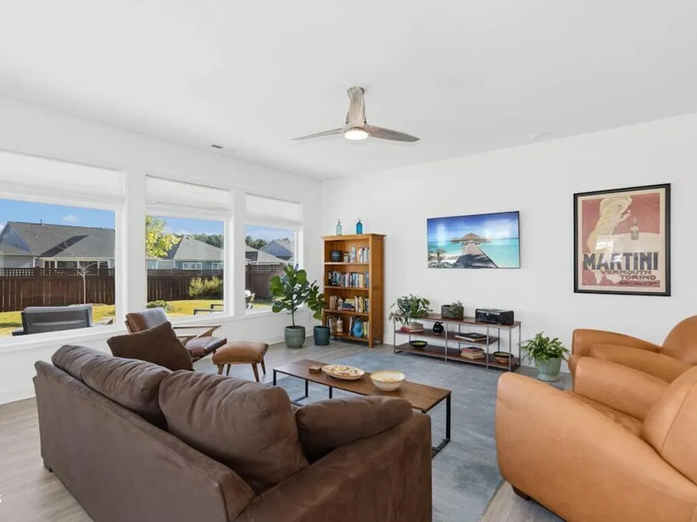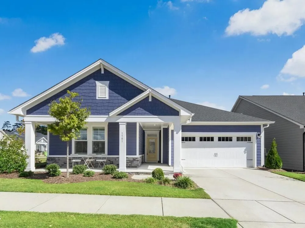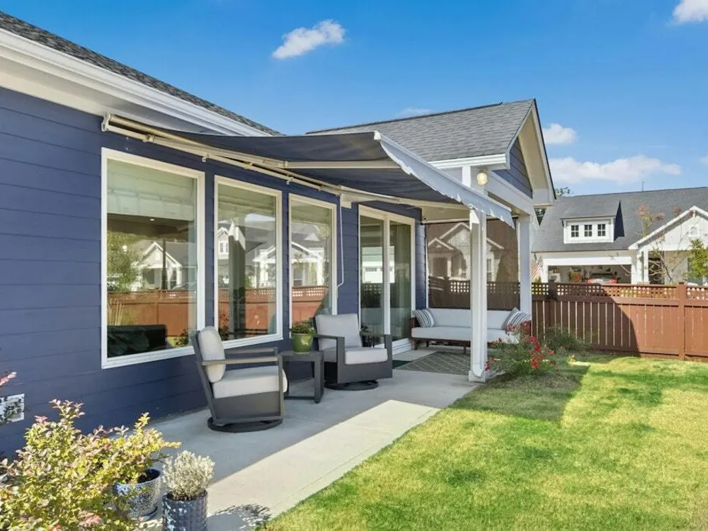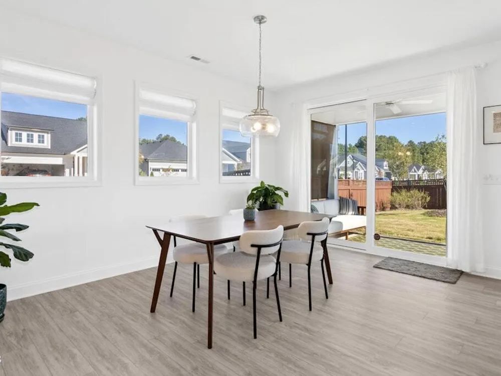 Welcome to Encore at Wendell Falls, a premier 55+ community offering sidewalks, and community amenities GALORE to include Resort style pool, exercise room, tennis and pickleball courts, fitness center, indoor and outdoor fireplaces, Big screen TVs, kitchen area, meeting in multipurpose room, walking trails, and scenic Lake Oliver and MORE—everything you need for luxury, low-maintenance living. This beautiful corner-lot ONE LEVEL home features fiber cement siding with stone and shake style accents, a GRAND covered front porch, and a welcoming entryway. Inside, 9-foot ceilings and luxury vinyl plank flooring extend throughout the main living areas. The spacious foyer opens to a bright family room filled with natural light from large windows dressed with shades when privacy is needed. The adjoining dining area features even more windows and a sliding door leading to a COVERED PATIO and additional outdoor living space with a retractable awning—perfect for entertaining or relaxing. The kitchen impresses with QUARTZ countertops, an elegant TILE backsplash, enormous island with eat-at bar, walk-in pantry, and appliances including wall oven, cooktop, microwave, dishwasher, and refrigerator and disposal. The primary suite offers a TRAY ceiling, plantation shutters, and a luxurious ensuite bath with dual sinks, TILE shower with bench seat, and a generous walk-in closet with lots of shelving. Two additional bedrooms provide flexible space, including one with its own private bath and another currently used as an office with French doors and built-in shelving. A conveniently located tile-floor laundry room lends ample space. A built-in cubby area is just off the two-car garage entry to the home. Outside, enjoy the FENCED backyard, COVERED PATIO, and extended patio with retractable awning for year-round enjoyment. Experience the perfect blend of comfort, style, and community living—welcome home to Encore at Wendell Falls.