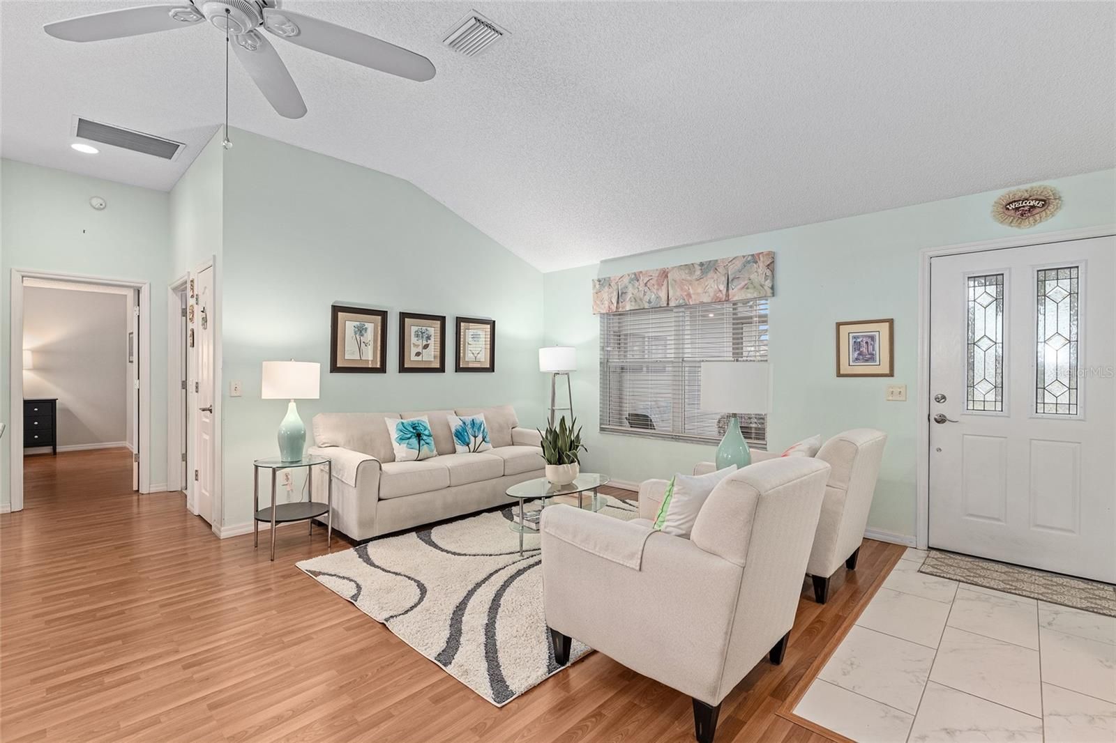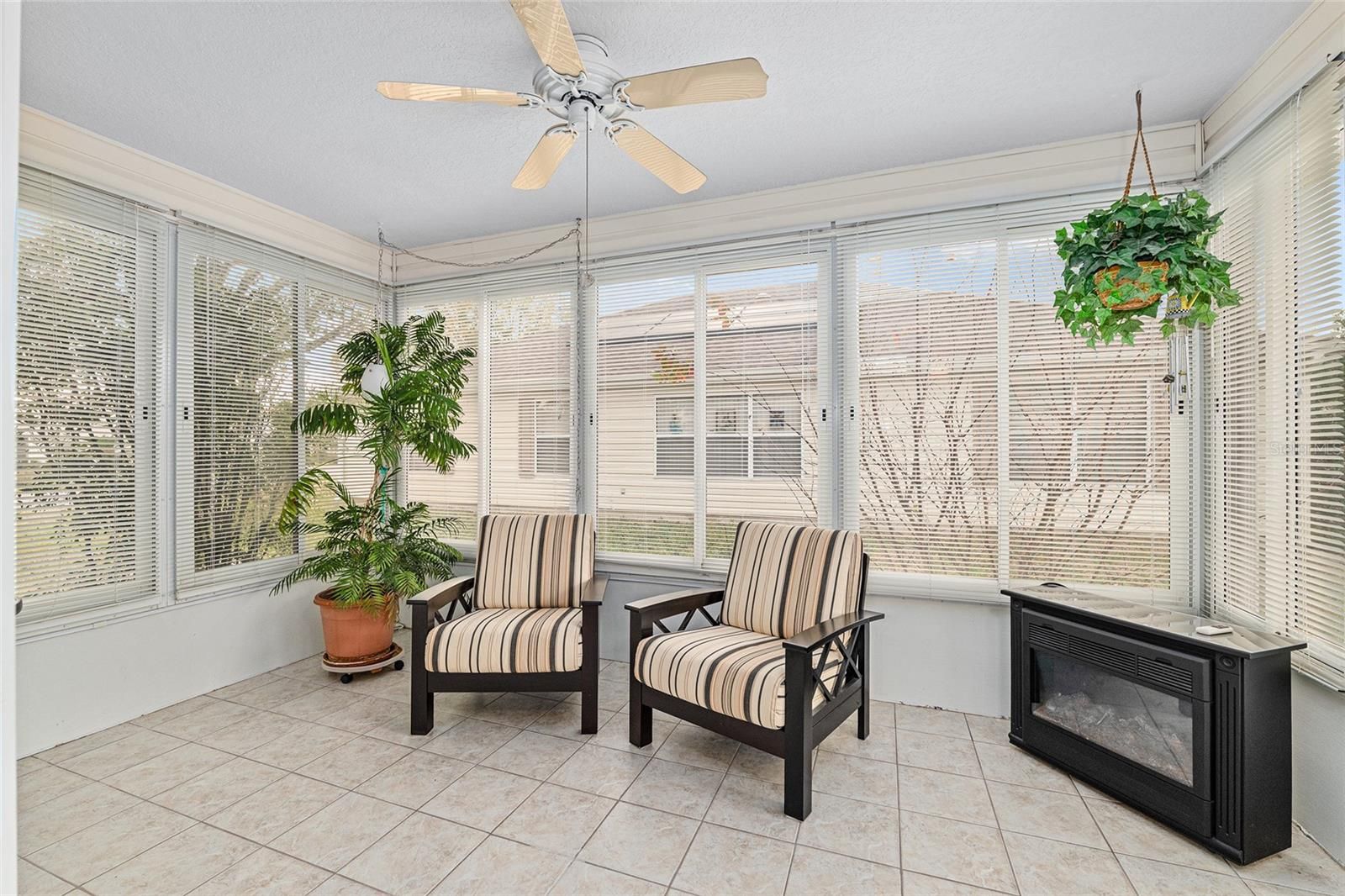 Nestled on a desirable corner homesite shaded by majestic live oak trees, this inviting home is located in the highly sought-after Santo Domingo Village—perfectly positioned for the active-adult lifestyle. The thoughtfully designed SPLIT FLOOR PLAN offers privacy and comfort, while tile and laminate flooring throughout (NO CARPET) and HIGH CEILINGS create a bright, open feel. The well-appointed kitchen features a LARGE CENTER ISLAND, ideal for entertaining and everyday living. Both the primary and guest BATHROOMS HAVE BEEN TASTEFULLY UPDATED with modern finishes. Additional highlights include an OVERSIZED TWO-CAR GARAGE with GARAGE SCREEN and PAINTED GARAGE FLOOR, WATER SOFTENER, SCREENED FRONT PORCH, GUTTERS WITH LEAF GUARDS, and an ENCLOSED LANAI—perfect for relaxing or hosting friends year-round. The ROOF WAS REPLACED IN 2020, providing added peace of mind. Just minutes from Spanish Springs Town Square, enjoy nightly live music, popular restaurants, and performances at The Sharon. The home is also conveniently close to the Savannah Center, offering even more entertainment and events. Surrounded by Executive and Championship golf courses, community pools, and recreation centers, this location provides endless opportunities to stay active and social. The home is being sold FURNISHED, and the BOND IS PAID, making this an exceptional value in one of the area’s most popular villages.