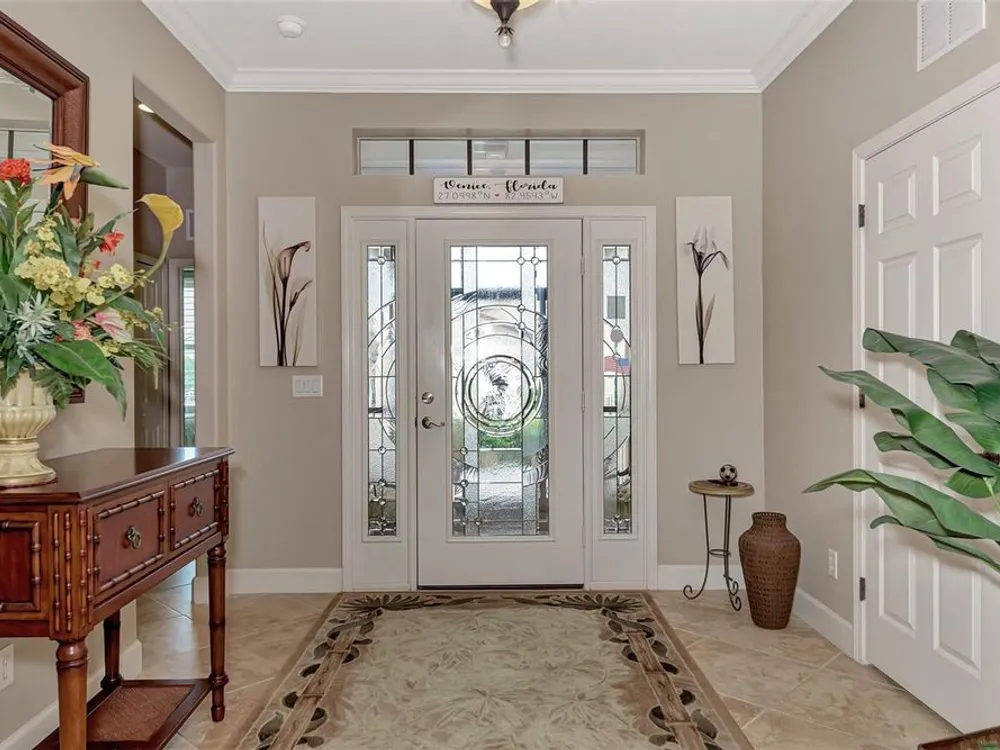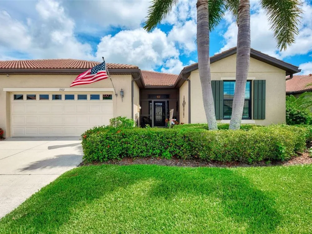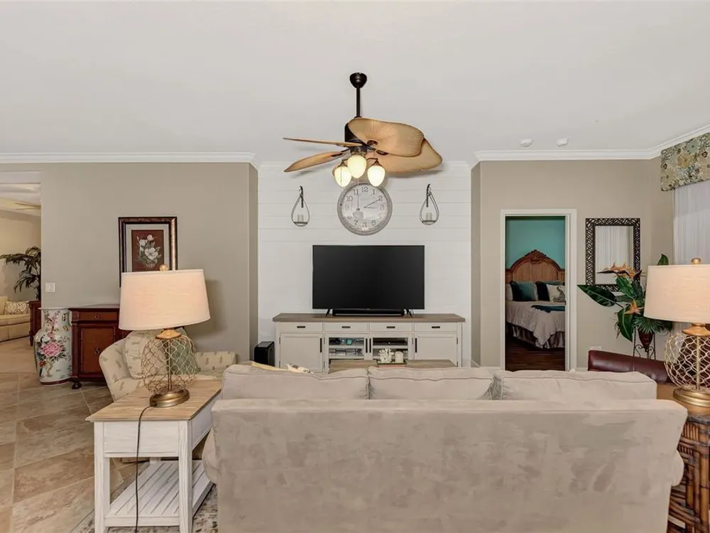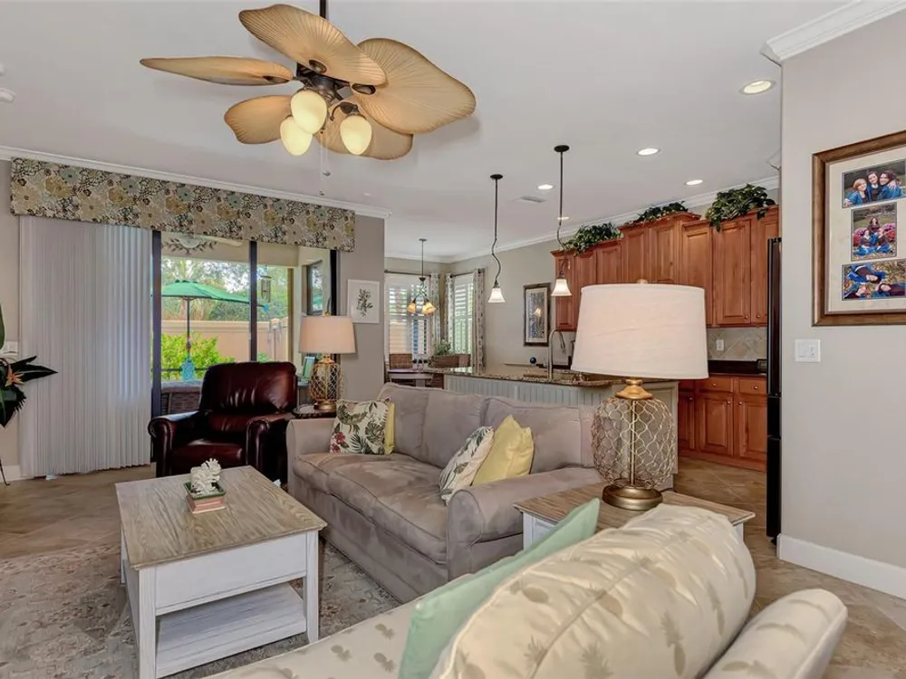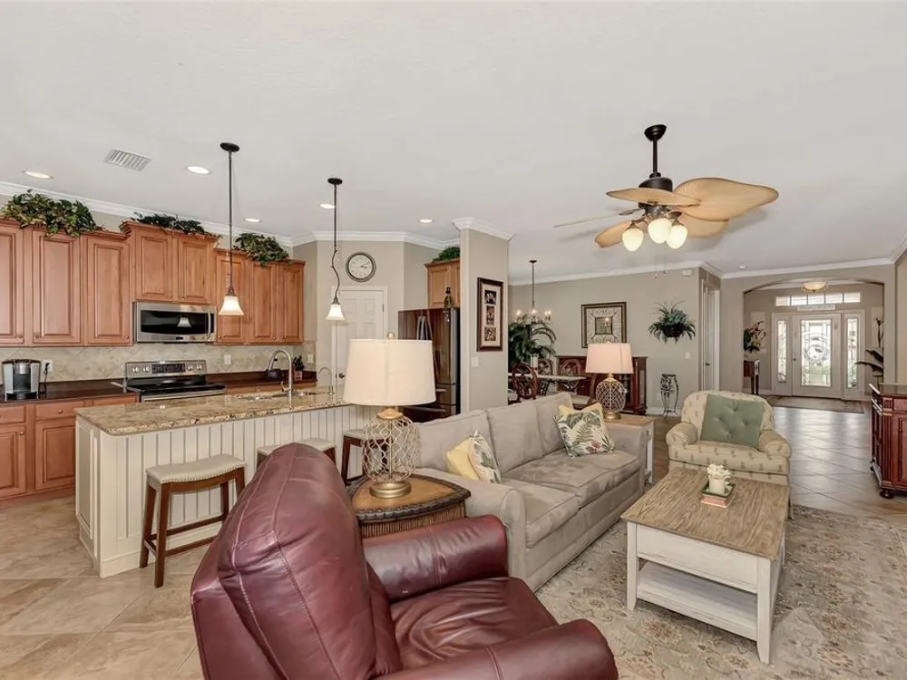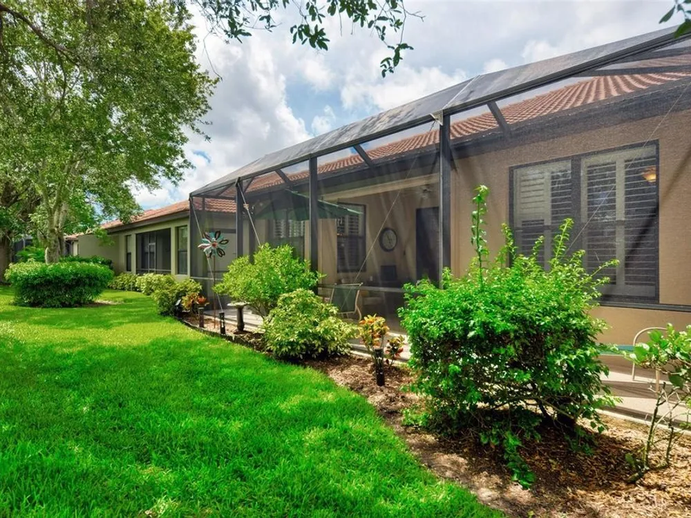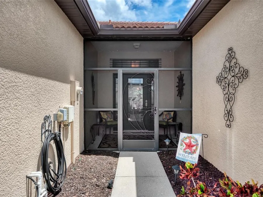 Welcome to your dream home in this exclusive 55+ gated community! This stunning 2006-built villa offers over 2,100 square feet of luxurious living with a spacious open floor plan, perfect for both relaxation and entertaining. Featuring 3 bedrooms, 2 bathrooms, and a versatile bonus room, this home is designed for comfort and style. Step through the elegant glass front door entry to find plantation shutters, crown molding, and 18-inch tile laid on the diagonal throughout much of the home, complemented by cozy carpeting in two of the bedrooms and bonus room. The modern kitchen boasts an updated breakfast bar, ideal for casual dining or hosting guests. Stay cool with a recently updated A/C system and enjoy peace of mind with impact windows and hurricane shutters. The extended lanai invites you to unwind and soak in the serene surroundings, while the attached 2-car garage provides ample storage and convenience. With low HOA fees and no CDD, this villa offers exceptional value in a vibrant community. Don’t miss the opportunity to own this beautifully appointed home—schedule your private tour today!