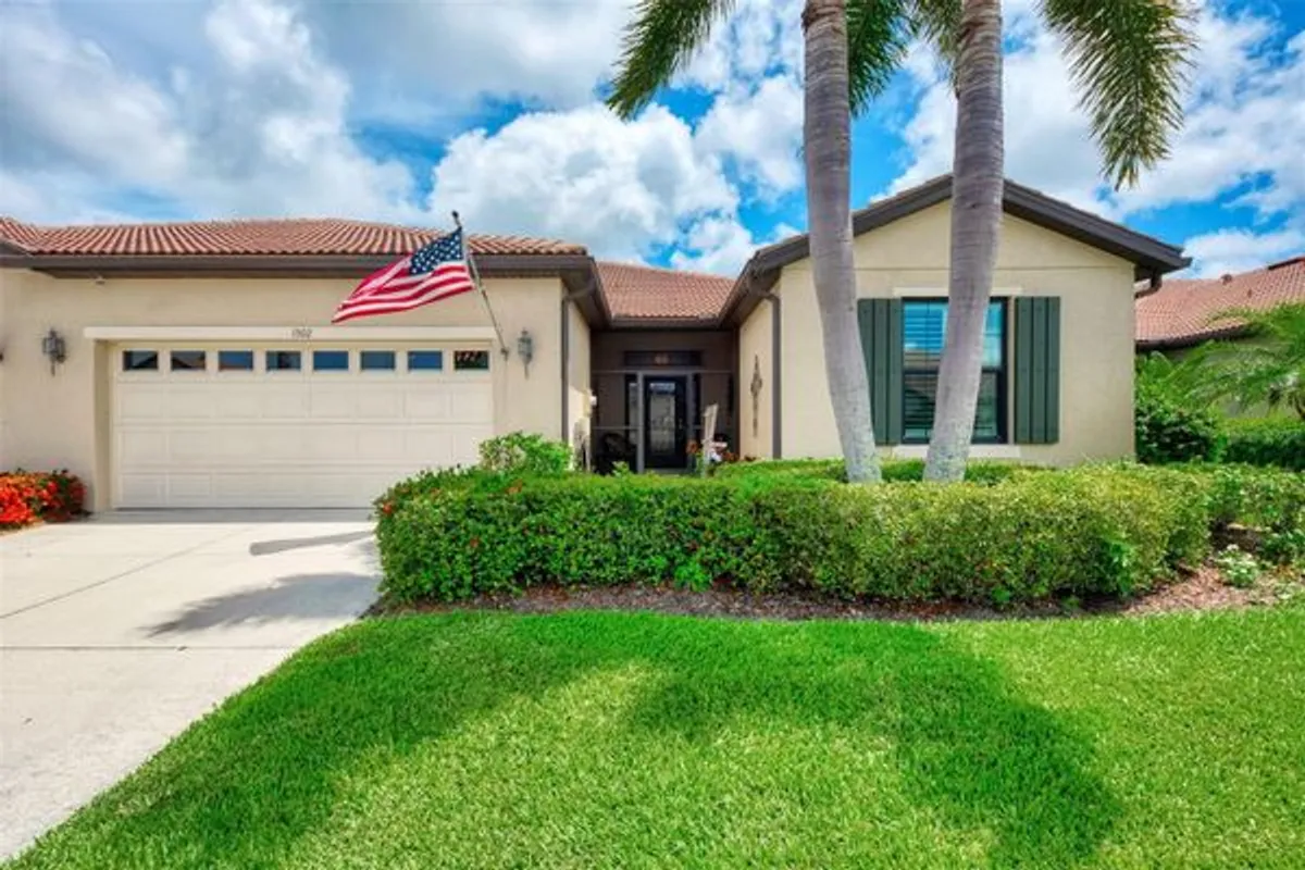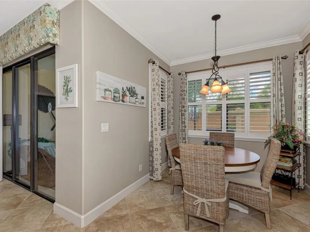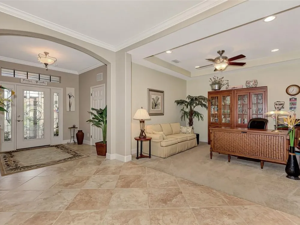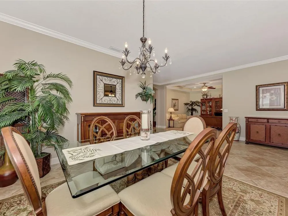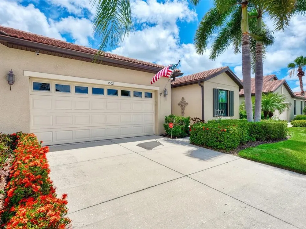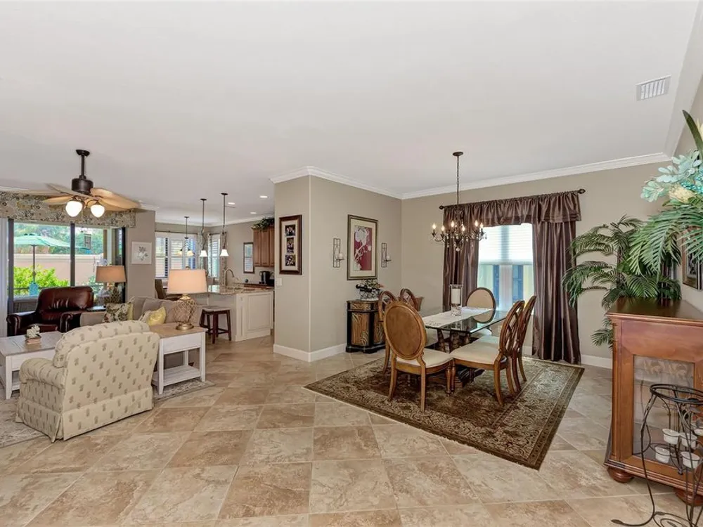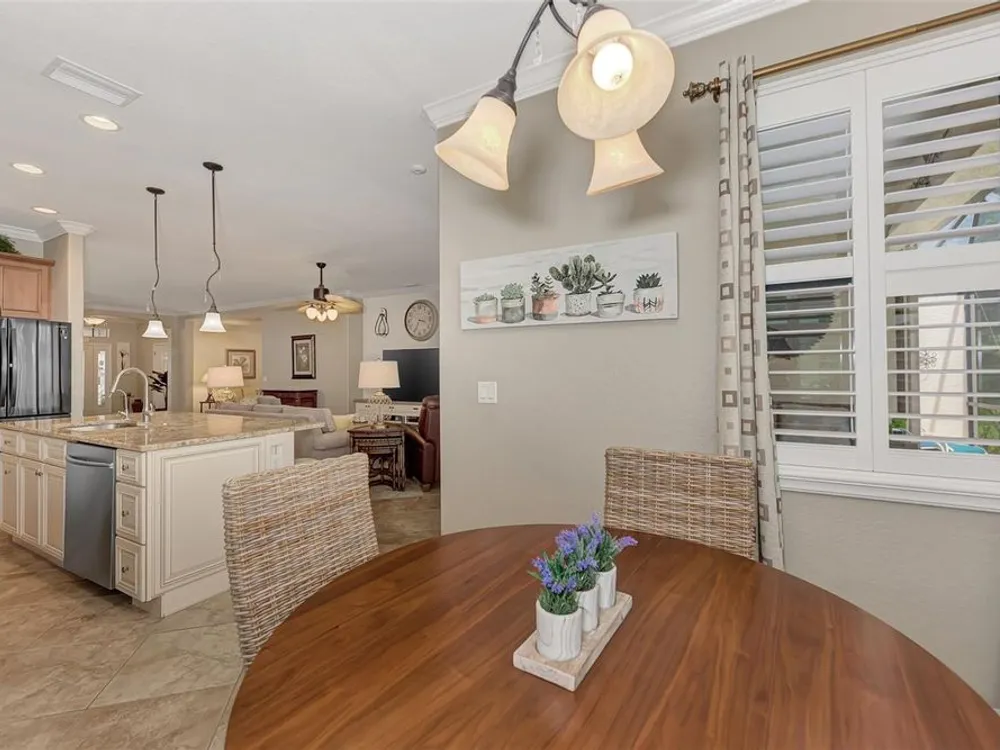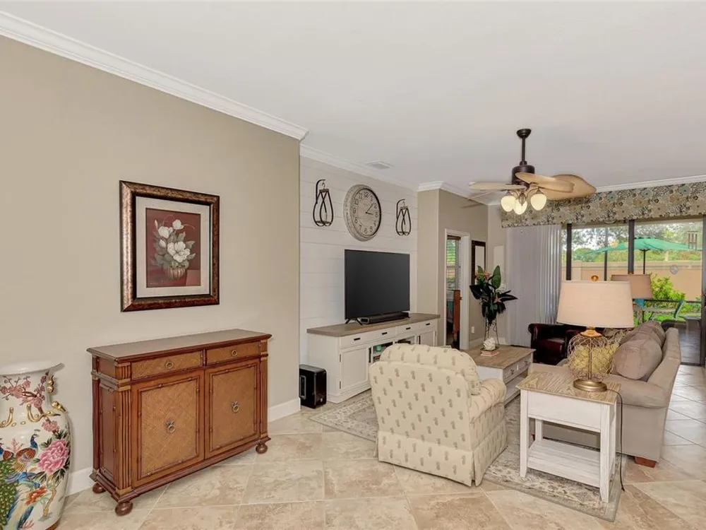Welcome to your dream home in this exclusive 55+ gated community! This stunning 2006-built villa offers over 2,100 square feet of luxurious living with a spacious open floor plan, perfect for both relaxation and entertaining. Featuring 3 bedrooms, 2 bathrooms, and a versatile bonus room, this home is designed for comfort and style. Step through the elegant glass front door entry to find plantation shutters, crown molding, and 18-inch tile laid on the diagonal throughout much of the home, complemented by cozy carpeting in two of the bedrooms and bonus room. The modern kitchen boasts an updated breakfast bar, ideal for casual dining or hosting guests. Stay cool with a recently updated A/C system and enjoy peace of mind with impact windows and hurricane shutters. The extended lanai invites you to unwind and soak in the serene surroundings, while the attached 2-car garage provides ample storage and convenience. With low HOA fees and no CDD, this villa offers exceptional value in a vibrant community. Don’t miss the opportunity to own this beautifully appointed home—schedule your private tour today!