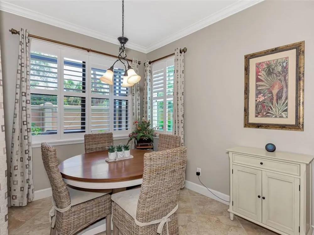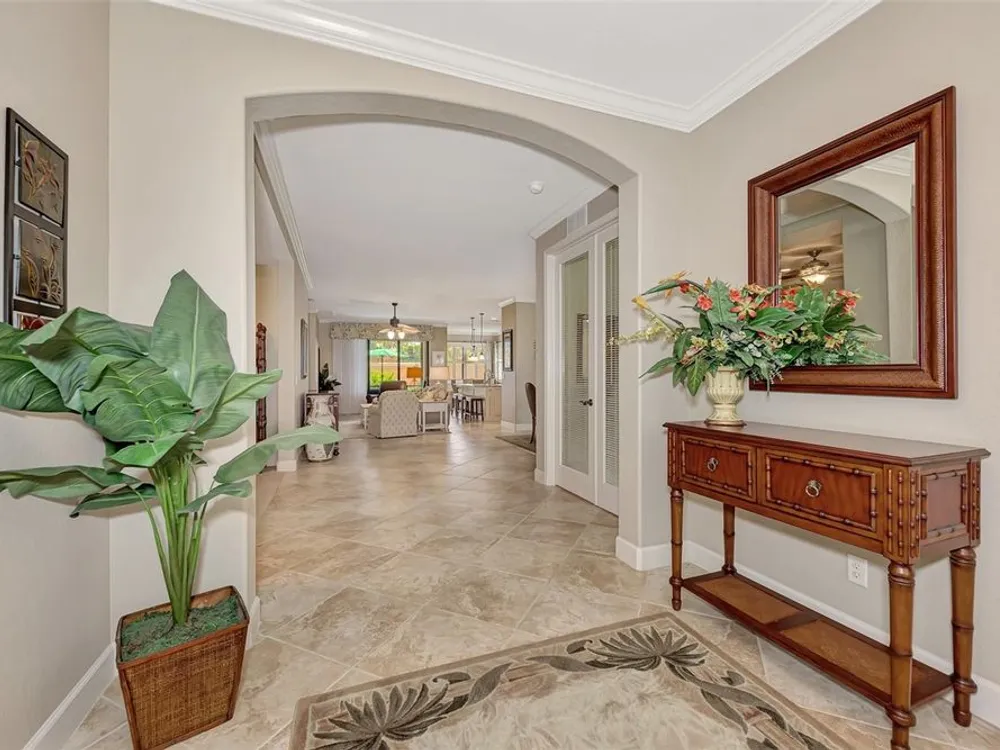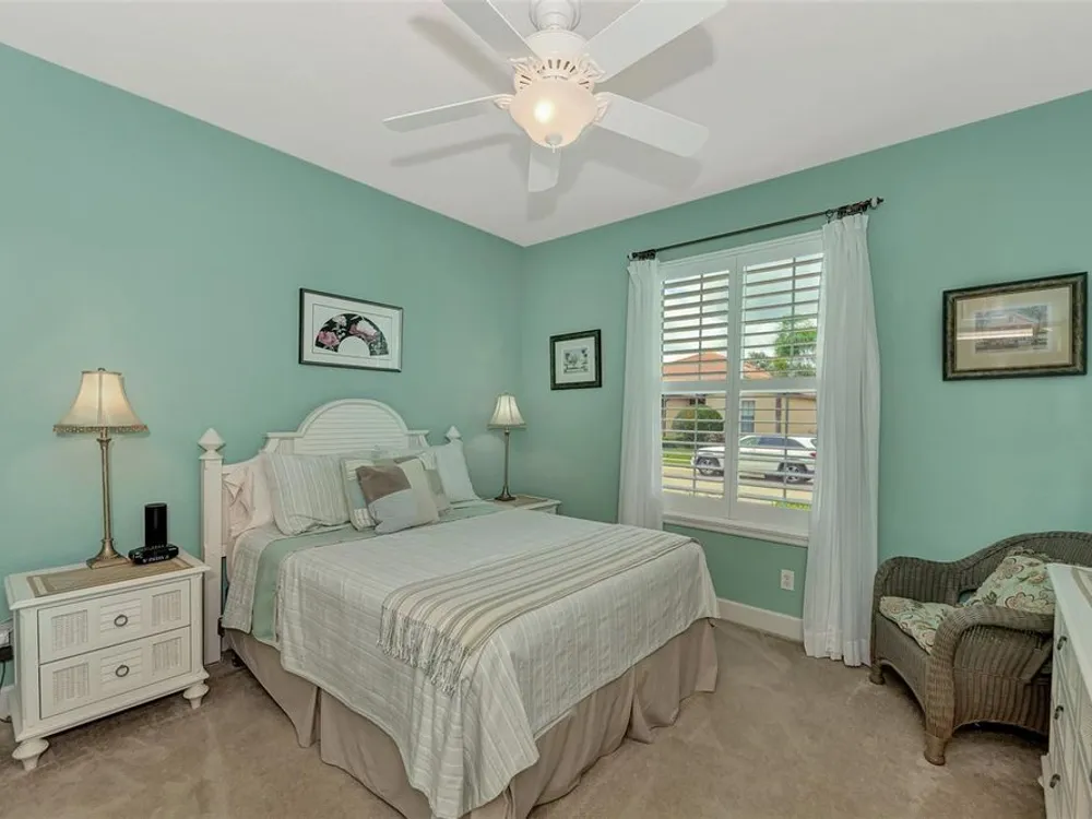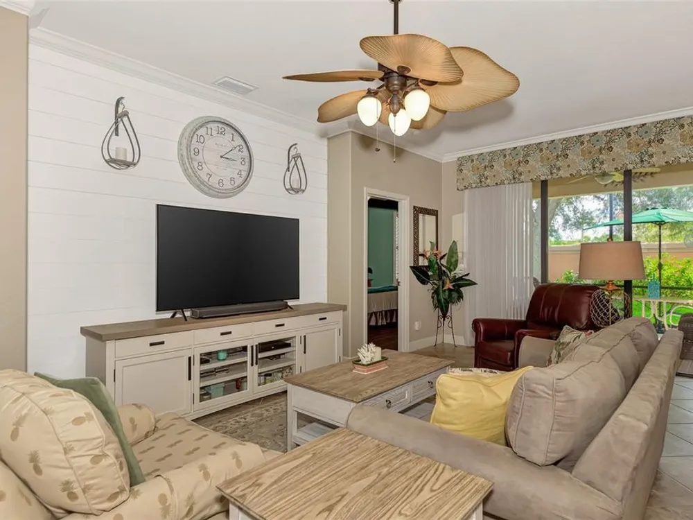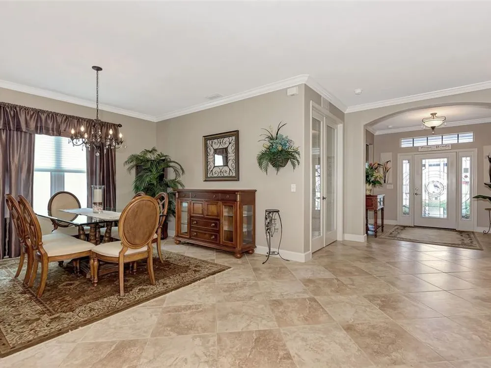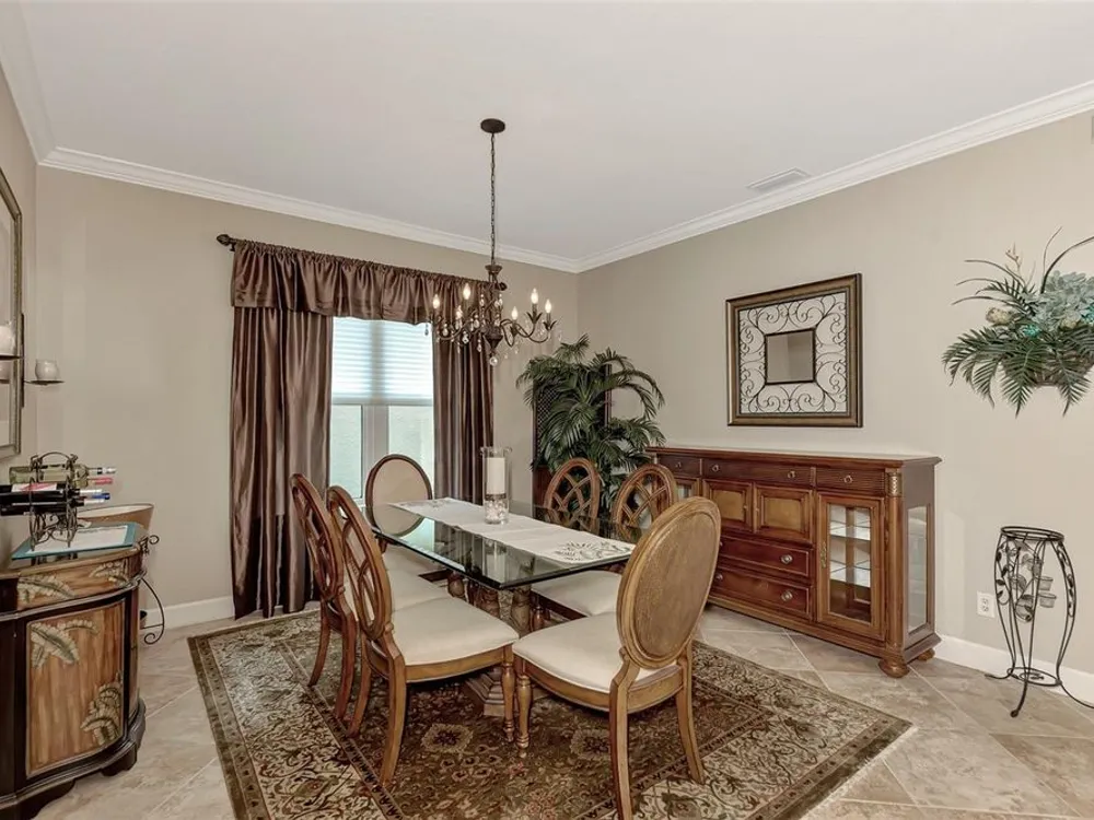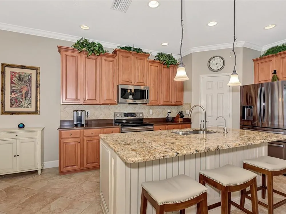 Welcome to your dream home in this exclusive 55+ gated community! This stunning 2006-built villa offers over 2,100 square feet of luxurious living with a spacious open floor plan, perfect for both relaxation and entertaining. Featuring 3 bedrooms, 2 bathrooms, and a versatile bonus room, this home is designed for comfort and style. Step through the elegant glass front door entry to find plantation shutters, crown molding, and 18-inch tile laid on the diagonal throughout much of the home, complemented by cozy carpeting in two of the bedrooms and bonus room. The modern kitchen boasts an updated breakfast bar, ideal for casual dining or hosting guests. Stay cool with a recently updated A/C system and enjoy peace of mind with impact windows and hurricane shutters. The extended lanai invites you to unwind and soak in the serene surroundings, while the attached 2-car garage provides ample storage and convenience. With low HOA fees and no CDD, this villa offers exceptional value in a vibrant community. Don’t miss the opportunity to own this beautifully appointed home—schedule your private tour today!
