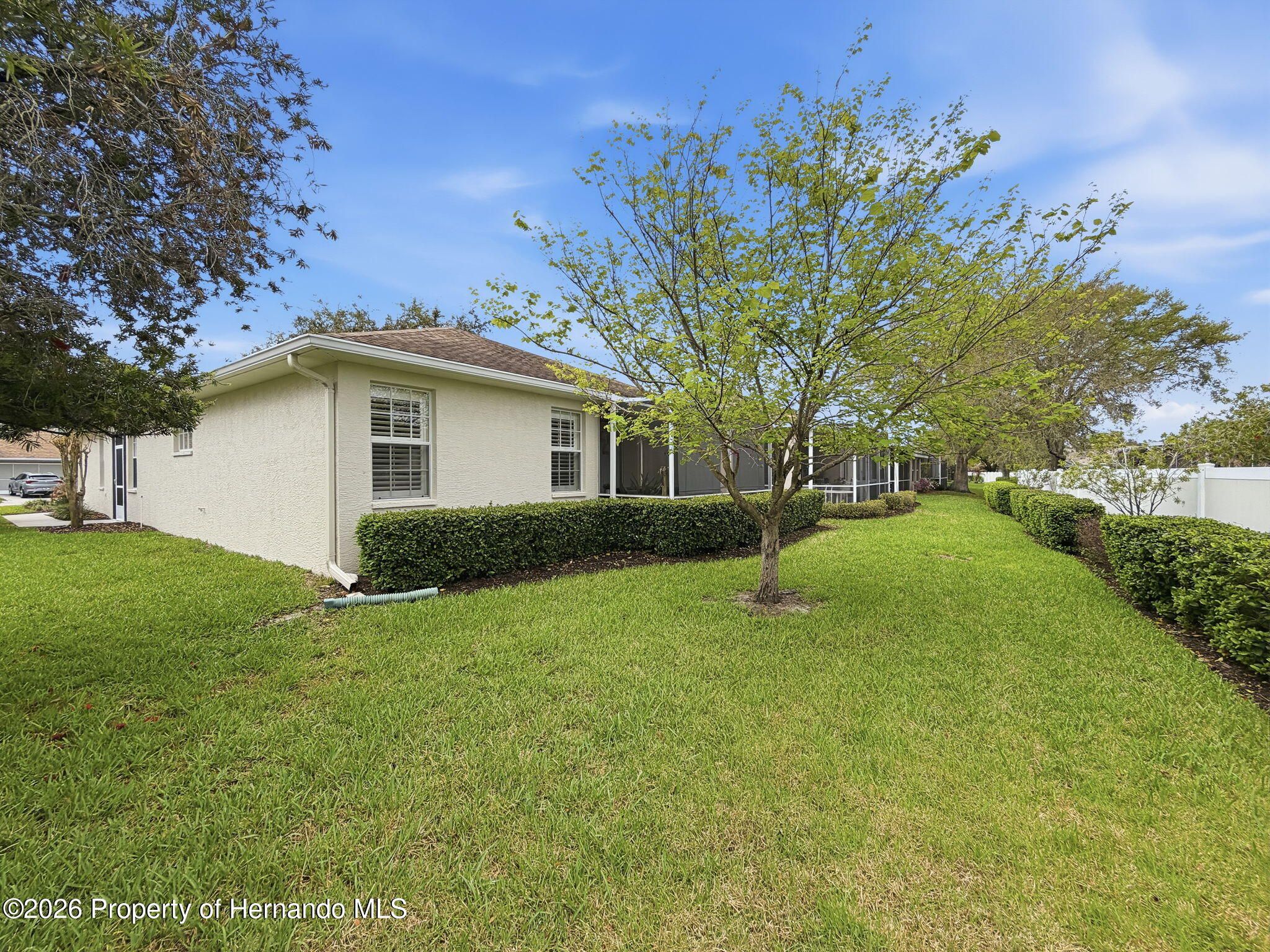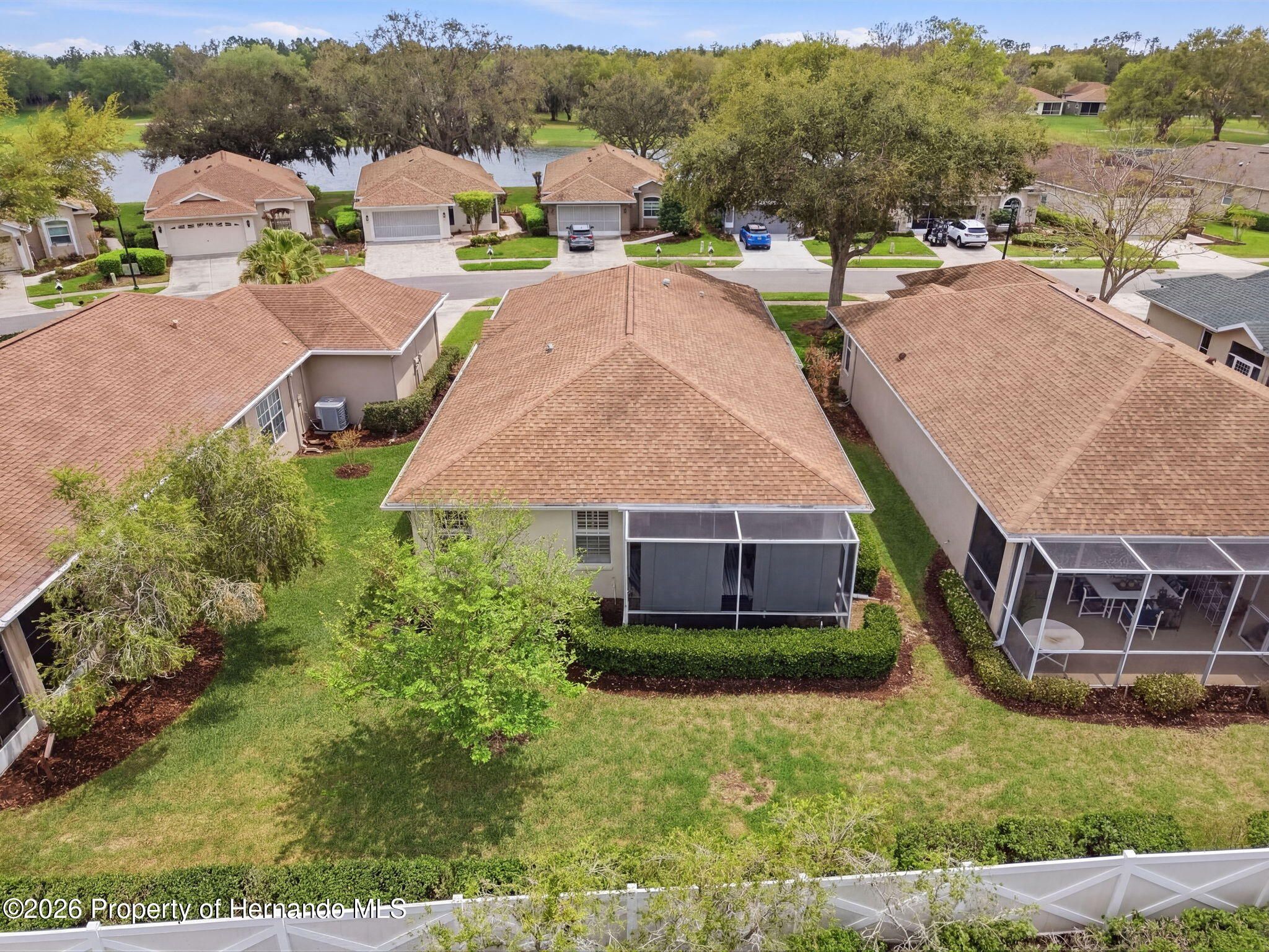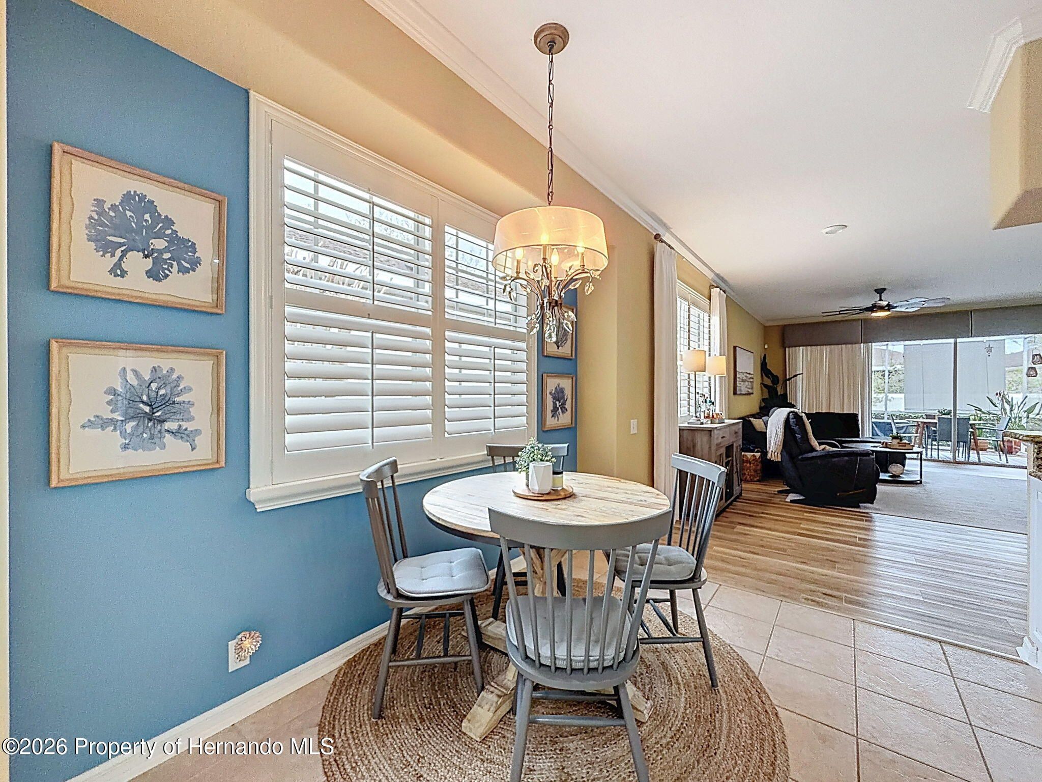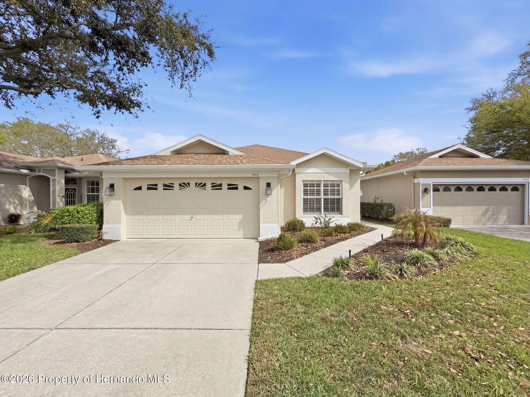 Welcome to the highly desirable gated golf course community of Silverthorn Country Club, where maintenance-free living meets comfort and style. This beautifully maintained 2 bedroom + den (or optional 3rd bedroom), 2-bathroom home offers a desirable split floor plan designed for both privacy and functionality. Step inside to an open layout featuring a spacious great room with attractive luxury vinyl plank flooring, lofty ceilings, a decorative plant shelf, and views of the lanai. Elegant crown molding and beautiful wood plantation shutters add charm and sophistication throughout the home. The kitchen is both functional and inviting, highlighting timeless finishes including granite countertops, a tumbled tile backsplash, stainless steel appliances, generous cabinet space, a breakfast bar, pantry, and a cozy breakfast nook--perfect for casual dining or entertaining. Just off the kitchen is a spacious laundry room with a convenient butler-style pantry area, ideal for serving, folding laundry, and additional storage. The primary suite features two walk-in closets, a relaxing soaking tub, separate shower, and a private commode area. The split bedroom plan offers comfort and privacy for guests, with the second bedroom located near its own full bathroom. The versatile den can easily serve as a home office, hobby room, or additional bedroom. Enjoy relaxing evenings on the screened lanai featuring privacy screens and a soothing hot tub--an ideal space to unwind or entertain while enjoying the Florida lifestyle. Additional highlights include a two-car-attached garage and low-maintenance living. Residents of Silverthorn enjoy outstanding community amenities including a clubhouse, pool, fitness center, tennis and pickleball courts, state of the art fitness equipment, library, arts/crafts/card room and more. The beautiful Golf course and Country club are available for use for private pay. Maintenance includes exterior paint, lawn mowing & spraying, irrigation sprinkler maintenance, and hedge trimming. HOA includes cable, internet, 24 hr. gate CAM and use of community amenities. Silverthorn is conveniently located near shopping, dining, and the Suncoast Parkway for easy access to Tampa.