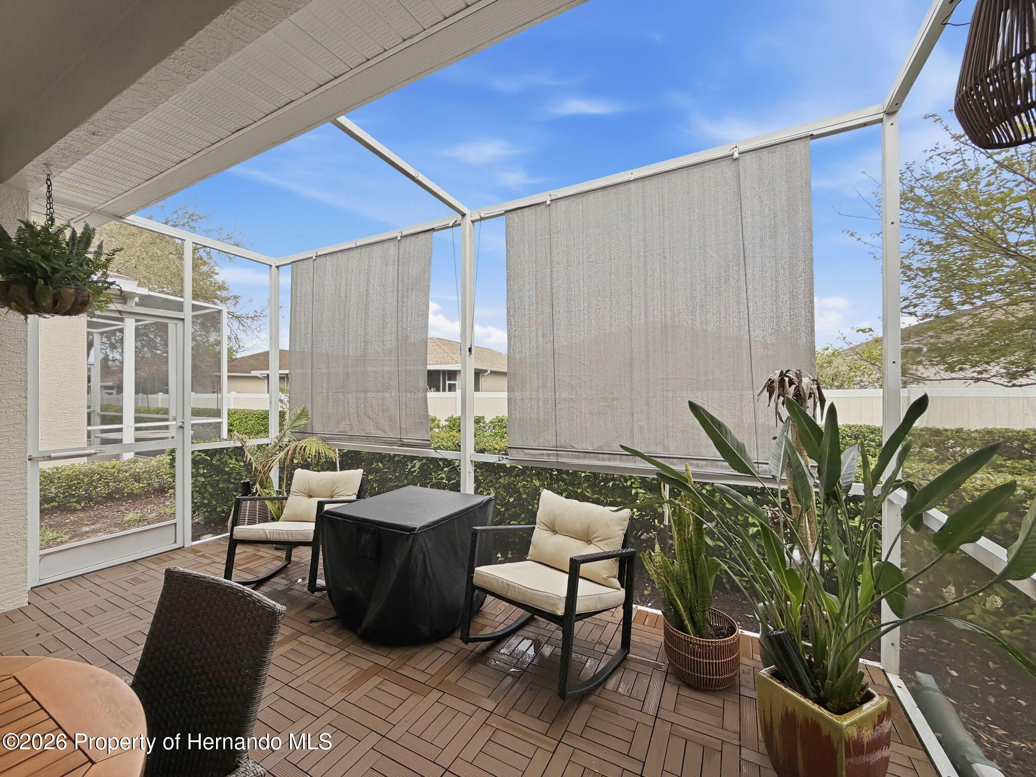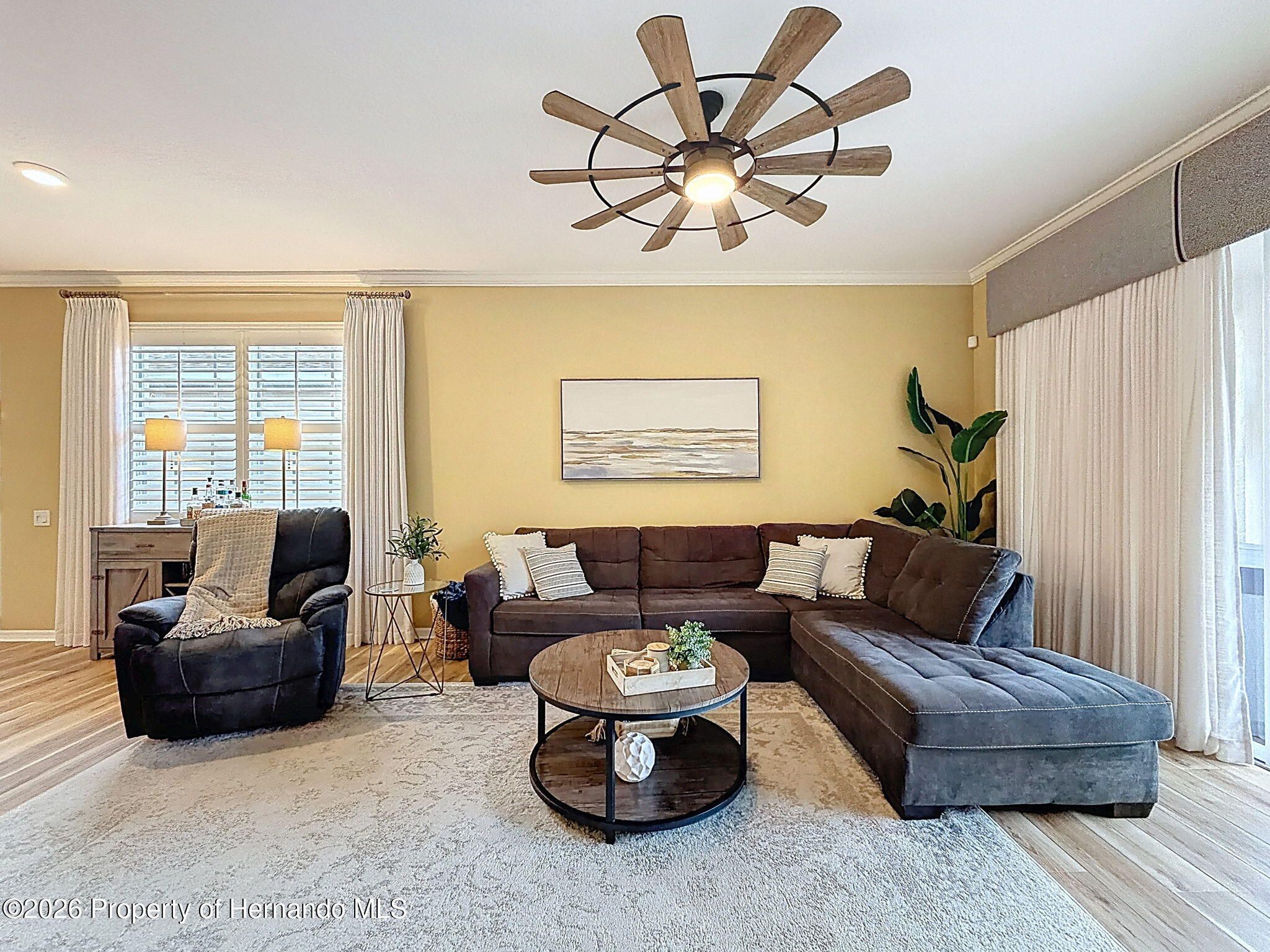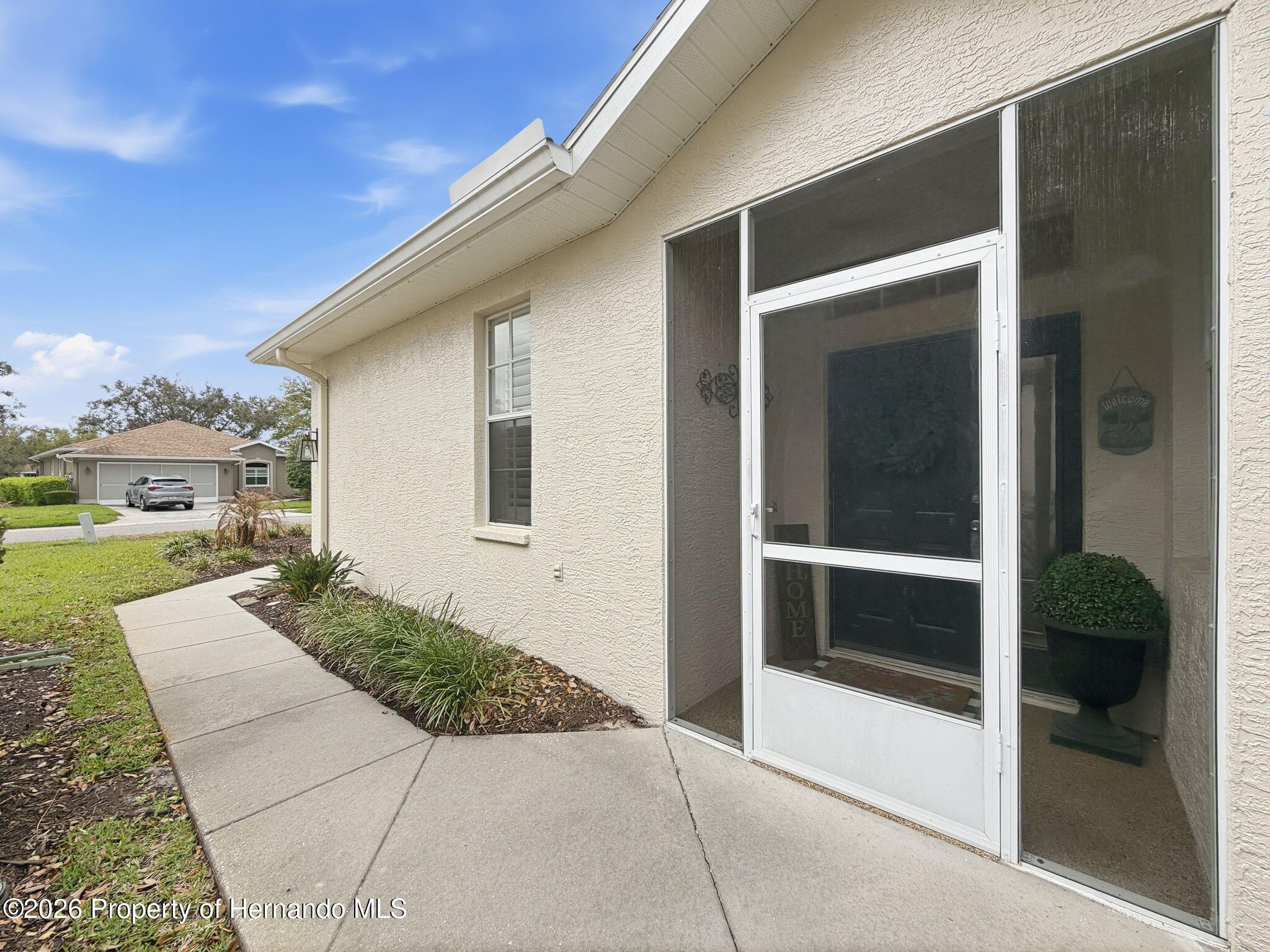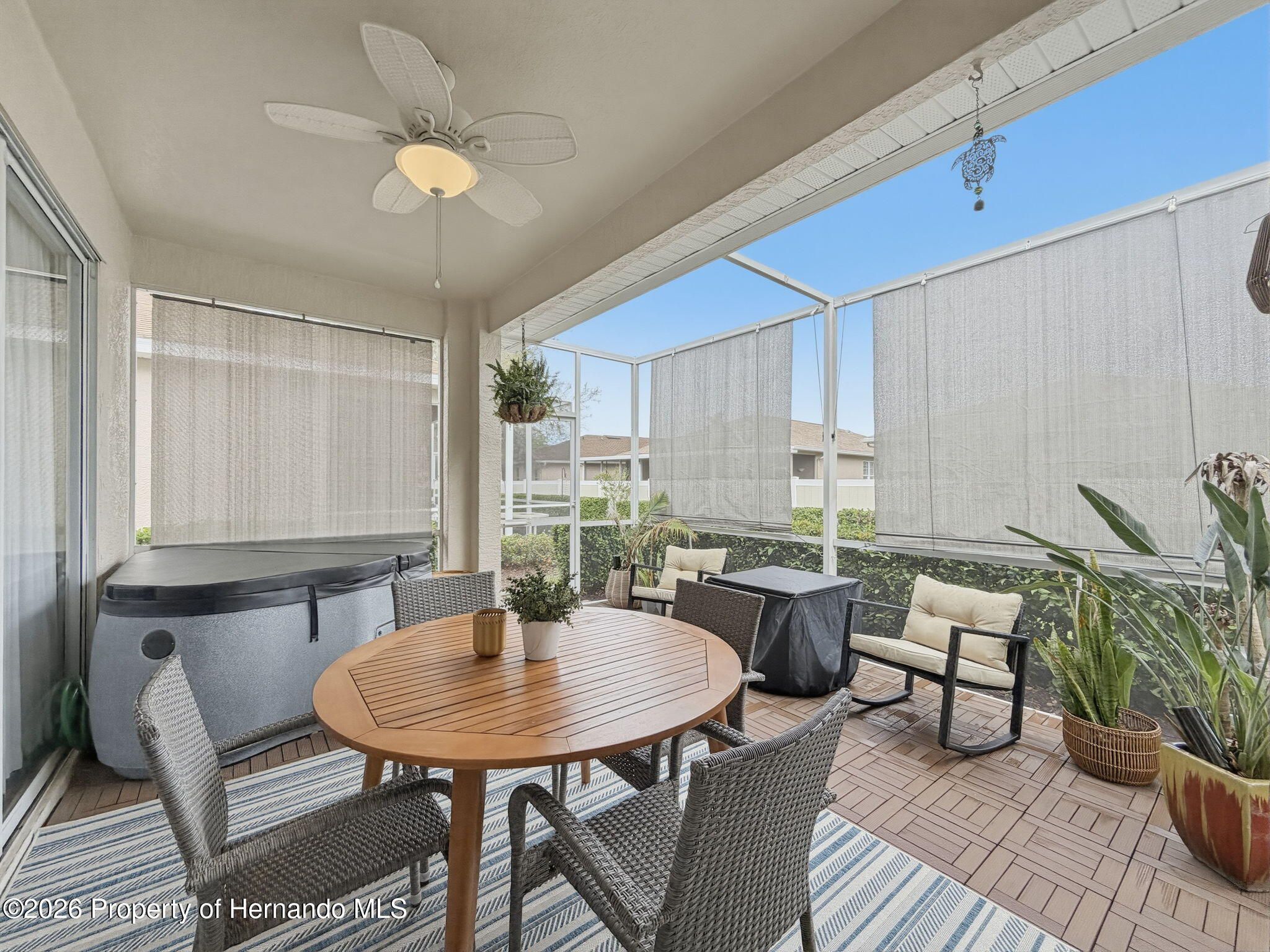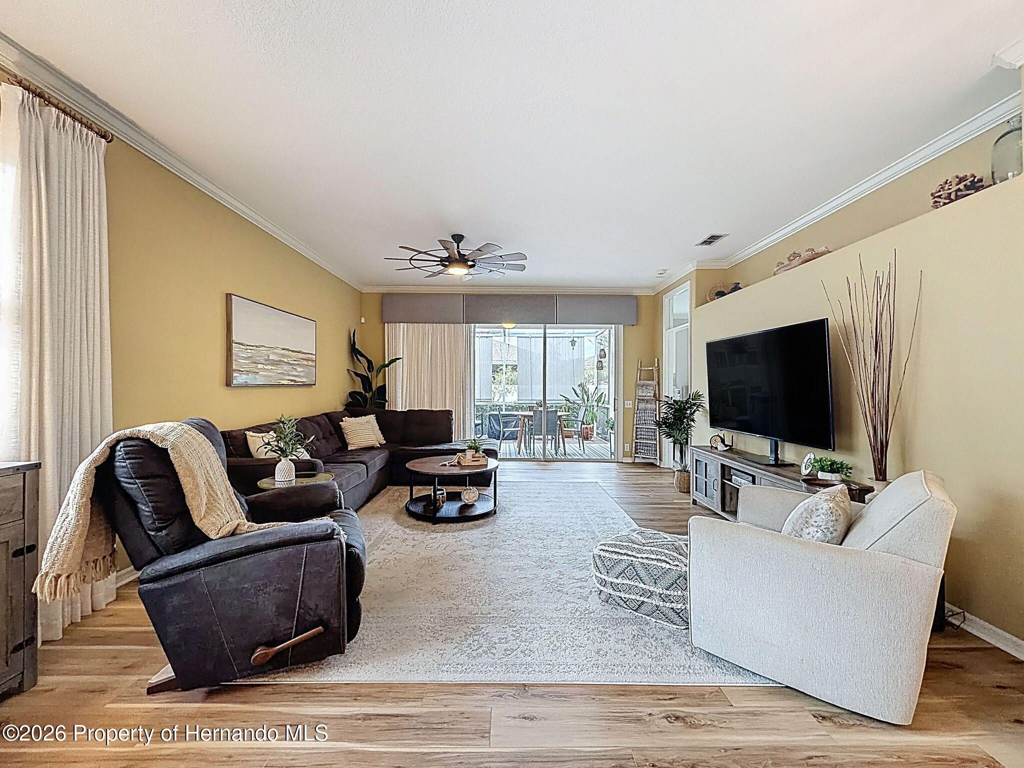 Welcome to the highly desirable gated golf course community of Silverthorn Country Club, where maintenance-free living meets comfort and style. This beautifully maintained 2 bedroom + den (or optional 3rd bedroom), 2-bathroom home offers a desirable split floor plan designed for both privacy and functionality. Step inside to an open layout featuring a spacious great room with attractive luxury vinyl plank flooring, lofty ceilings, a decorative plant shelf, and views of the lanai. Elegant crown molding and beautiful wood plantation shutters add charm and sophistication throughout the home. The kitchen is both functional and inviting, highlighting timeless finishes including granite countertops, a tumbled tile backsplash, stainless steel appliances, generous cabinet space, a breakfast bar, pantry, and a cozy breakfast nook--perfect for casual dining or entertaining. Just off the kitchen is a spacious laundry room with a convenient butler-style pantry area, ideal for serving, folding laundry, and additional storage. The primary suite features two walk-in closets, a relaxing soaking tub, separate shower, and a private commode area. The split bedroom plan offers comfort and privacy for guests, with the second bedroom located near its own full bathroom. The versatile den can easily serve as a home office, hobby room, or additional bedroom. Enjoy relaxing evenings on the screened lanai featuring privacy screens and a soothing hot tub--an ideal space to unwind or entertain while enjoying the Florida lifestyle. Additional highlights include a two-car-attached garage and low-maintenance living. Residents of Silverthorn enjoy outstanding community amenities including a clubhouse, pool, fitness center, tennis and pickleball courts, state of the art fitness equipment, library, arts/crafts/card room and more. The beautiful Golf course and Country club are available for use for private pay. Maintenance includes exterior paint, lawn mowing & spraying, irrigation sprinkler maintenance, and hedge trimming. HOA includes cable, internet, 24 hr. gate CAM and use of community amenities. Silverthorn is conveniently located near shopping, dining, and the Suncoast Parkway for easy access to Tampa.