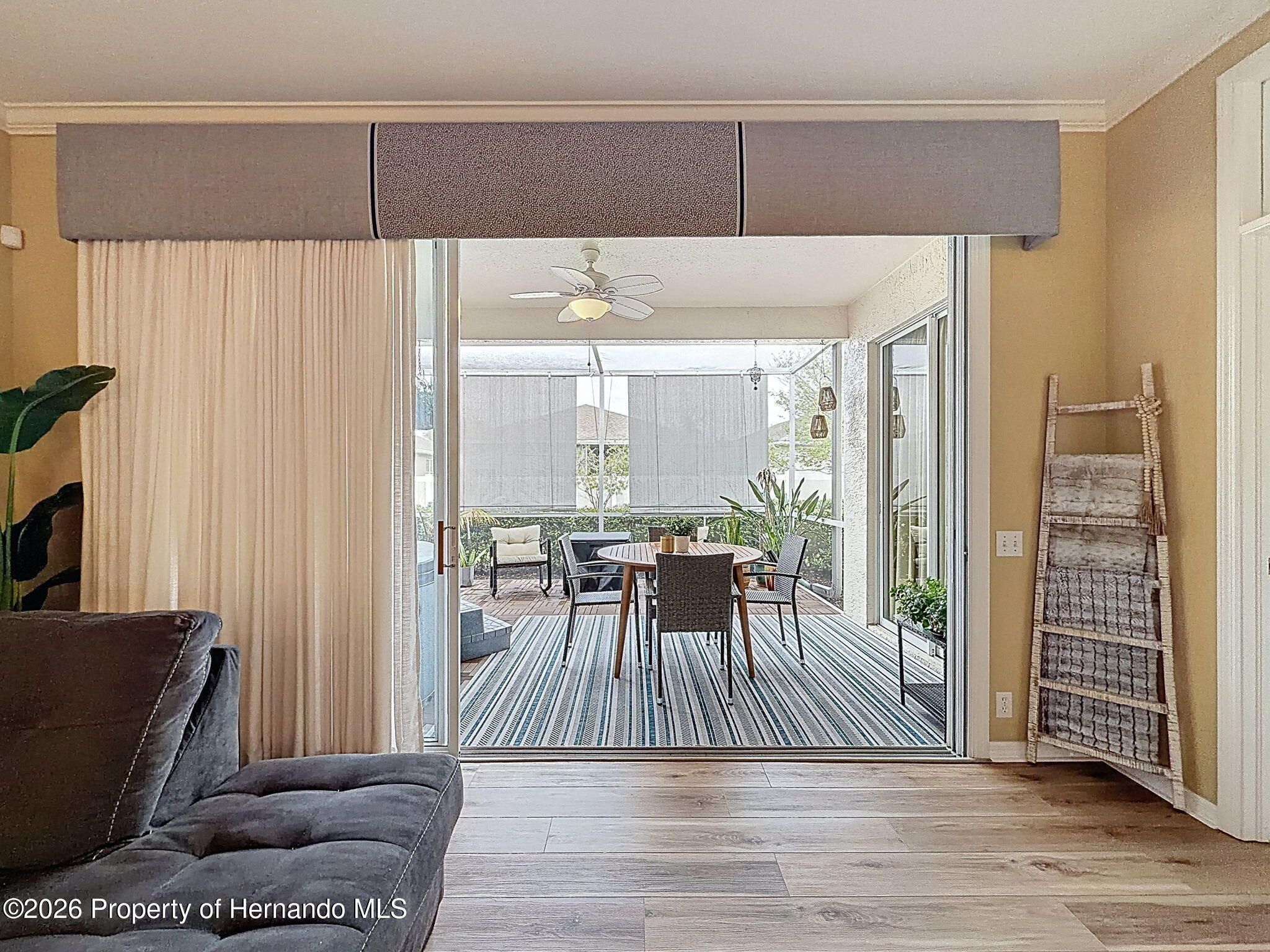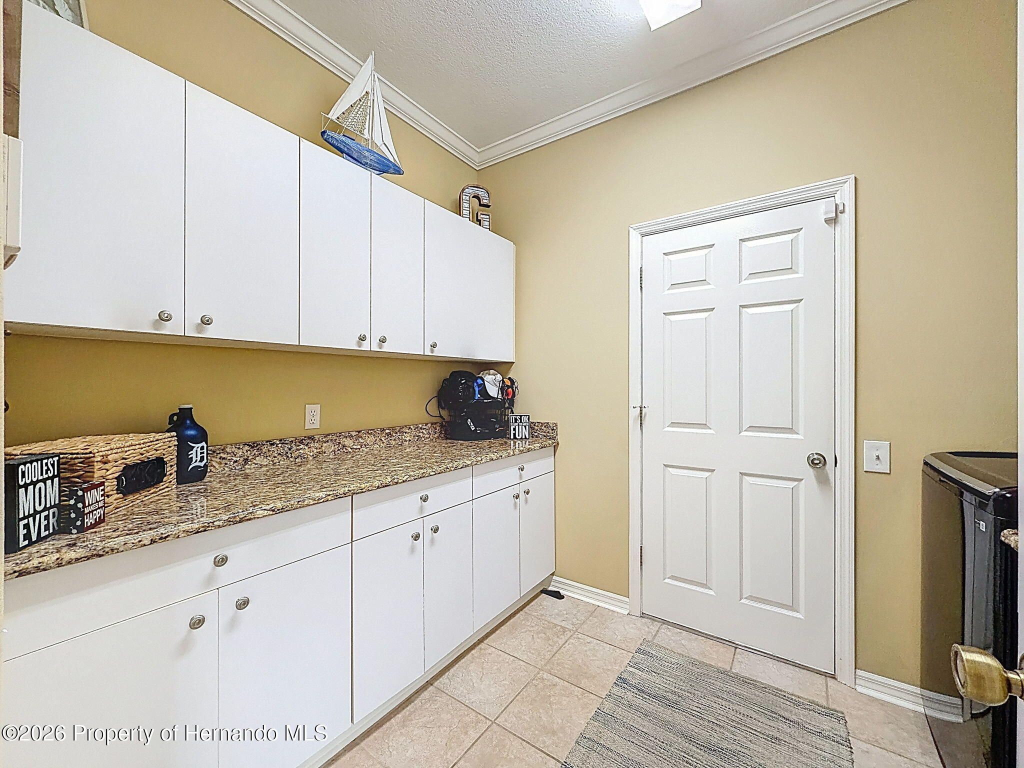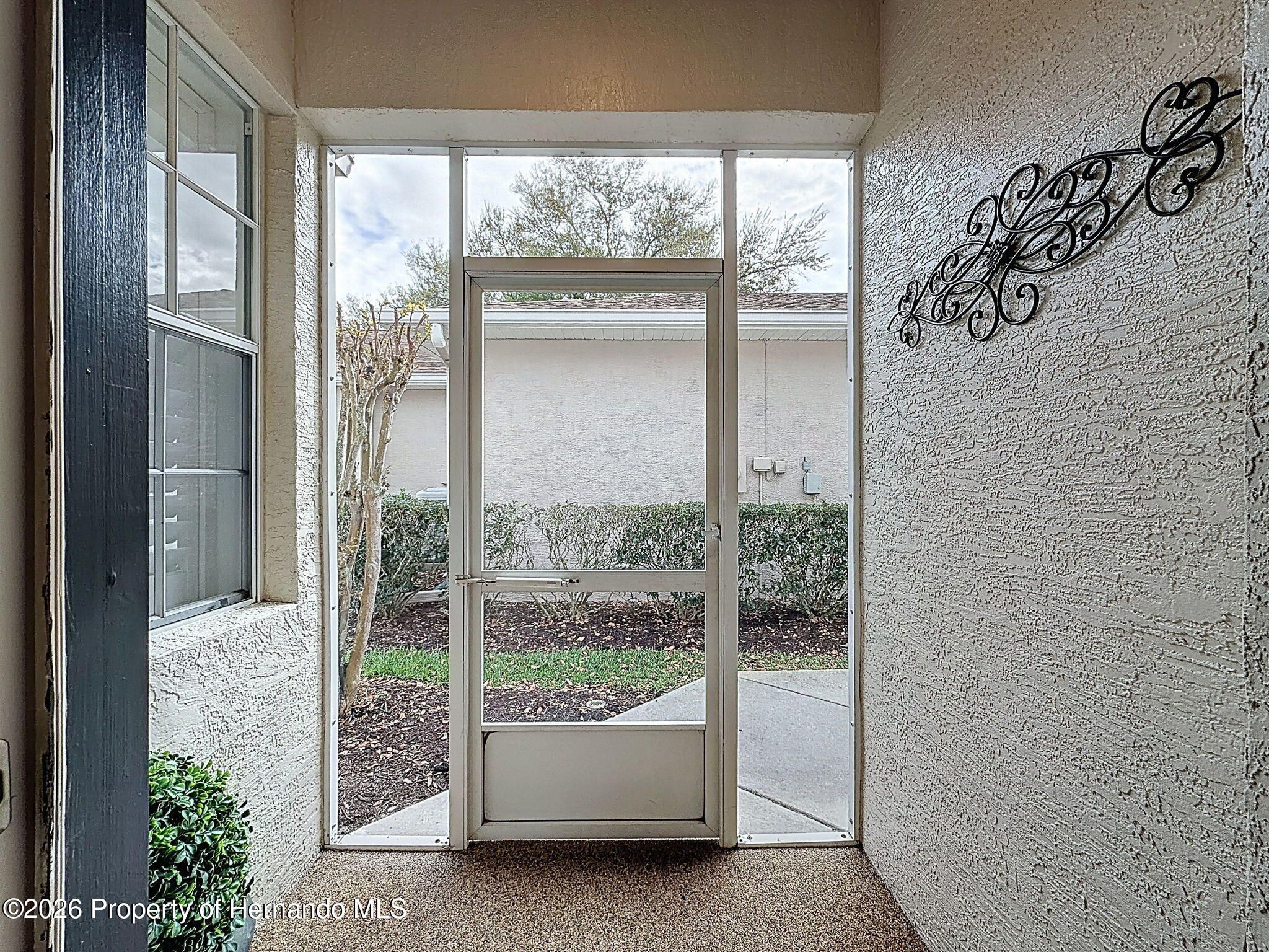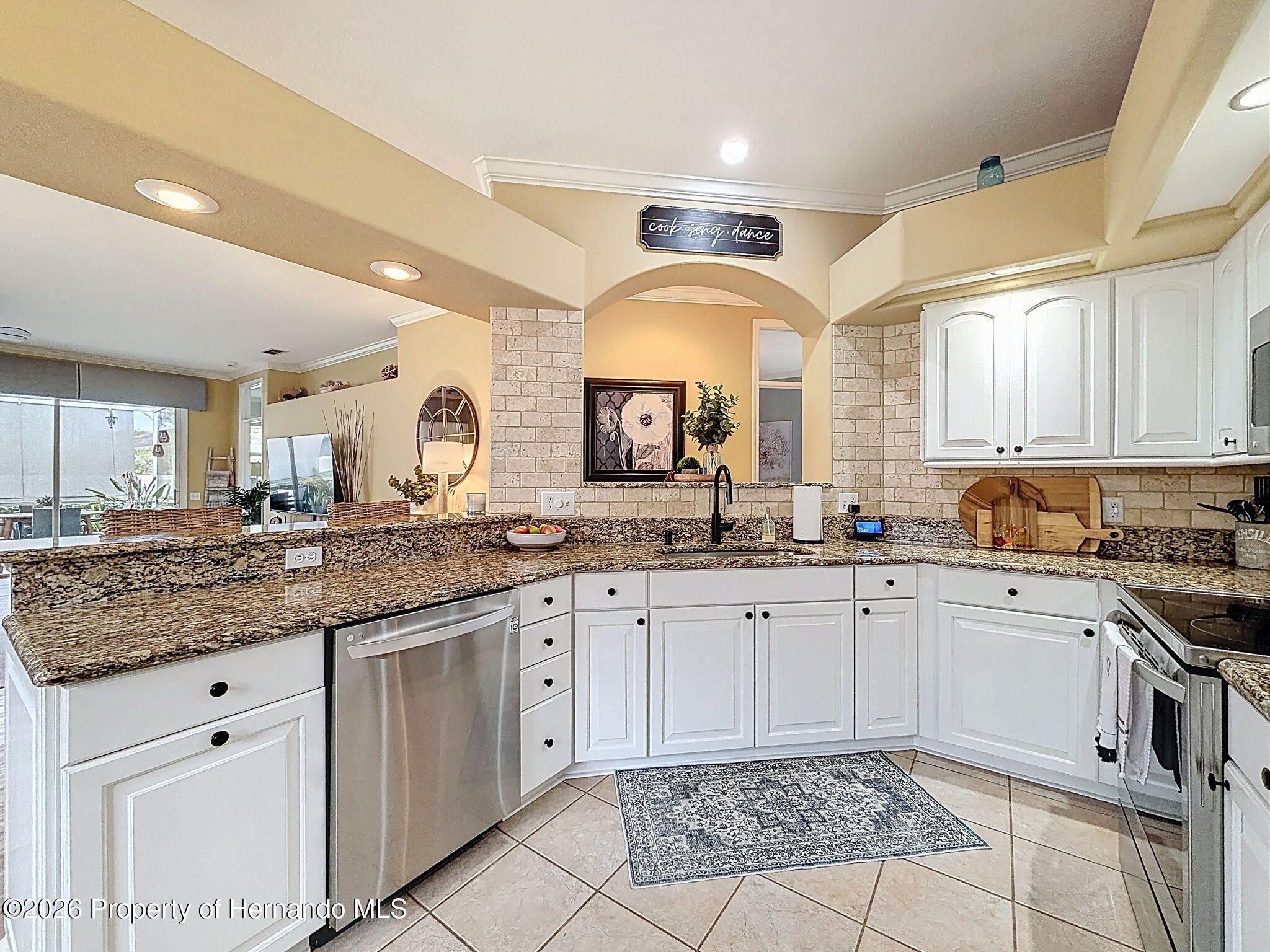 Welcome to the highly desirable gated golf course community of Silverthorn Country Club, where maintenance-free living meets comfort and style. This beautifully maintained 2 bedroom + den (or optional 3rd bedroom), 2-bathroom home offers a desirable split floor plan designed for both privacy and functionality. Step inside to an open layout featuring a spacious great room with attractive luxury vinyl plank flooring, lofty ceilings, a decorative plant shelf, and views of the lanai. Elegant crown molding and beautiful wood plantation shutters add charm and sophistication throughout the home. The kitchen is both functional and inviting, highlighting timeless finishes including granite countertops, a tumbled tile backsplash, stainless steel appliances, generous cabinet space, a breakfast bar, pantry, and a cozy breakfast nook--perfect for casual dining or entertaining. Just off the kitchen is a spacious laundry room with a convenient butler-style pantry area, ideal for serving, folding laundry, and additional storage. The primary suite features two walk-in closets, a relaxing soaking tub, separate shower, and a private commode area. The split bedroom plan offers comfort and privacy for guests, with the second bedroom located near its own full bathroom. The versatile den can easily serve as a home office, hobby room, or additional bedroom. Enjoy relaxing evenings on the screened lanai featuring privacy screens and a soothing hot tub--an ideal space to unwind or entertain while enjoying the Florida lifestyle. Additional highlights include a two-car-attached garage and low-maintenance living. Residents of Silverthorn enjoy outstanding community amenities including a clubhouse, pool, fitness center, tennis and pickleball courts, state of the art fitness equipment, library, arts/crafts/card room and more. The beautiful Golf course and Country club are available for use for private pay. Maintenance includes exterior paint, lawn mowing & spraying, irrigation sprinkler maintenance, and hedge trimming. HOA includes cable, internet, 24 hr. gate CAM and use of community amenities. Silverthorn is conveniently located near shopping, dining, and the Suncoast Parkway for easy access to Tampa.