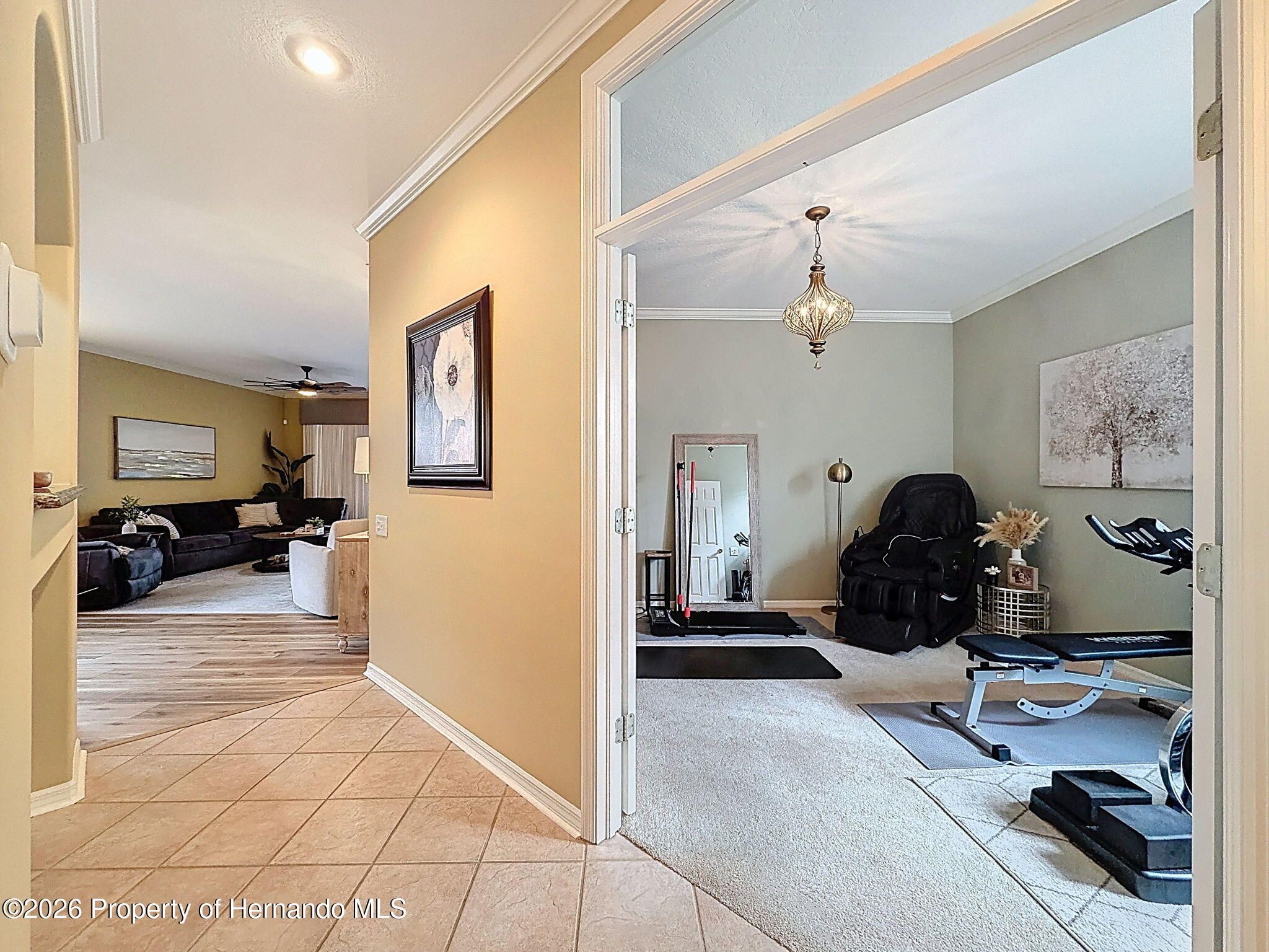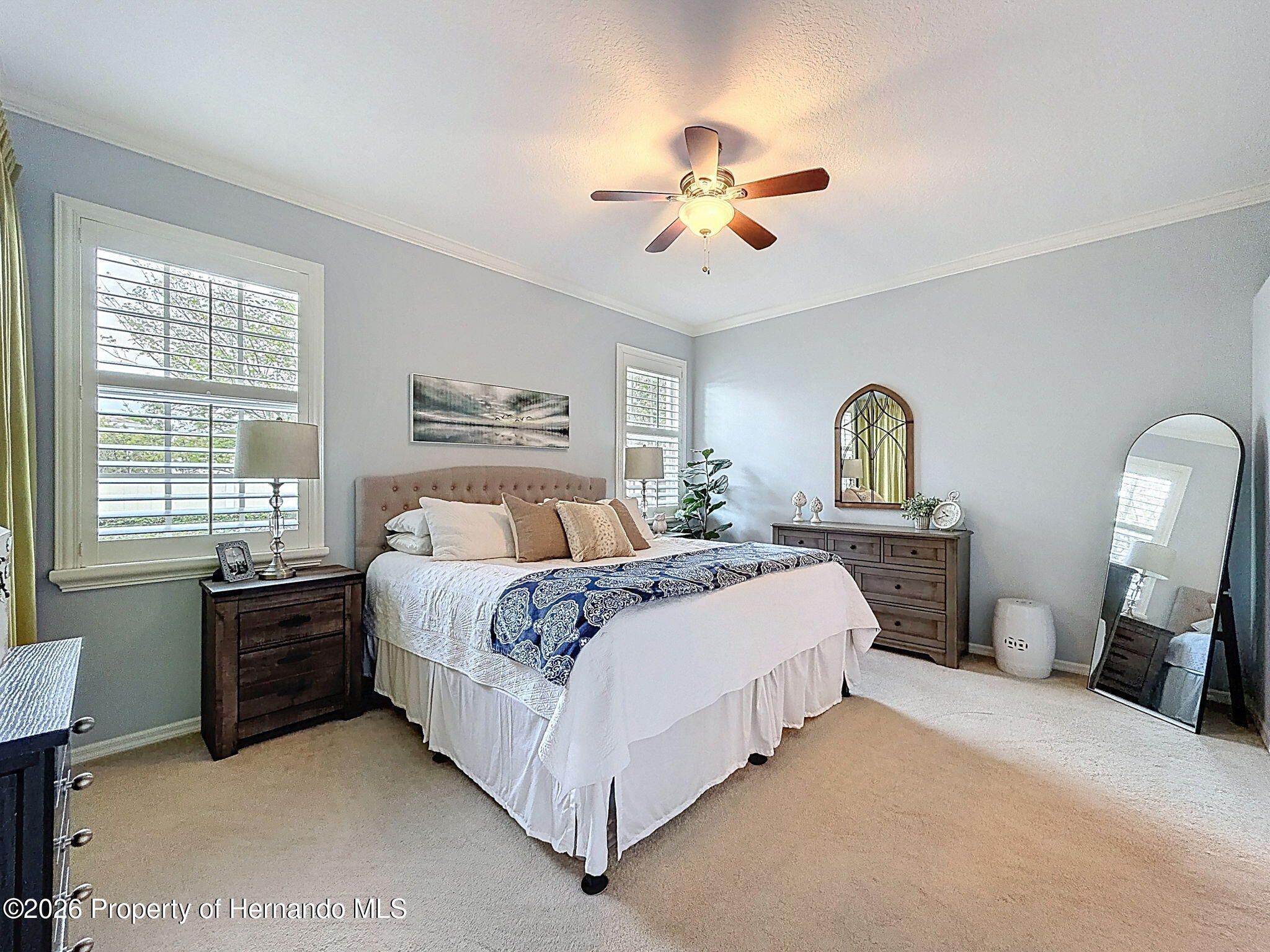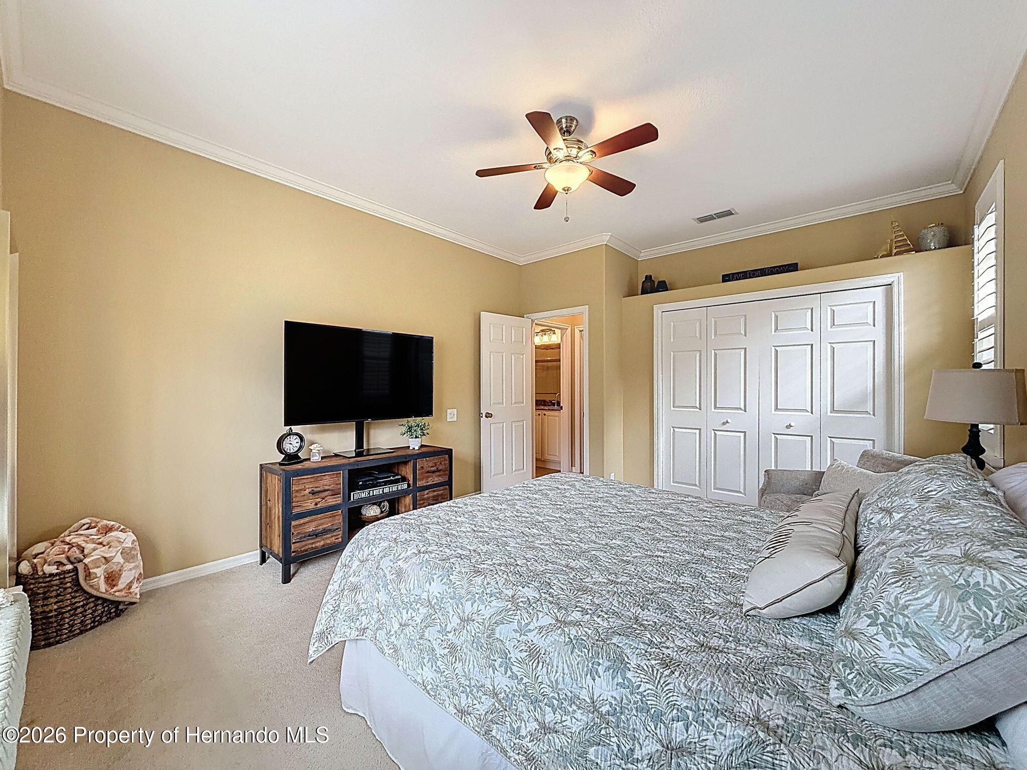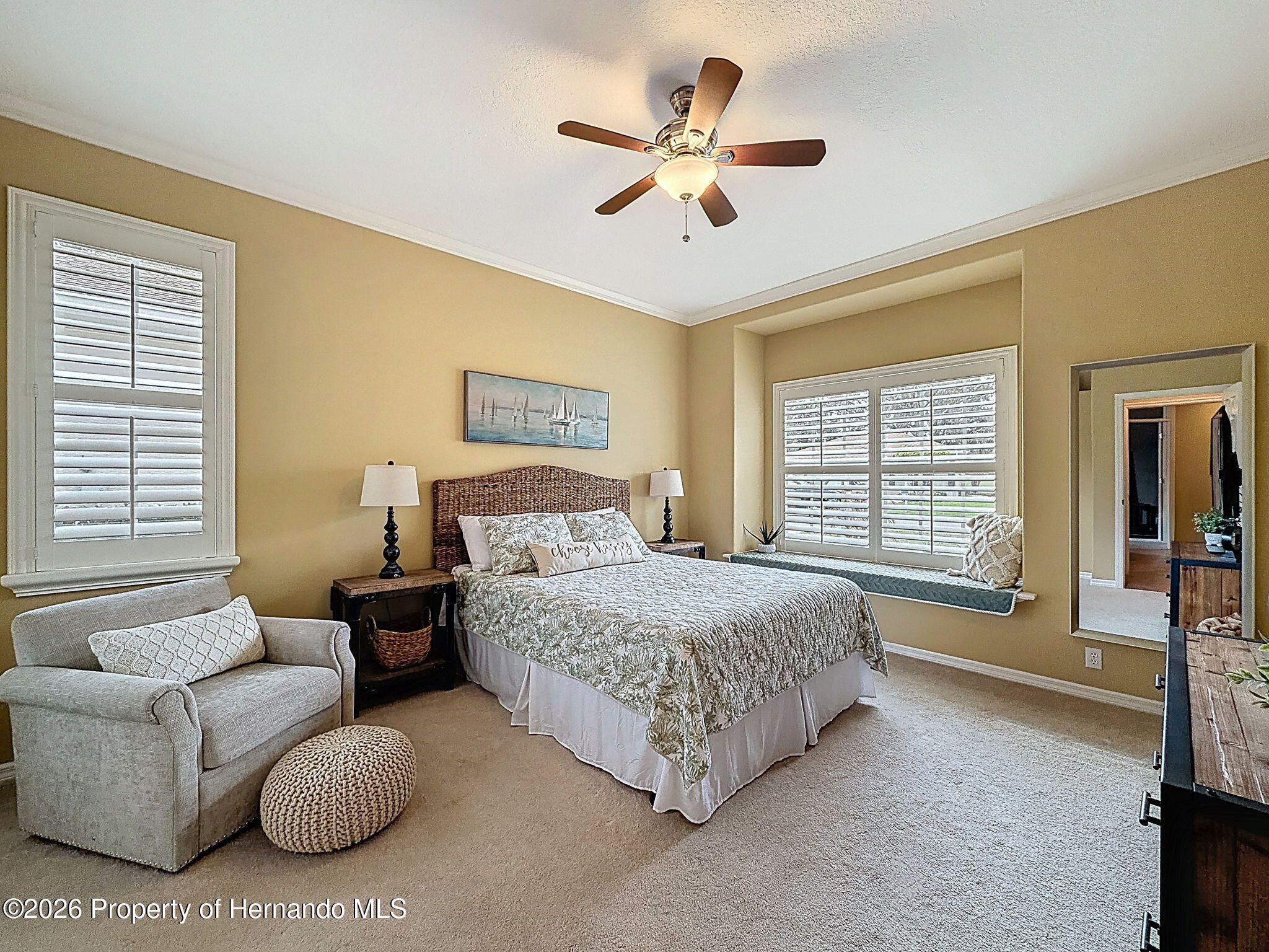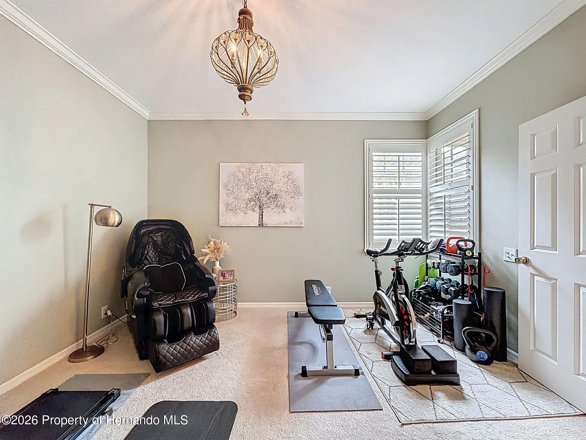 Welcome to the highly desirable gated golf course community of Silverthorn Country Club, where maintenance-free living meets comfort and style. This beautifully maintained 2 bedroom + den (or optional 3rd bedroom), 2-bathroom home offers a desirable split floor plan designed for both privacy and functionality. Step inside to an open layout featuring a spacious great room with attractive luxury vinyl plank flooring, lofty ceilings, a decorative plant shelf, and views of the lanai. Elegant crown molding and beautiful wood plantation shutters add charm and sophistication throughout the home. The kitchen is both functional and inviting, highlighting timeless finishes including granite countertops, a tumbled tile backsplash, stainless steel appliances, generous cabinet space, a breakfast bar, pantry, and a cozy breakfast nook--perfect for casual dining or entertaining. Just off the kitchen is a spacious laundry room with a convenient butler-style pantry area, ideal for serving, folding laundry, and additional storage. The primary suite features two walk-in closets, a relaxing soaking tub, separate shower, and a private commode area. The split bedroom plan offers comfort and privacy for guests, with the second bedroom located near its own full bathroom. The versatile den can easily serve as a home office, hobby room, or additional bedroom. Enjoy relaxing evenings on the screened lanai featuring privacy screens and a soothing hot tub--an ideal space to unwind or entertain while enjoying the Florida lifestyle. Additional highlights include a two-car-attached garage and low-maintenance living. Residents of Silverthorn enjoy outstanding community amenities including a clubhouse, pool, fitness center, tennis and pickleball courts, state of the art fitness equipment, library, arts/crafts/card room and more. The beautiful Golf course and Country club are available for use for private pay. Maintenance includes exterior paint, lawn mowing & spraying, irrigation sprinkler maintenance, and hedge trimming. HOA includes cable, internet, 24 hr. gate CAM and use of community amenities. Silverthorn is conveniently located near shopping, dining, and the Suncoast Parkway for easy access to Tampa.