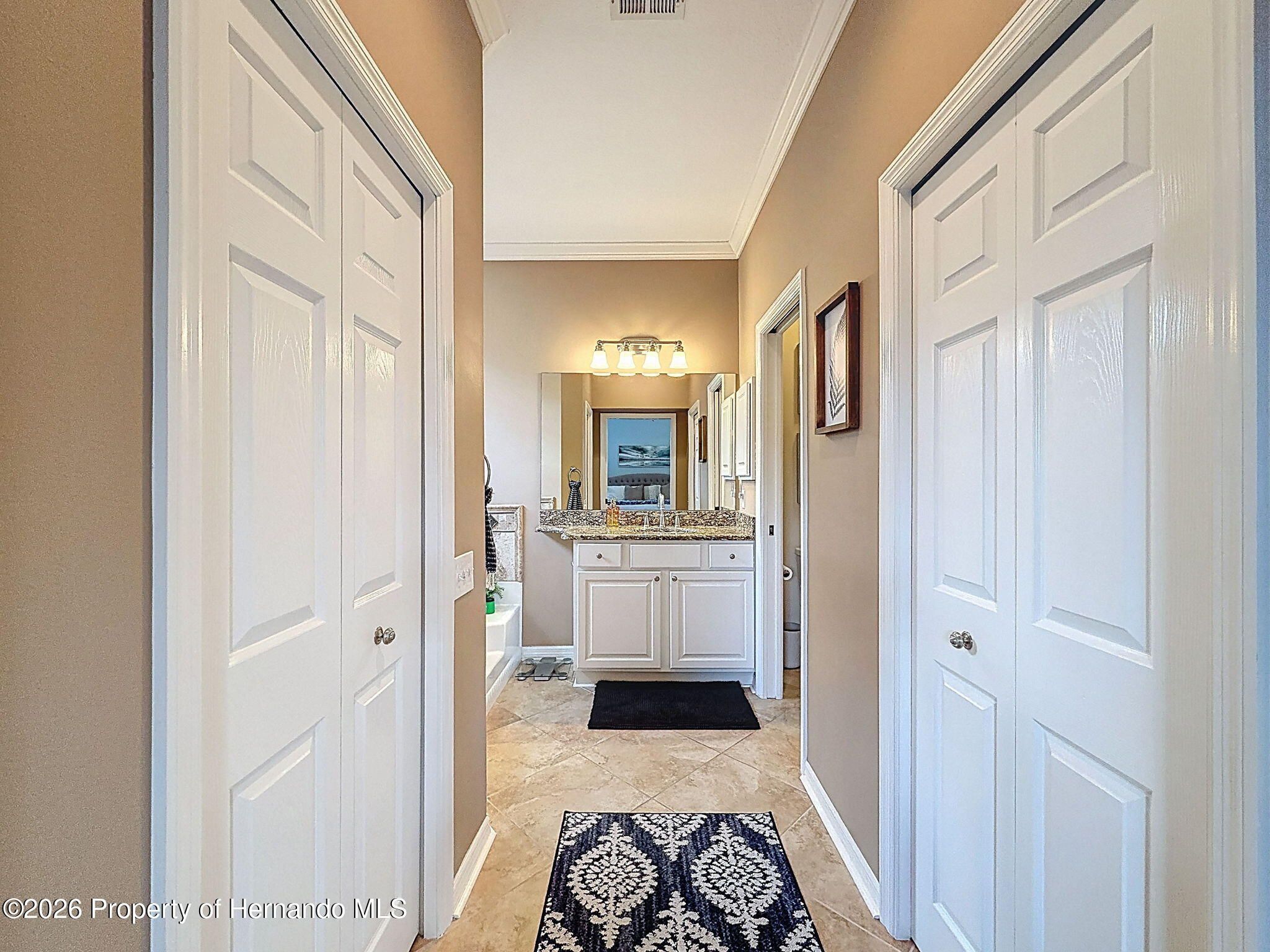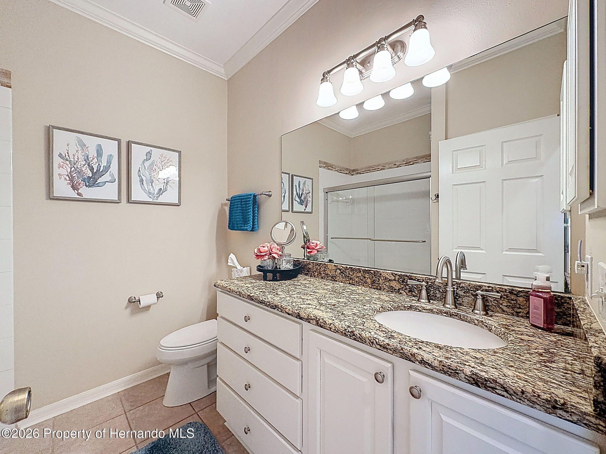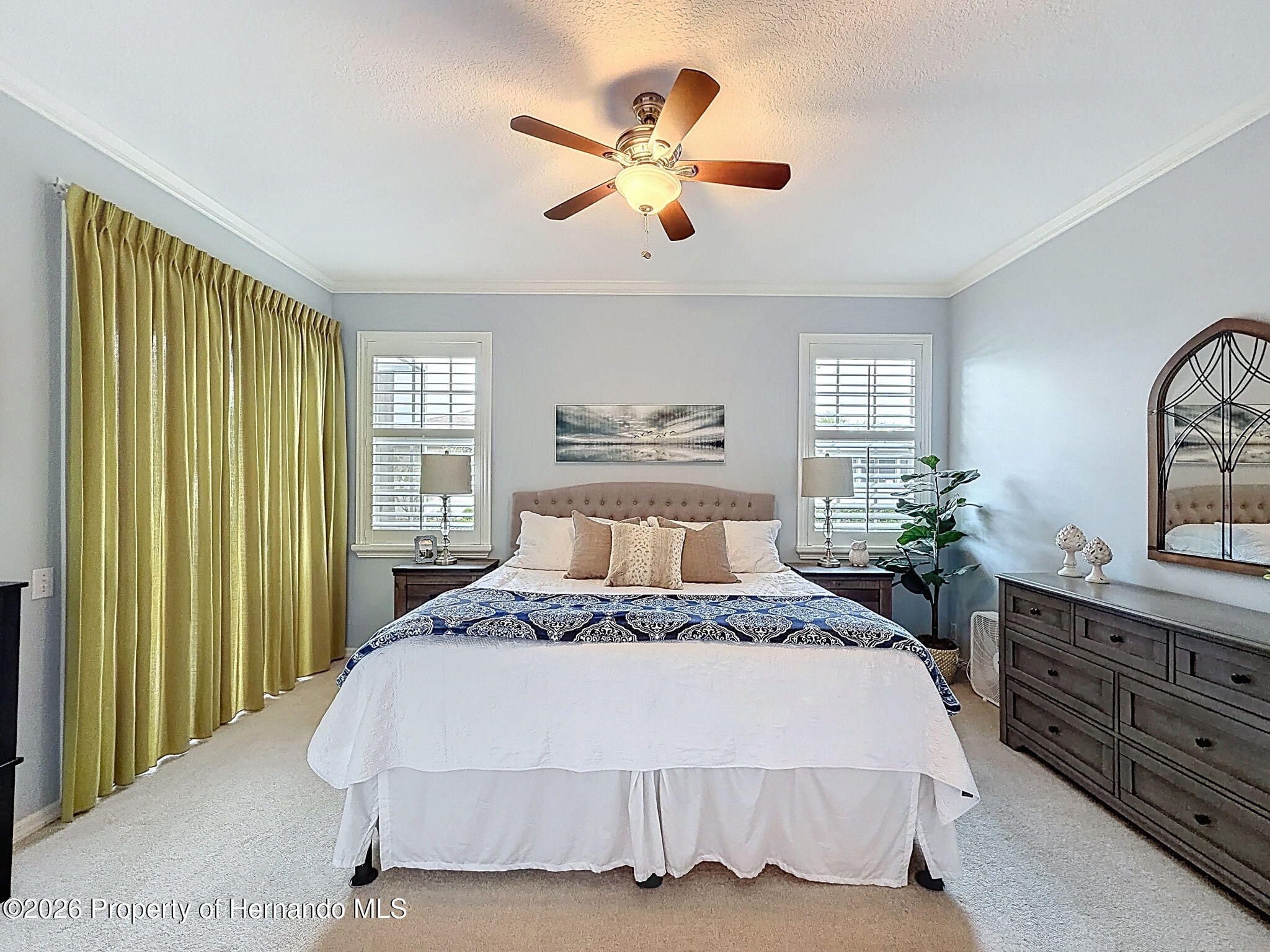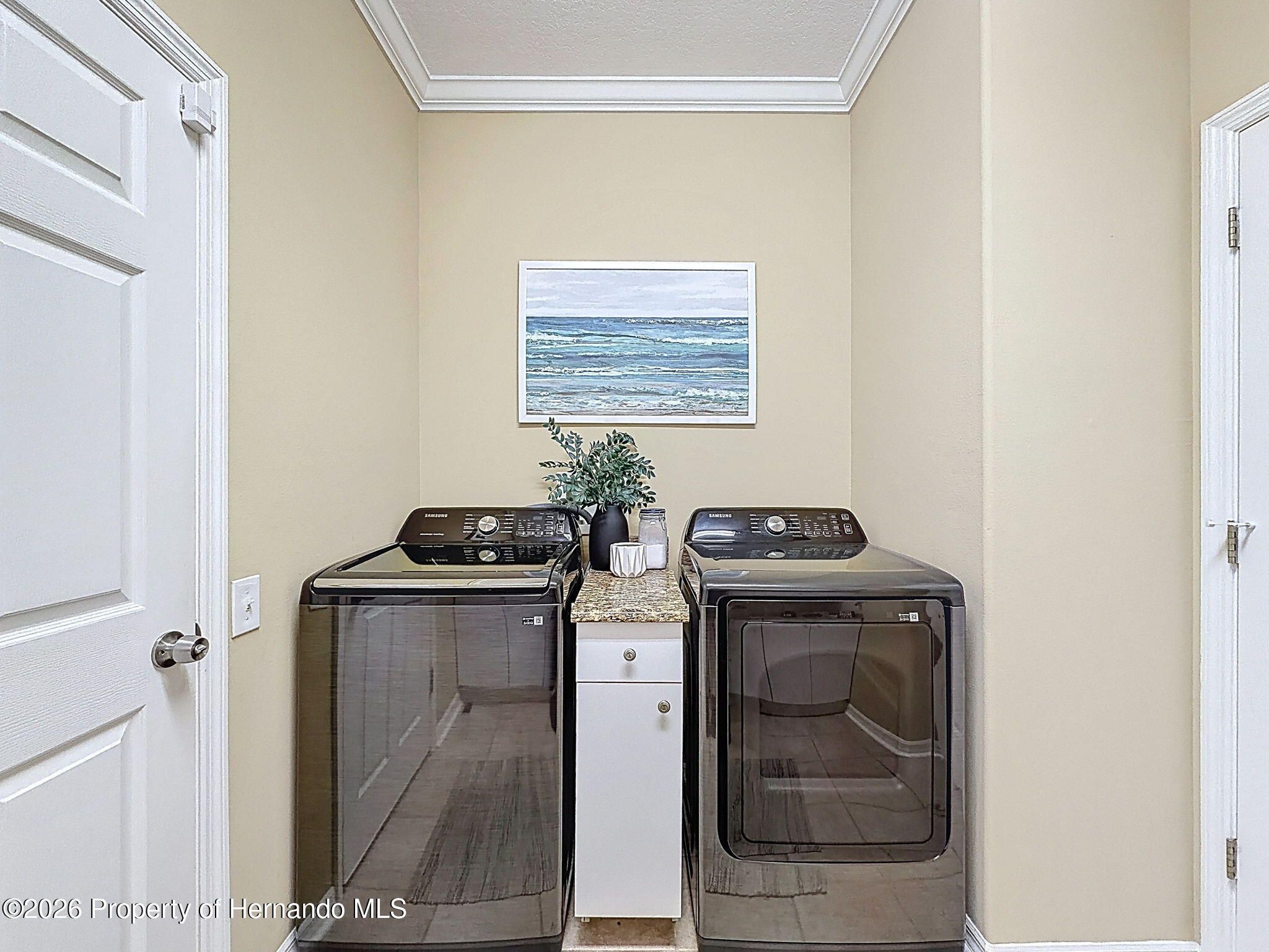 Welcome to the highly desirable gated golf course community of Silverthorn Country Club, where maintenance-free living meets comfort and style. This beautifully maintained 2 bedroom + den (or optional 3rd bedroom), 2-bathroom home offers a desirable split floor plan designed for both privacy and functionality. Step inside to an open layout featuring a spacious great room with attractive luxury vinyl plank flooring, lofty ceilings, a decorative plant shelf, and views of the lanai. Elegant crown molding and beautiful wood plantation shutters add charm and sophistication throughout the home. The kitchen is both functional and inviting, highlighting timeless finishes including granite countertops, a tumbled tile backsplash, stainless steel appliances, generous cabinet space, a breakfast bar, pantry, and a cozy breakfast nook--perfect for casual dining or entertaining. Just off the kitchen is a spacious laundry room with a convenient butler-style pantry area, ideal for serving, folding laundry, and additional storage. The primary suite features two walk-in closets, a relaxing soaking tub, separate shower, and a private commode area. The split bedroom plan offers comfort and privacy for guests, with the second bedroom located near its own full bathroom. The versatile den can easily serve as a home office, hobby room, or additional bedroom. Enjoy relaxing evenings on the screened lanai featuring privacy screens and a soothing hot tub--an ideal space to unwind or entertain while enjoying the Florida lifestyle. Additional highlights include a two-car-attached garage and low-maintenance living. Residents of Silverthorn enjoy outstanding community amenities including a clubhouse, pool, fitness center, tennis and pickleball courts, state of the art fitness equipment, library, arts/crafts/card room and more. The beautiful Golf course and Country club are available for use for private pay. Maintenance includes exterior paint, lawn mowing & spraying, irrigation sprinkler maintenance, and hedge trimming. HOA includes cable, internet, 24 hr. gate CAM and use of community amenities. Silverthorn is conveniently located near shopping, dining, and the Suncoast Parkway for easy access to Tampa.