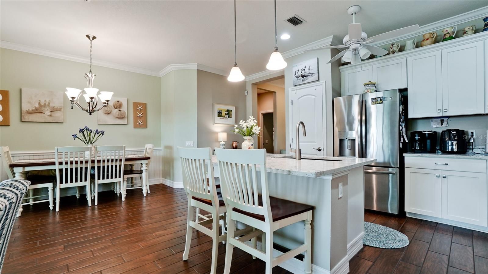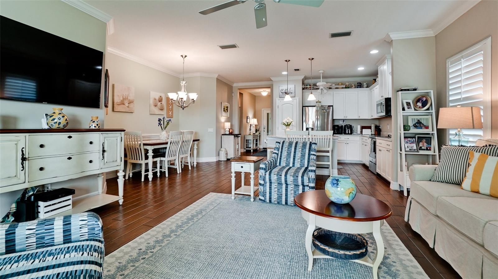 Award winning Leeds Platinum built villa. Upgrades include Porcelain plank flooring in all but baths and Sun Room. Crown Molding in Liv./Kit/Din., 5.5 in baseboard in all but baths and laundry room, Hurricane impact windows in Sun Rm, Hurricane shutters for remaining windows. Upgraded faucets throughout. Grade 2 cabinets including laundry room. Built in shelf for storage in laundry room. Quartz countertops, upgraded range, refrigerator, washer, dryer. A true Great Room/Open concept including the dimensions for kitchen, living room and dining area. Master BR has large walk-in closet and regular closet with double shelving. Guest bedroom has a walk-in closet with extra shelving. Upgraded decorative wall tile in tub and shower areas. 8 ceiling fans including bathrooms. Pull down stairs in garage and professional floor finish in garage. Shelves and storage racks in garage included. Extra electrical outlets in garage. Gated Entry. Pool refurfaced Oct. 2025. Security cameras at gated entrance and amenity center. Fitness center. Pickle board court and dog park are popular with residents. Must see to appreciate the pristine care during the original ownership.