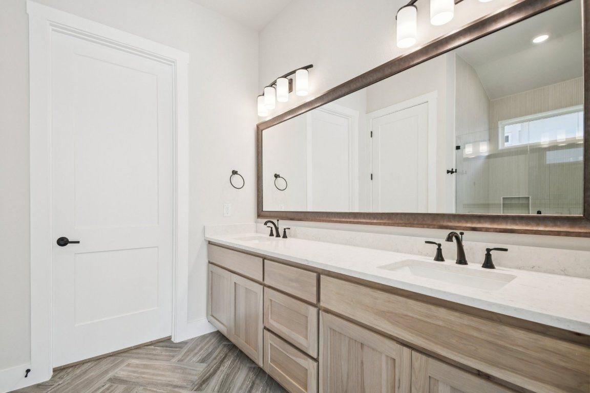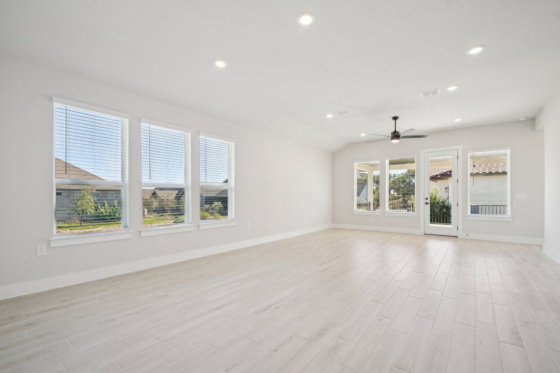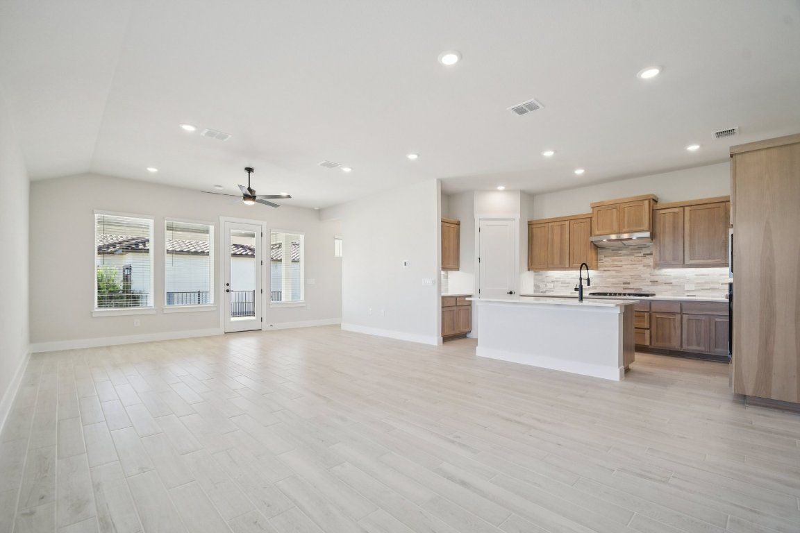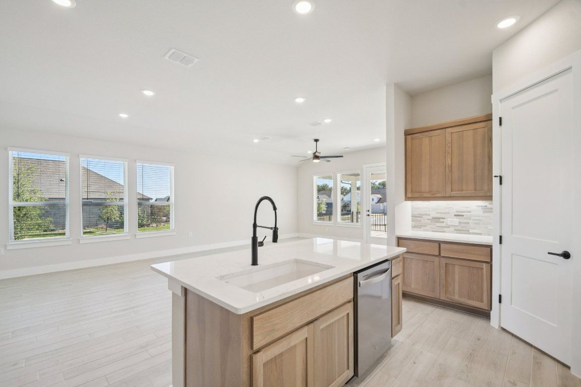 Emory plan with upgraded kitchen, quartz countertops, tile flooring throughout, enlarged covered patio, optional 3rd bedroom, optional cabinets with sink in utility room,