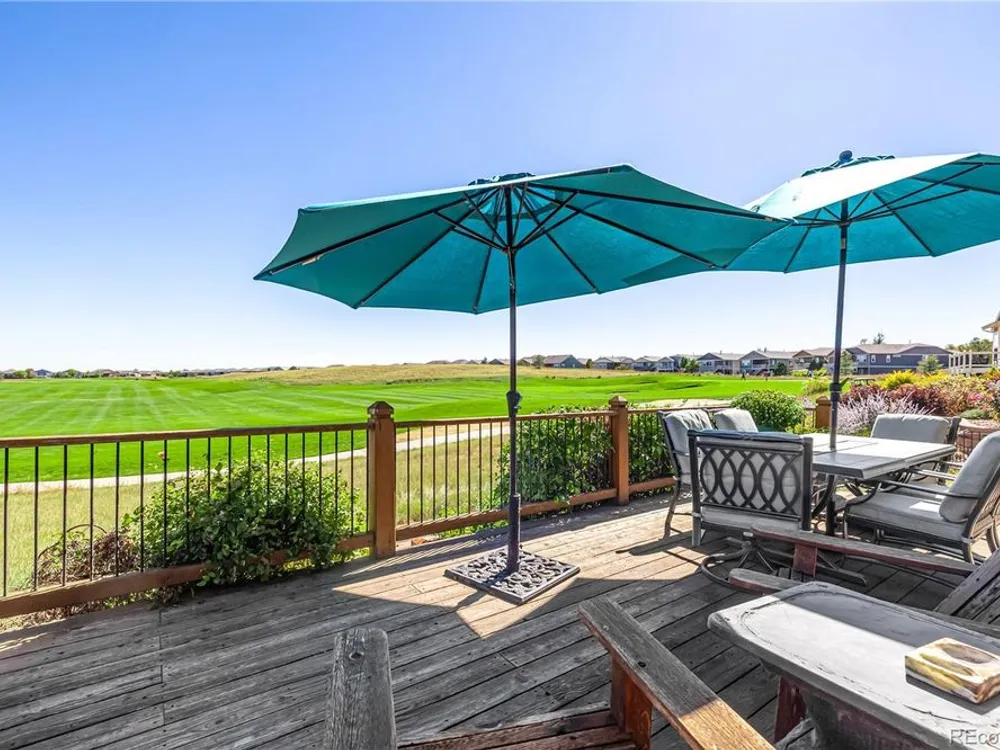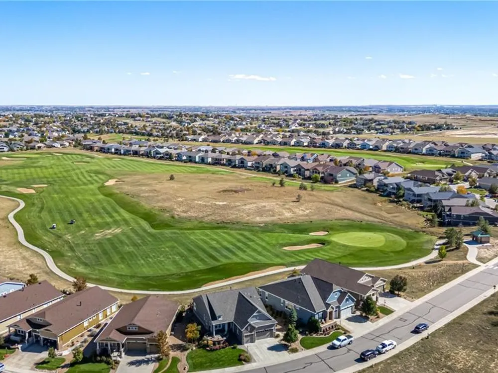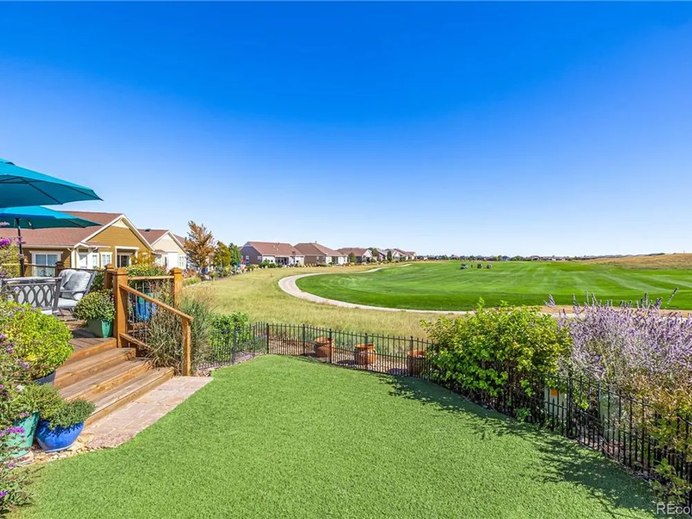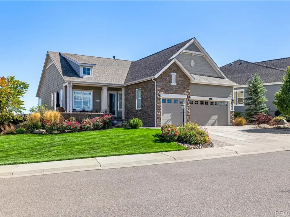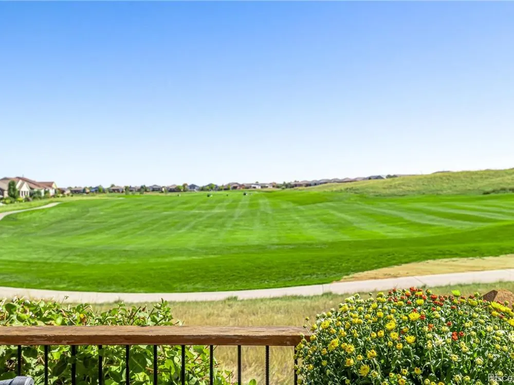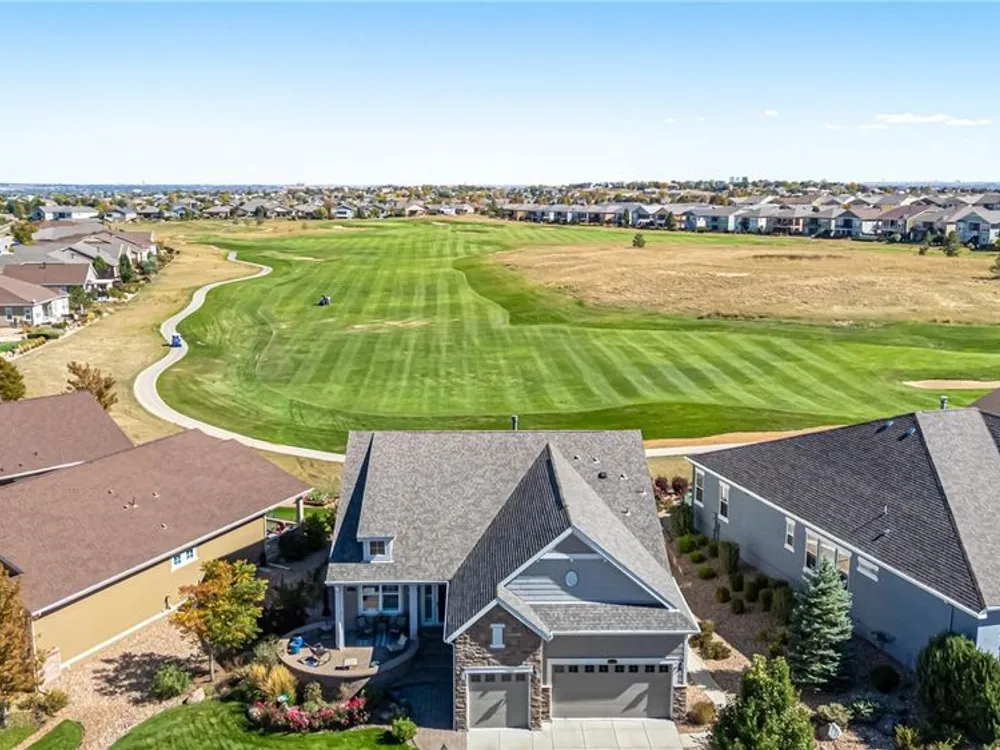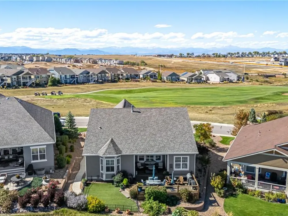 Welcome to your beautifully maintained home on a rare lot in sought after 55+ Heritage Todd Creek community! Nestled just off the 14th green, and across from the 15th fairway, the location offers a peaceful oasis off the back, and gorgeous views of the Rocky Mountains from a custom stone patio overlooking a beautifully manicured and professionally landscaped front yard. As you head inside, you are greeted by an abundance of natural light, an open floor plan, and hardwood floors. In the kitchen, you will find solid cherry cabinets accentuated w/ granite countertops, a bar-top island, upgraded gas range, upgraded dishwasher, dry bar, and butler’s pantry. The spacious breakfast nook is ideal for everyday dining and allows access to a large redwood deck overlooking the 14th fairway. Safely tucked back away from stray balls, this lot creates a perfect space to entertain, relax after a long day, or just take in the peace. Professionally landscaped backyard with low maintenance astroturf, and two raised gardens. As you head inside, warm your toes by the fireplace in your open living room. Off the primary bedroom, you will find a spacious bathroom with large shower, attached laundry, walk-in closet, and direct access to deck. In addition, the main level features plantation shutters, guest bedroom, dining room, and extra room that could be used as an office or 4th bedroom. As you head downstairs, you are greeted by a warm space, perfect for entertaining. It features 9-foot ceilings, guest room, bathroom with jacuzzi, an inviting family/game room w/ large fireplace & stone surround, a custom, built-in wet bar w/ beer tap, bar top w/ extra seating, tons of storage, and flex space for a workout or movie room. Heritage Todd Creek offers resort-style amenities, and a vibrant community that enhances everyday life. This home isn't just a residence—it's a lifestyle! Play some golf, relax by one of the two pools, enjoy a game of pickleball w/ friends, and soak in all that HTC offers!