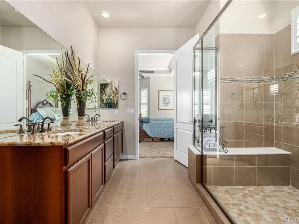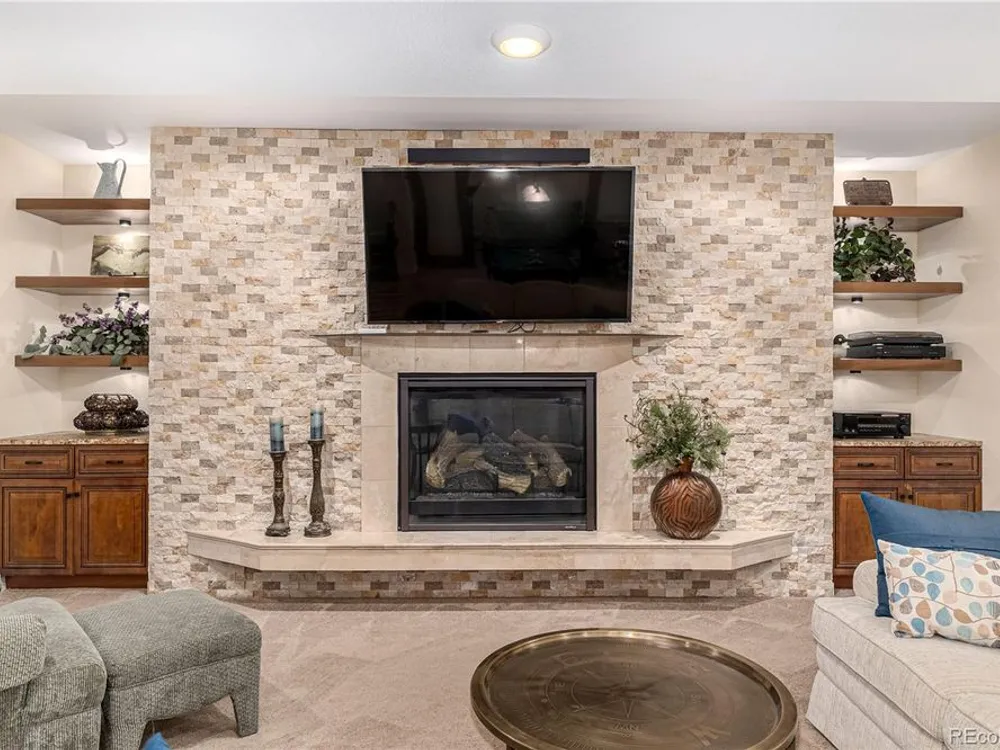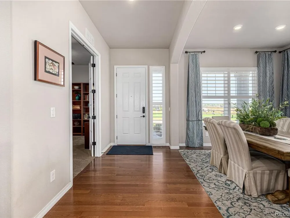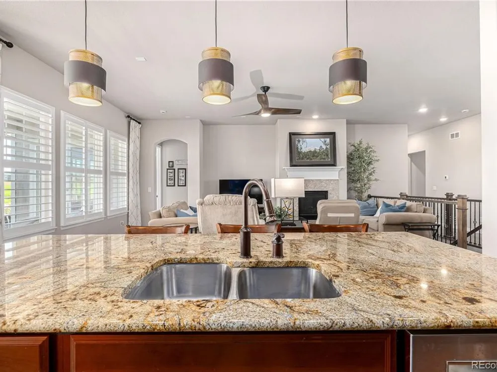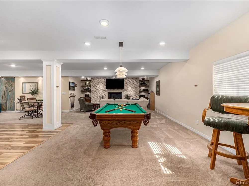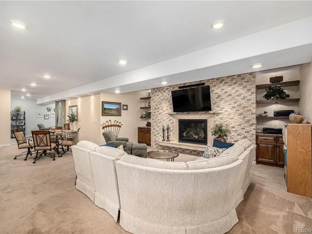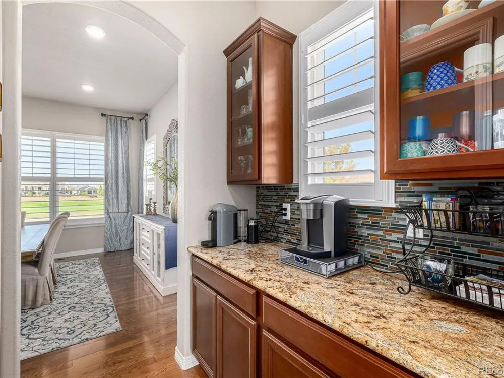 Welcome to your beautifully maintained home on a rare lot in sought after 55+ Heritage Todd Creek community! Nestled just off the 14th green, and across from the 15th fairway, the location offers a peaceful oasis off the back, and gorgeous views of the Rocky Mountains from a custom stone patio overlooking a beautifully manicured and professionally landscaped front yard. As you head inside, you are greeted by an abundance of natural light, an open floor plan, and hardwood floors. In the kitchen, you will find solid cherry cabinets accentuated w/ granite countertops, a bar-top island, upgraded gas range, upgraded dishwasher, dry bar, and butler’s pantry. The spacious breakfast nook is ideal for everyday dining and allows access to a large redwood deck overlooking the 14th fairway. Safely tucked back away from stray balls, this lot creates a perfect space to entertain, relax after a long day, or just take in the peace. Professionally landscaped backyard with low maintenance astroturf, and two raised gardens. As you head inside, warm your toes by the fireplace in your open living room. Off the primary bedroom, you will find a spacious bathroom with large shower, attached laundry, walk-in closet, and direct access to deck. In addition, the main level features plantation shutters, guest bedroom, dining room, and extra room that could be used as an office or 4th bedroom. As you head downstairs, you are greeted by a warm space, perfect for entertaining. It features 9-foot ceilings, guest room, bathroom with jacuzzi, an inviting family/game room w/ large fireplace & stone surround, a custom, built-in wet bar w/ beer tap, bar top w/ extra seating, tons of storage, and flex space for a workout or movie room. Heritage Todd Creek offers resort-style amenities, and a vibrant community that enhances everyday life. This home isn't just a residence—it's a lifestyle! Play some golf, relax by one of the two pools, enjoy a game of pickleball w/ friends, and soak in all that HTC offers!