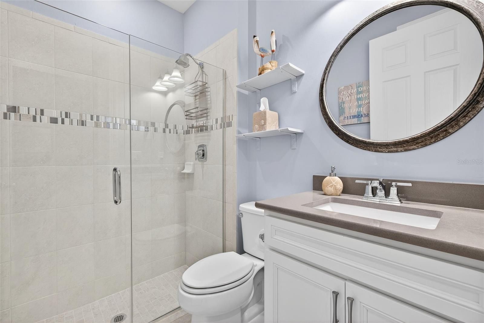 Turnkey and move-in ready, this beautifully upgraded home is located on a premium lake view lot in the desirable 55+ Del Webb community of Cypress Falls at the Woodlands. Built in 2020, the residence includes a model upgrades package valued at over $70,000, along with substantial post-construction enhancements, offering comfort, convenience, and peace of mind. The thoughtfully designed floor plan features 2 bedrooms, 2 bathrooms, and a den/office, plus an extended garage with additional space for storage or golf cart parking, finished with an epoxy-coated floor. Exterior highlights include extensive front and rear landscaping with curbing, a screened front entry, and tranquil lake views. Inside, the home is finished with tile flooring throughout, 8’ interior doors, high baseboards, and extensive crown molding. The open living and dining areas are enhanced by a custom lighting package and sliding glass pocket doors, creating seamless indoor-outdoor flow. The kitchen is both functional and stylish, offering stainless steel appliances, quartz countertops, an expanded island with a large premium kitchen sink, pull-out cabinet drawers, glass tile backsplash, under-cabinet lighting, and pendant lighting over the island, ideal for entertaining or everyday living. The primary bedroom enjoys peaceful lake views and features a tray ceiling with crown molding and an extended walk-in closet with built-in shelving. The bath includes granite countertops and a walk-in shower. A comfortable guest bedroom and full guest bath with a walk-in shower and quartz countertop provide privacy for visitors. Additional features include custom interior paint, plantation shutters, smart home lighting with Alexa, keyless entry for the front door and garage, and a smart thermostat. The laundry room includes custom cabinetry for added storage. Outdoor living is highlighted by the extended screened lanai, complete with sunshades and no-see-um screens, offering the perfect setting to relax and enjoy Florida living. In addition to the extensive builder upgrades, the home also includes over $20,000 in hurricane protection, featuring a combination of motorized and manual roll-down shutters, accordion shutters, and impact-resistant Lexan panels, providing comprehensive storm protection and peace of mind. Residents of Cypress Falls at the Woodlands enjoy an impressive amenity center and an active community environment, including a full-time lifestyle director, state-of-the-art fitness center, resort-style pool, resistance pool, whirlpool, pickleball and tennis courts, bocce ball, horseshoe pits, billiards and card rooms, arts and crafts studio, grand social hall with catering kitchen, library, café with wireless internet, dog park, and resident garden plots, along with a full calendar of clubs and activities. This turnkey home presents an outstanding opportunity to enjoy quality, upgrades, and lifestyle in one of the area’s most sought-after 55+ communities.