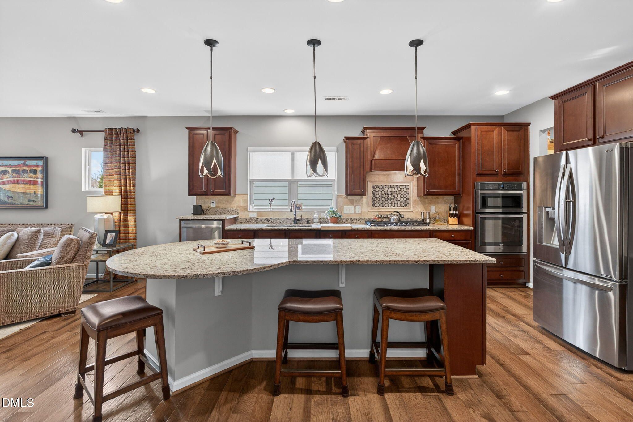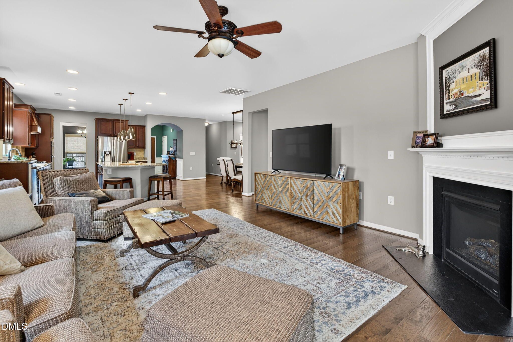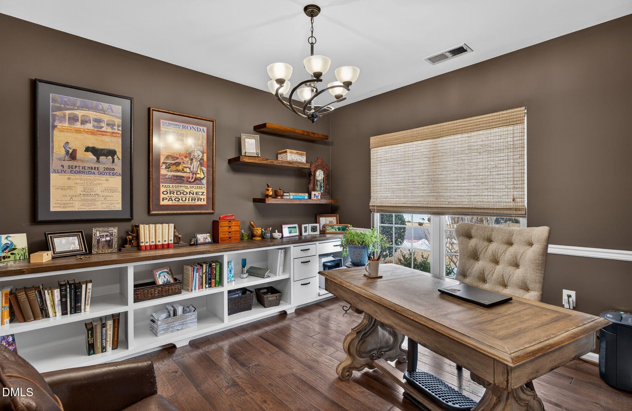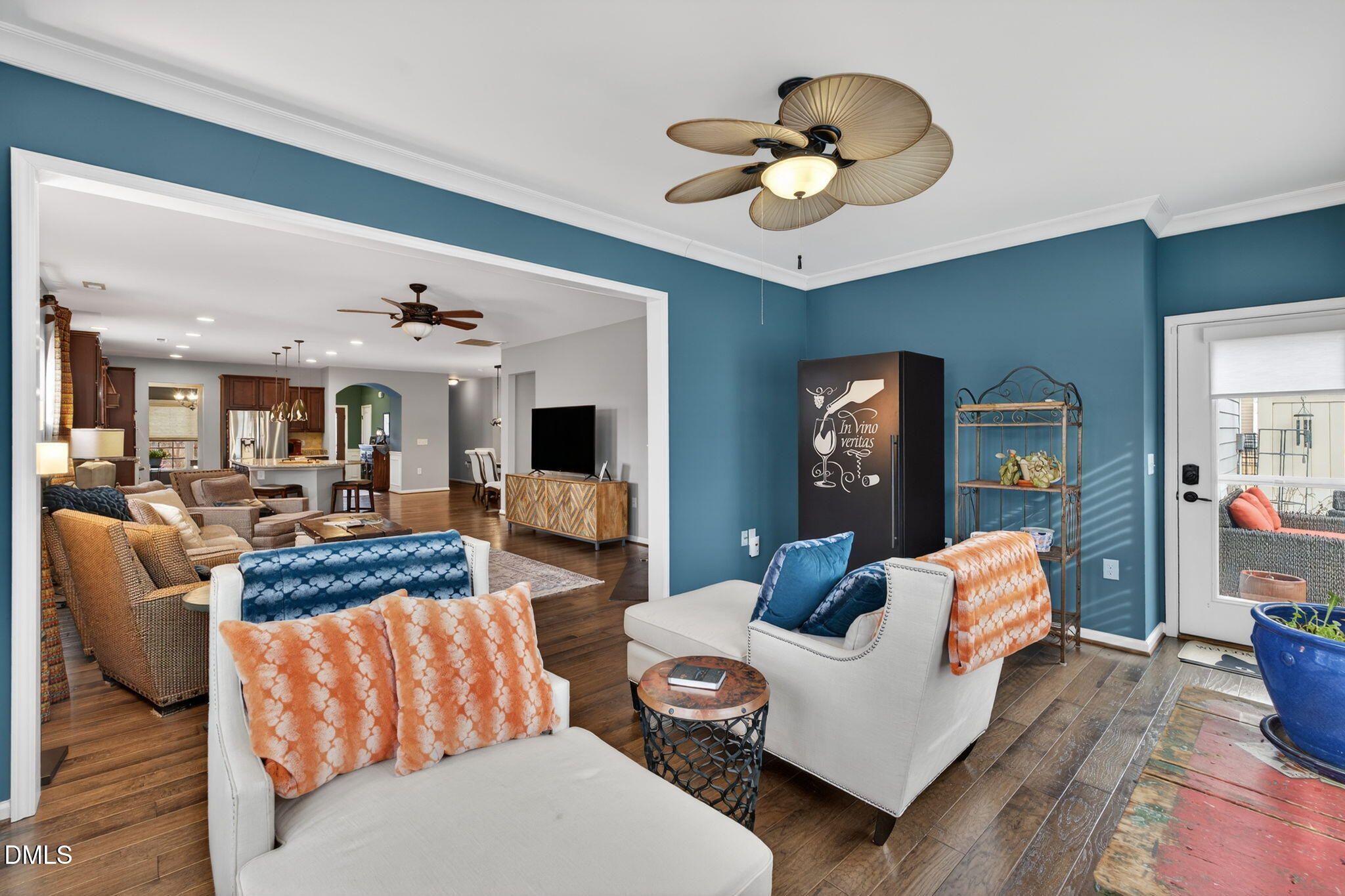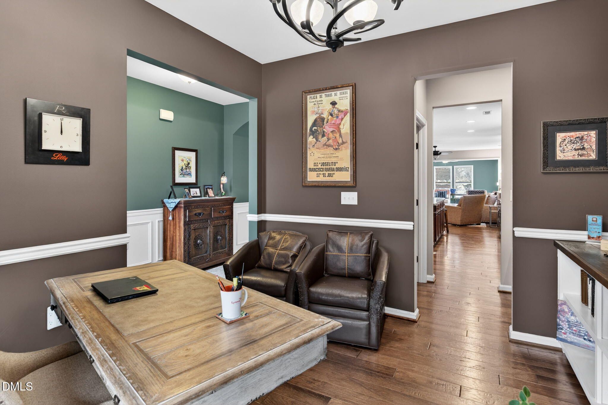 Beautifully refreshed and thoughtfully upgraded, this Martin Ray floor plan in Carolina Arbors offers refined 55+ living with comfort and style woven throughout. This spacious 3-bedroom, 2-bath ranch features brand new hard flooring throughout and fresh interior paint that creates a bright, cohesive feel from room to room. The sunroom is enhanced with classic plantation shutters, while custom shades add comfort and privacy throughout the rest of the home. Step outside onto the private patio and relax beneath the awning, recently serviced and ready to provide effortless shade. The kitchen is the heart of the home and is exceptionally well-appointed, featuring a large center island, granite countertops, rich wood cabinetry, stainless steel appliances, and a wall oven with built-in microwave. A wider walkway and raised dishwasher were thoughtfully designed for ease of use and aging in place. The adjoining butler's pantry includes added shelving for excellent organization and a small wine refrigerator, making entertaining both seamless and stylish. A dedicated office features custom built-ins, offering both function and polish. The primary suite includes a professionally designed custom closet system by Closets by Design, maximizing storage with style. Select upgraded light fixtures throughout the home add a fresh, modern touch. Additional practical enhancements include an EV charger in the garage and an invisible fence system for pets. Located just a short distance from the clubhouse and pool, and convenient to Brier Creek shopping and dining, residents enjoy resort-style amenities including a fitness center, indoor heated pool and spa, outdoor social pool, tennis, pickleball and bocce courts, croquet lawn, trails, arts and crafts studio, demonstration kitchen, ballroom, community garden, and more.